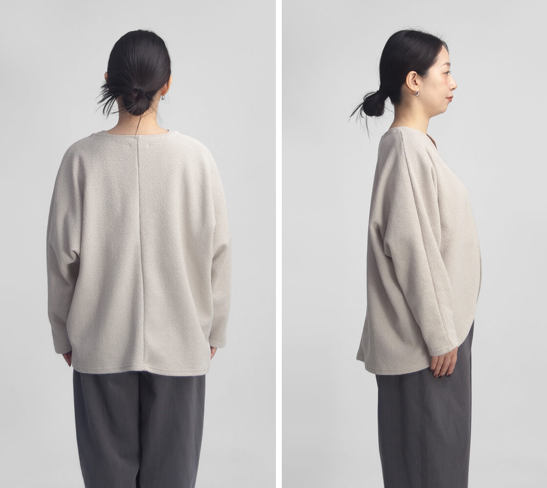 全体的にゆったりとしたバルーンシルエットで、体のラインを拾いにくくリラックス感のある着心地。肩から身頃にかけて一体感のあるドルマンスリーブ仕様で、肩まわりや身幅にも程よくゆとりを持たせており、締め付け感がなく、長時間の着用でも快適に過ごせます。同じ生地を使用したプルオーバーベスト(別売り)と合わせたアンサンブルスタイルもおすすめ。統一感のあるコーディネートが簡単に完成し、より洗練された着こなしを楽しめます。単品使いはもちろん、セットで揃えることで着回し力がさらに高まる一着です。