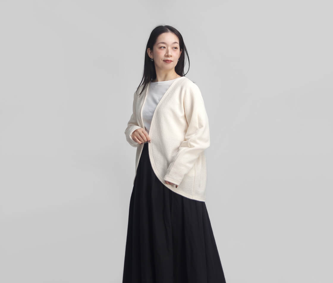 通勤やお出かけ、リラックスした休日まで幅広いシーンで活躍してくれそうなワイドなカーディガン。室内外の温度差があるシーンなどでもさっと羽織れて1年の中でも長く着用できる一枚となっています。