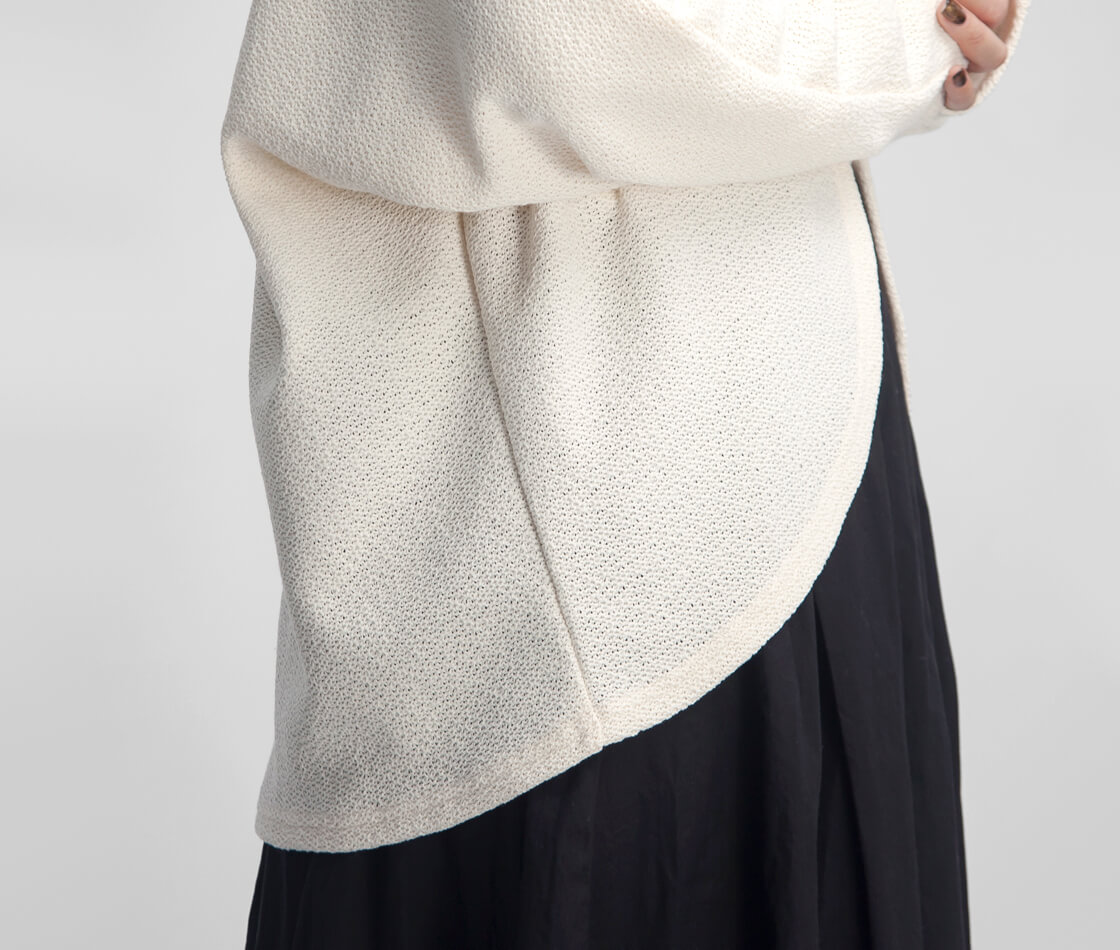 全体的にゆったりとしたバルーンシルエットで、体のラインを拾いにくくリラックス感のある着心地。肩から身頃にかけて一体感のあるドルマンスリーブ仕様で、肩まわりや身幅にも程よくゆとりを持たせており、締め付け感がなく、長時間の着用でも快適に過ごせます。 ![]() 汗をかいてもさらりと快適、素肌にもやさしい梨地編み素材。