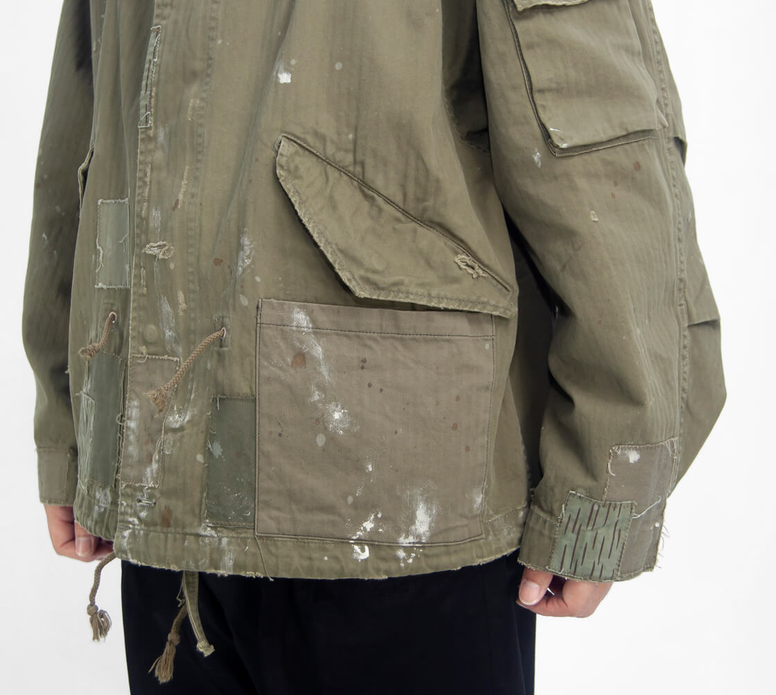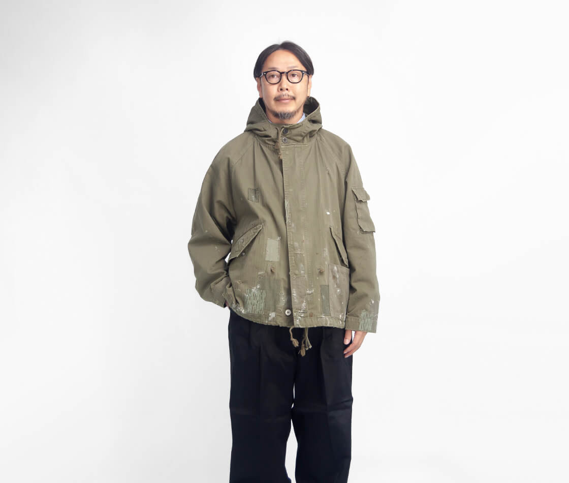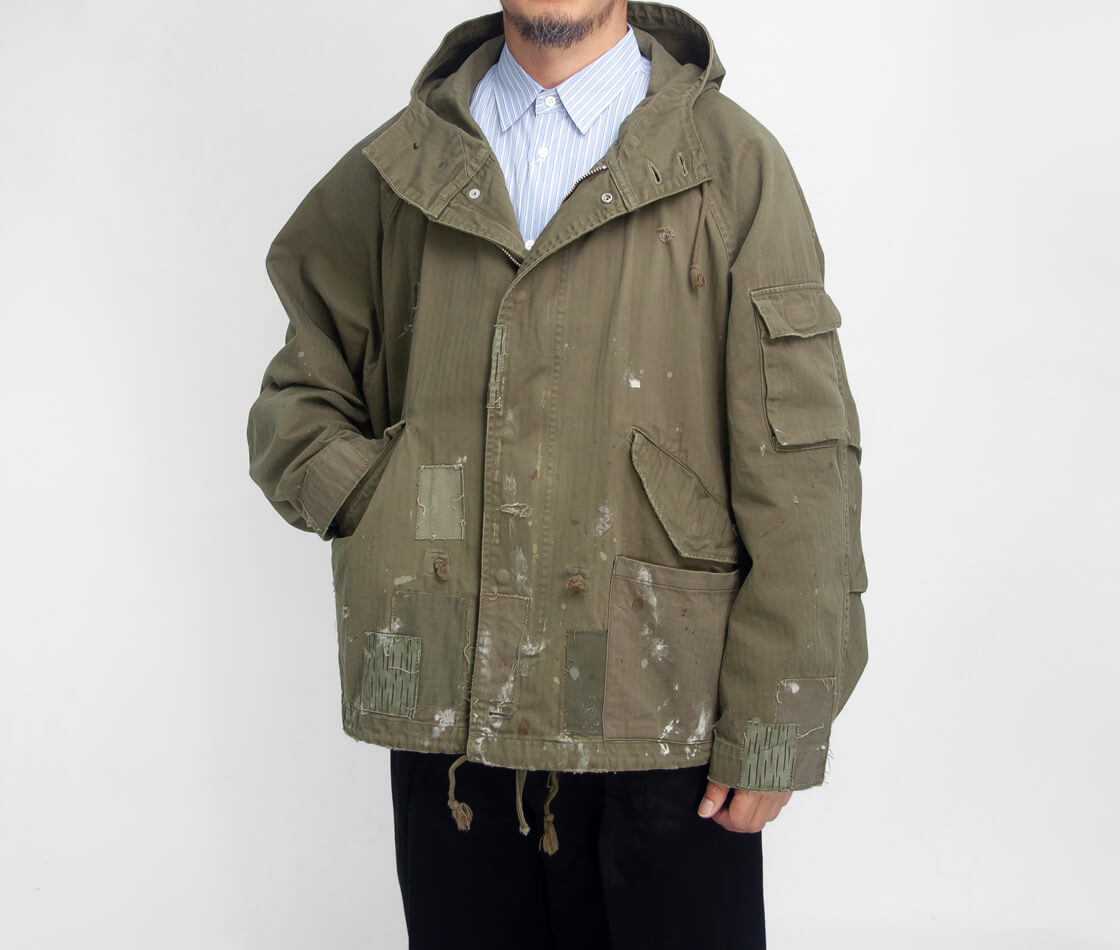 H.UNITから、米軍M-51モッズコートをショート丈に再構築した「HBT hooded jacket」をご紹介。 クラシックな意匠を現代的バランスで再解釈し、ダメージや当て布、ペンキ加工を一点一点手作業で施した特別な一着です。 ゆったりとした身幅に大きめのフード、二重前立てやドローコードなどM-51のディテールを忠実に再現。 袖のボタンアジャスターや後付けポケットがアクセントとなり、抜け感のあるシルエットに。 生地には米軍ヘリンボーンをモチーフにした中肉厚のコットンヘリンボーンを採用。 耐久性と柔らかさを兼ね備え、通年で着用可能です。 リアルなエイジングを追求した唯一無二の風合いは、児島の技術とデザイナー松田氏の感性が融合したH.UNITならではの仕上がりです。