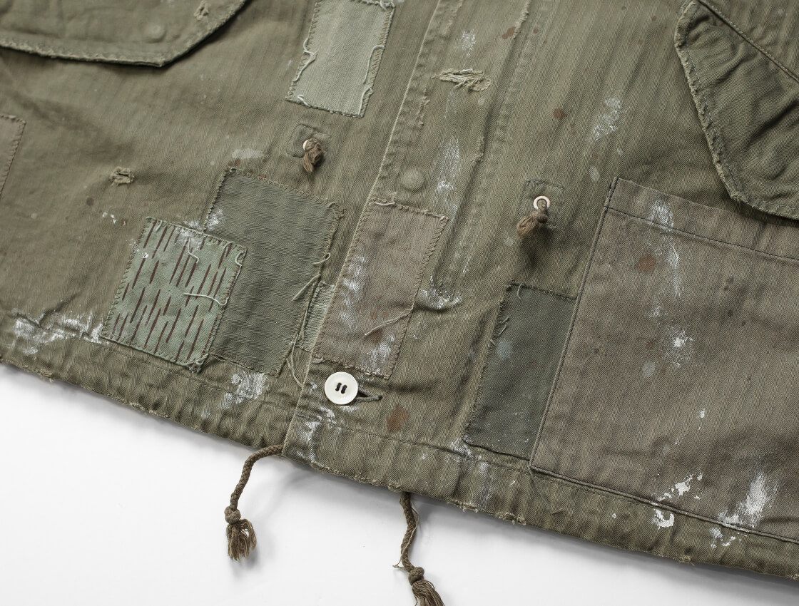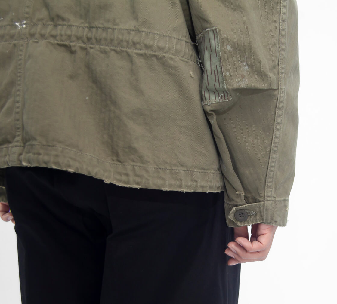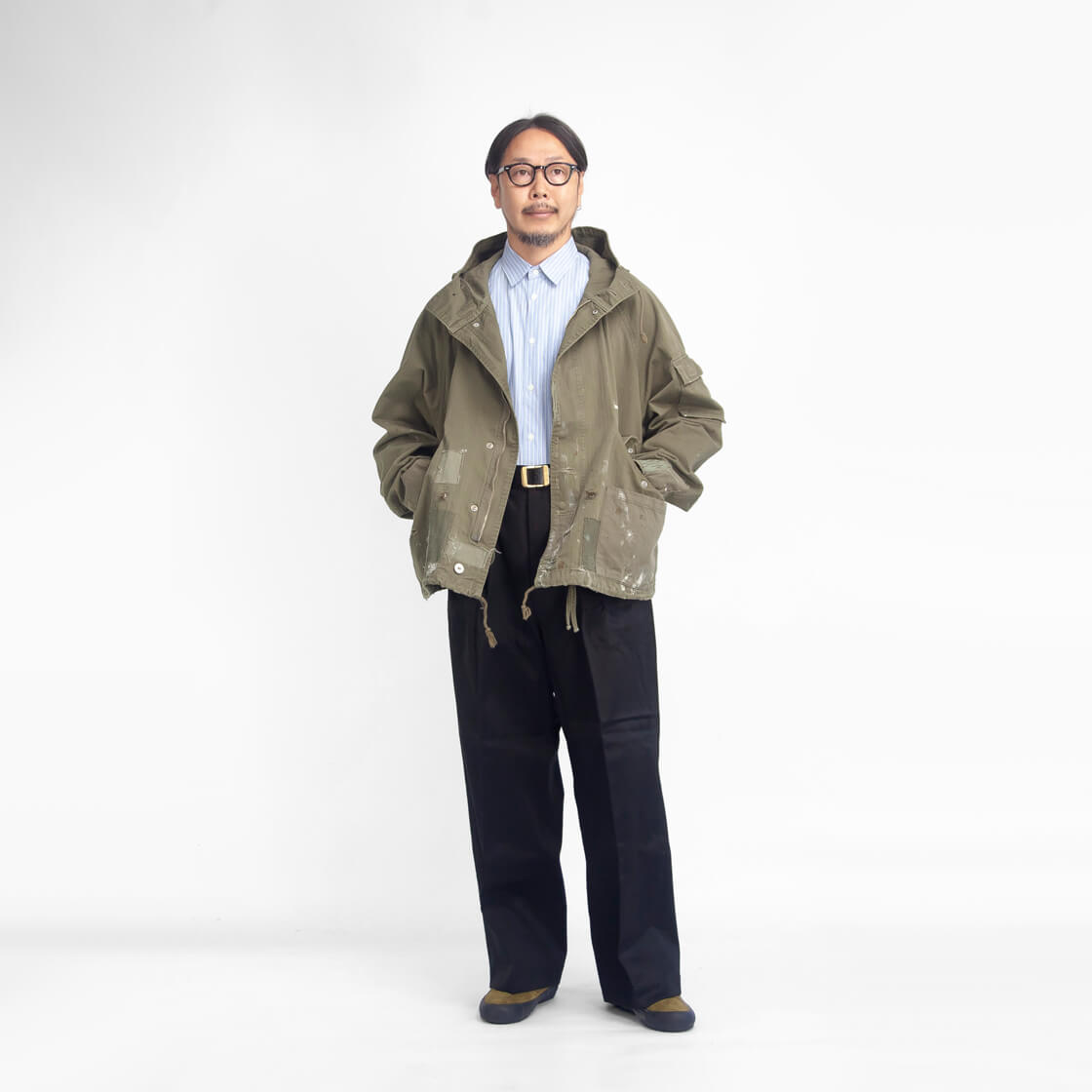 ![]() H.UNIT - HBT hooded jacket(Customize) ![]() 米軍M-51モッズコートをショート丈にアレンジ、一点一点手作業に加工を施し気が遠くなるほど時間をかけて製作されたスペシャルな一着。 ![]() H.UNIT(エイチユニット) 岡山県倉敷市児島と言えば、世界的にも有名なジーンズの産地。そこに拠を構え、" 児島らしく、児島らしからぬ"をテーマとしてプロダクトを展開しているH.UNIT。独自の観点により、ヴィンテージらしさと現代らしさを融合させたアイテムを"倉敷児島"特有の縫製、加工技術、手作業を織り交ぜカスタマイズさせた服作りを提案しています。 ![]() たっぷり身幅のM-51をショート丈に再構築。リアルな経年表情を纏うジャケット。 アメリカ軍の名作"M-51モッズコート"をショート丈に再構築。クラシックな意匠を現代のバランスで再解釈した、H.UNITならではの一着がこちら「HBT hooded jacket」。ただ短くしただけではありません。特筆すべきは、一点一点手作業で施されたカスタマイズ。ダメージ加工、当て布、ペンキの汚し…。気の遠くなるほどの時間をかけて、長年着込んだようなリアルな表情へ。ボタンの一部が異なる色なのは、「取れたボタンを代用して付け直した」というストーリーを感じさせる演出。白いペンキには水性塗料を使用し、着込むほどに薄れていく―そんな経年変化も楽しめる仕様になっているのです。デザインはM-51のディテールを踏襲。大きめのフード、ジッパー+スナップの二重前立て、ウエストと裾のドローコードもしっかり完備。フロントには大型フラップポケット、さらに左側に後付けのポケットをプラスして遊び心を。袖口はボタンアジャスターで幅を調整可能。アームホールもゆったり、腕回りもたっぷり。ジャケットの上からでも難なく羽織れる、余裕のあるシルエットです。 ![]() 当て布やダメージ・ペンキ加工、一点一点手作業で施されたカスタマイズです。 ![]() 米軍ヘリンボーン生地をモチーフに製作された中肉厚のコットンヘリンボーン生地。 使用している生地は、アメリカ軍で用いられていたヘリンボーン生地をイメージして製作された中肉厚のコットンヘリンボーン生地。見た目が開いた魚の骨に似ていることからついたヘリンボーンは「右上がりの綾織り(右綾)」と「左上がりの綾織り(左綾)」を交互に組み合わせたV字状の織り柄が特徴。右綾の丈夫さと、左綾の柔らかさの両方を兼ね備えた織り組織なのです。丈夫さと動きやすさを求められる軍服で採用されていたのも納得かと。厚手すぎず薄手すぎず、通年で着用しやすい生地厚になります。 ![]() ![]() 身長170cm、体重62kgの男性が2サイズ着用。