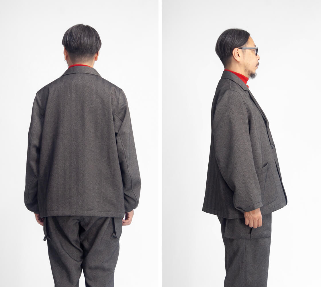 袖口を留めると丸みのあるフォルムになり、ラペルジャケットの端正さとリラックス感が融合。