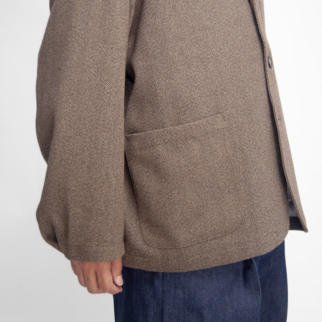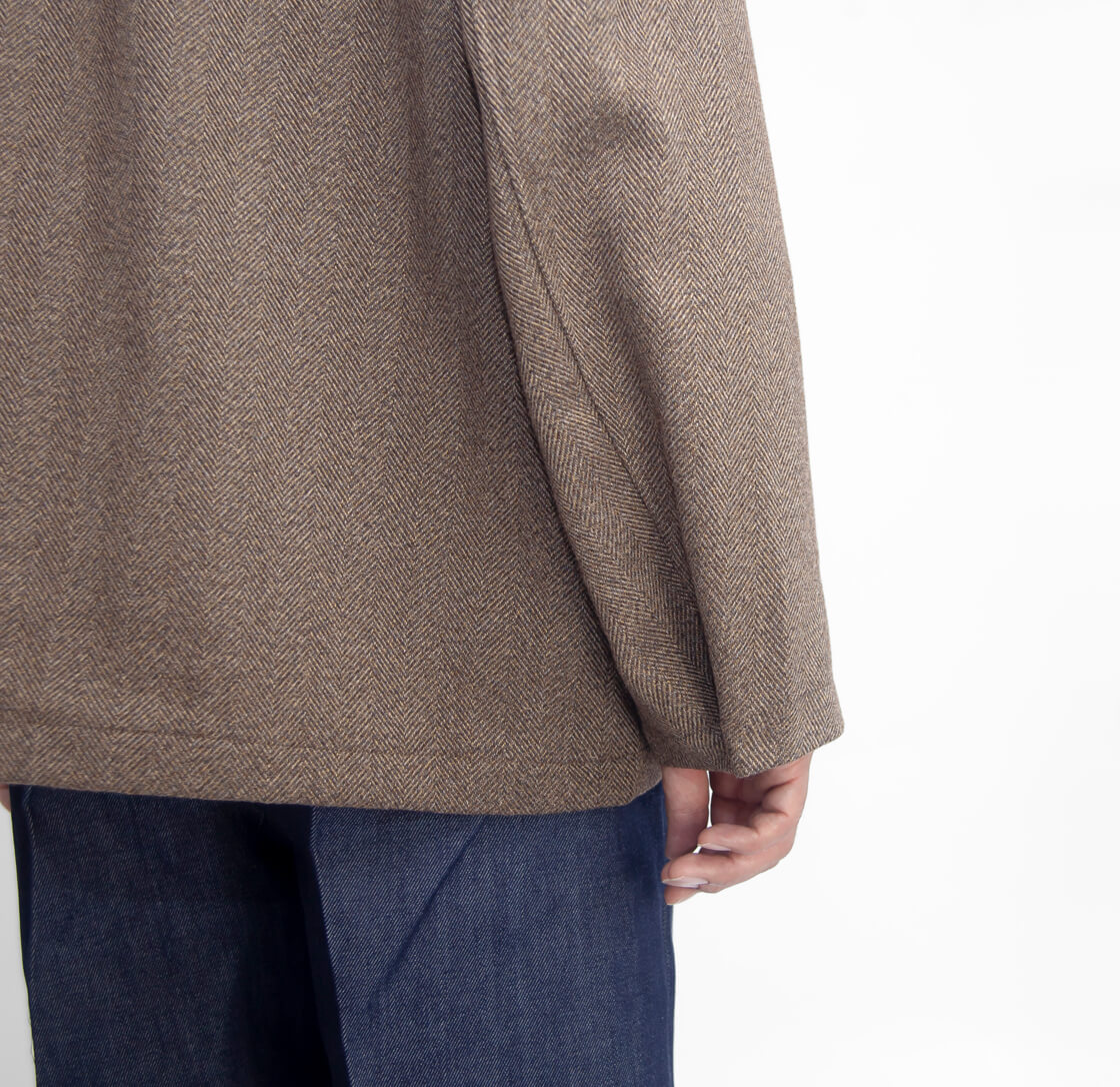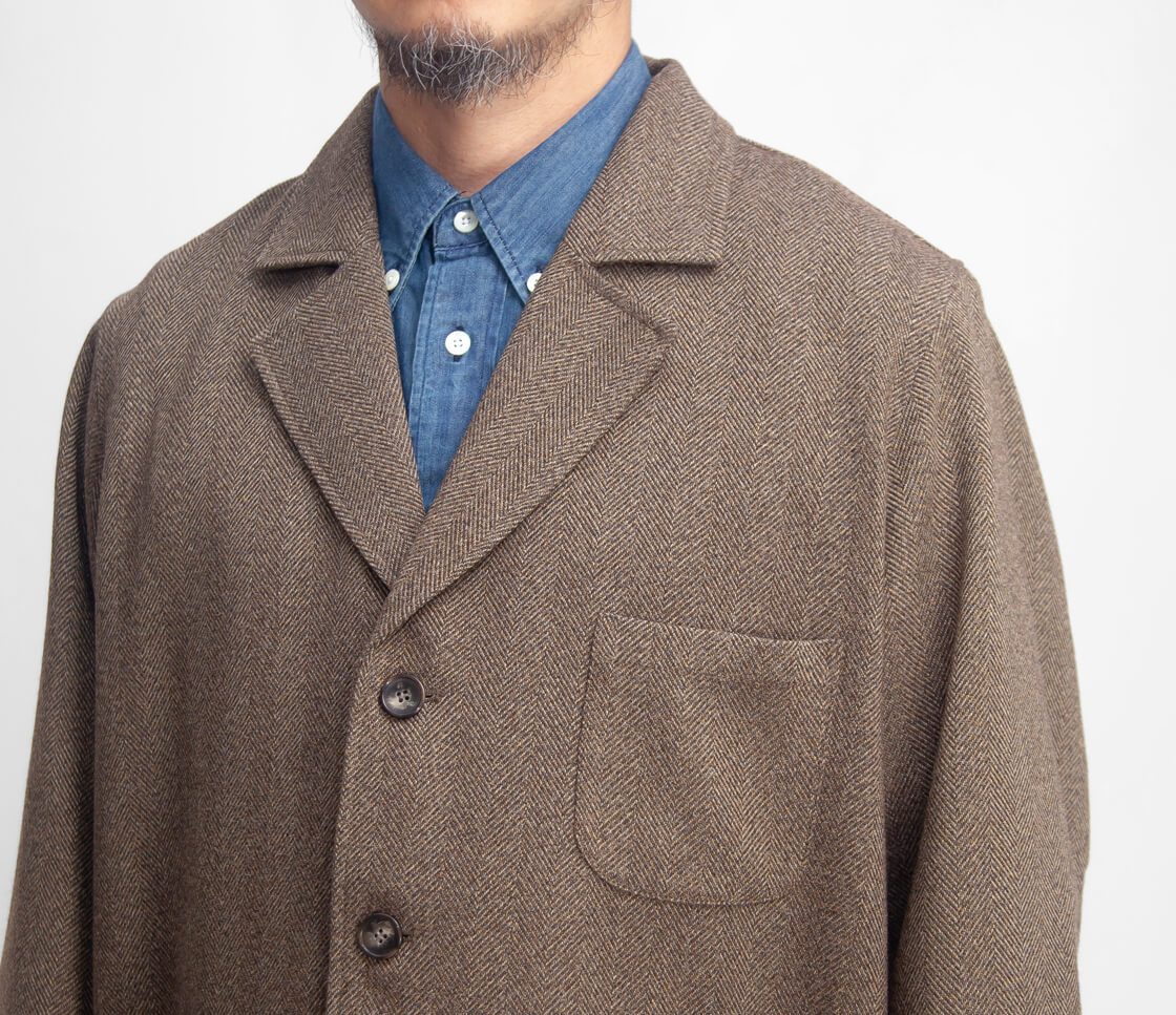 英国調の重厚感のあるヘリンボーン柄3ボタンジャケットは、ゆったりとした身幅で独特のヌケ感のある作り。
