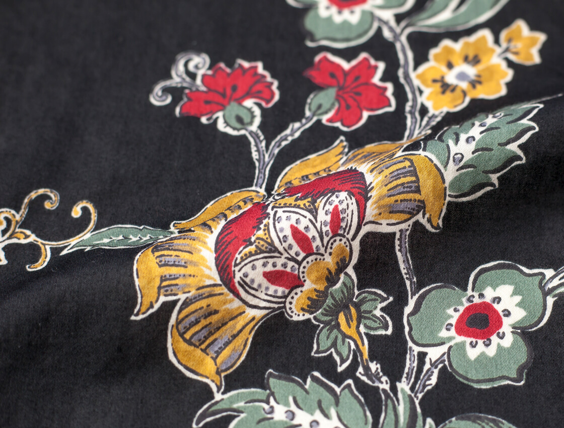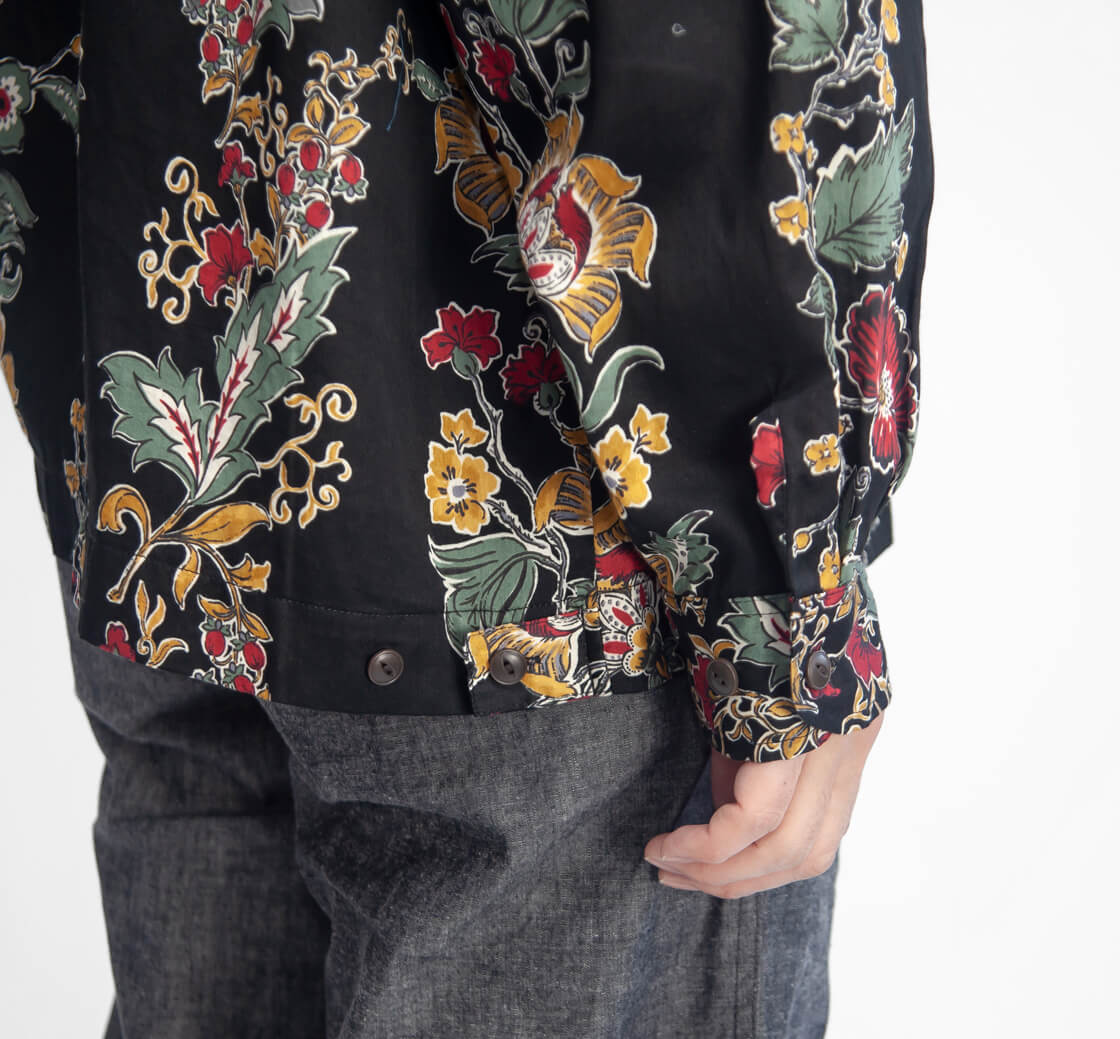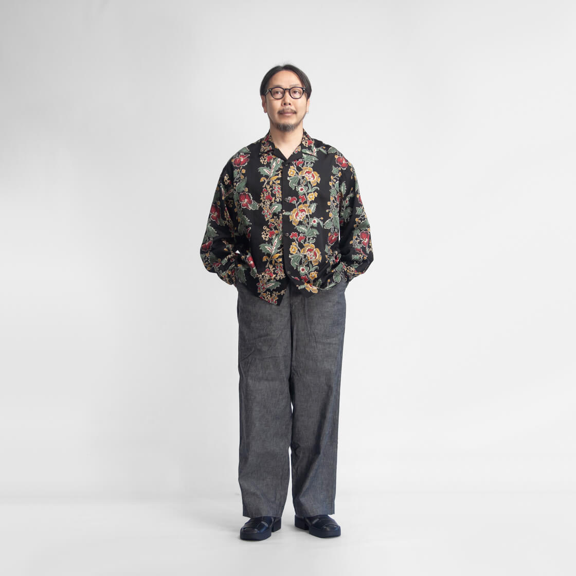 H.UNITから、アールヌーボー調の大胆な花柄が映えるオープンカラーシャツをご紹介。 ゆったりとした身幅に肩を落としたボックスシルエットで、首元は前下がりをやや高めに設定し端正な印象に。 袖口は2つボタン仕様、後ろ裾にはボタンアジャスターを備え、猫目ボタンが程よい無骨さをプラス。 80番手糸で織り上げた薄手のコットンサテンは、上品な微光沢としなやかな落ち感が魅力。 水洗いと天日乾燥による自然なシワ感が奥行きを与え、軽やかな着心地を実現します。 華やかさと品格を併せ持ち、春夏の装いに映える一枚です。