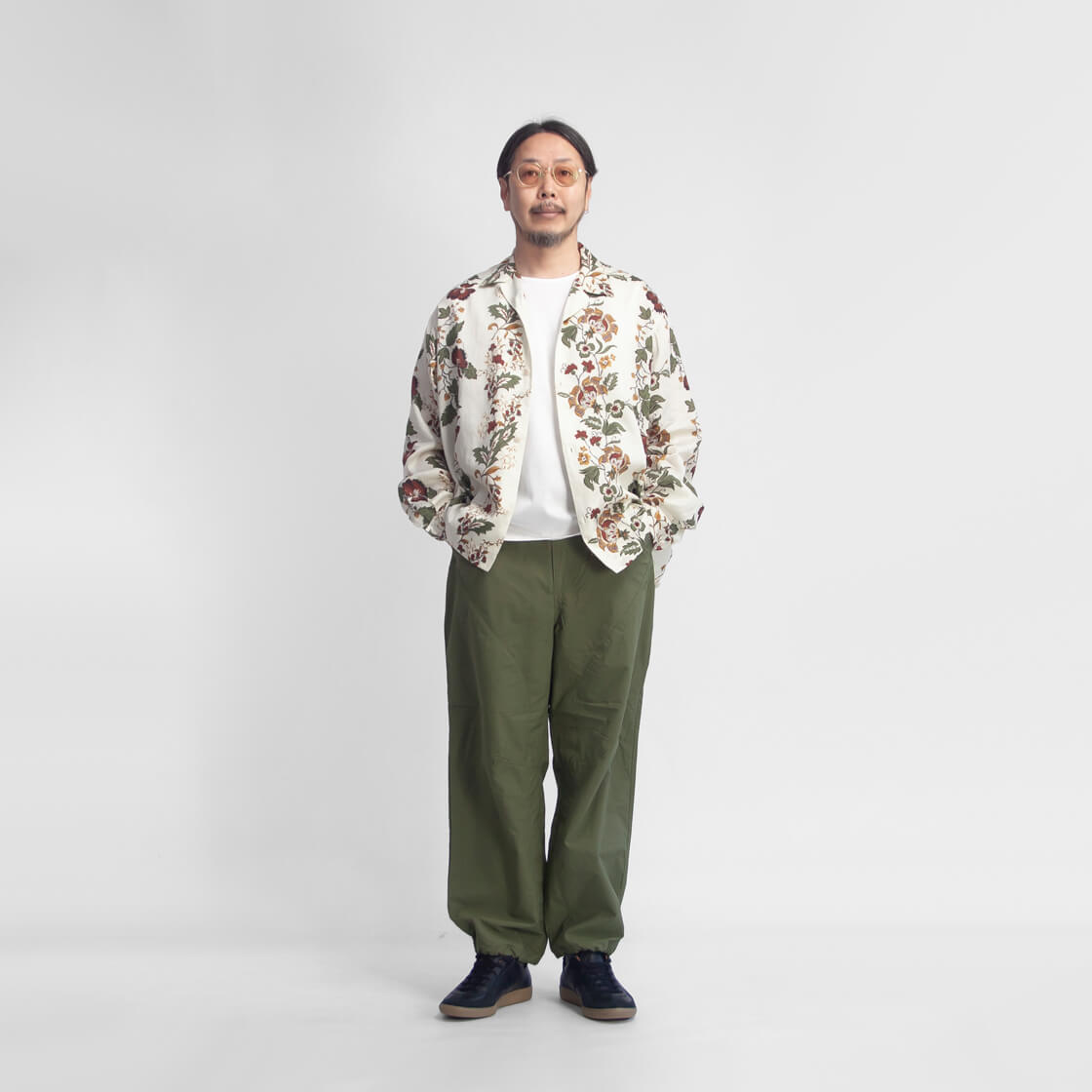 ![]() H.UNIT - Flower print open collar long sleeves shirt ![]() アールヌーボー調のクラシカルな雰囲気をまとった、大胆な花柄プリントのオープンカラーシャツ。 ![]() H.UNIT(エイチユニット) 岡山県倉敷市児島と言えば、世界的にも有名なジーンズの産地。そこに拠を構え、" 児島らしく、児島らしからぬ"をテーマとしてプロダクトを展開しているH.UNIT。独自の観点により、ヴィンテージらしさと現代らしさを融合させたアイテムを"倉敷児島"特有の縫製、加工技術、手作業を織り交ぜカスタマイズさせた服作りを提案しています。 ![]() ゆったりリラックスしたボックスシルエットに首元の開きが控えめな開襟。 アールヌーボー調のクラシカルな花柄を大胆に落とし込んだ、H.UNITのオープンカラーシャツ「Flower print open collar long sleeves shirt」。一目で心を掴む存在感と、どこか気品を感じさせる佇まいが魅力の一着です。ゆったりとした身幅に、肩を自然に落としたボックスシルエット。通常のオープンカラーシャツよりも首の前下がり位置をやや高めに設定することで、首元がルーズになりすぎず、すっきりと端正な印象に。リラックス感を備えながらも、だらしなく見えない絶妙なバランスに仕上げられています。袖口は2つボタン仕様で、フィット感の微調整が可能。さらに後ろ身頃の裾にはボタンアジャスターを備え、シルエットにさりげない変化をつけられます。ボタンには猫目ボタンを採用。ワークなディテールが、程よい無骨さも添えます。 ![]() しなやかで滑らかな肌触りで、肌に心地よく触れる薄手のコットンサテン生地。 本体に用いているのは、雰囲気のあるフラワープリントを施したサテン生地。細番手の80番手糸で織り上げた、落ち感のある薄手の綿100%素材です。サテン特有の上品な微光沢と、しなやかで滑らかな肌触りが特徴。軽やかでありながら、どこかゴージャスな着心地をもたらします。凹凸の少ないなめらかな表面感がクラシカルな花柄をいっそう引き立て、華やかな印象に仕上げています。さらに、水洗いと天日乾燥を施すことで、ナチュラルなシワ感を加え、こなれた表情も表現しています。 ![]() ![]() 身長170cm、体重62kgの男性が2サイズ着用。