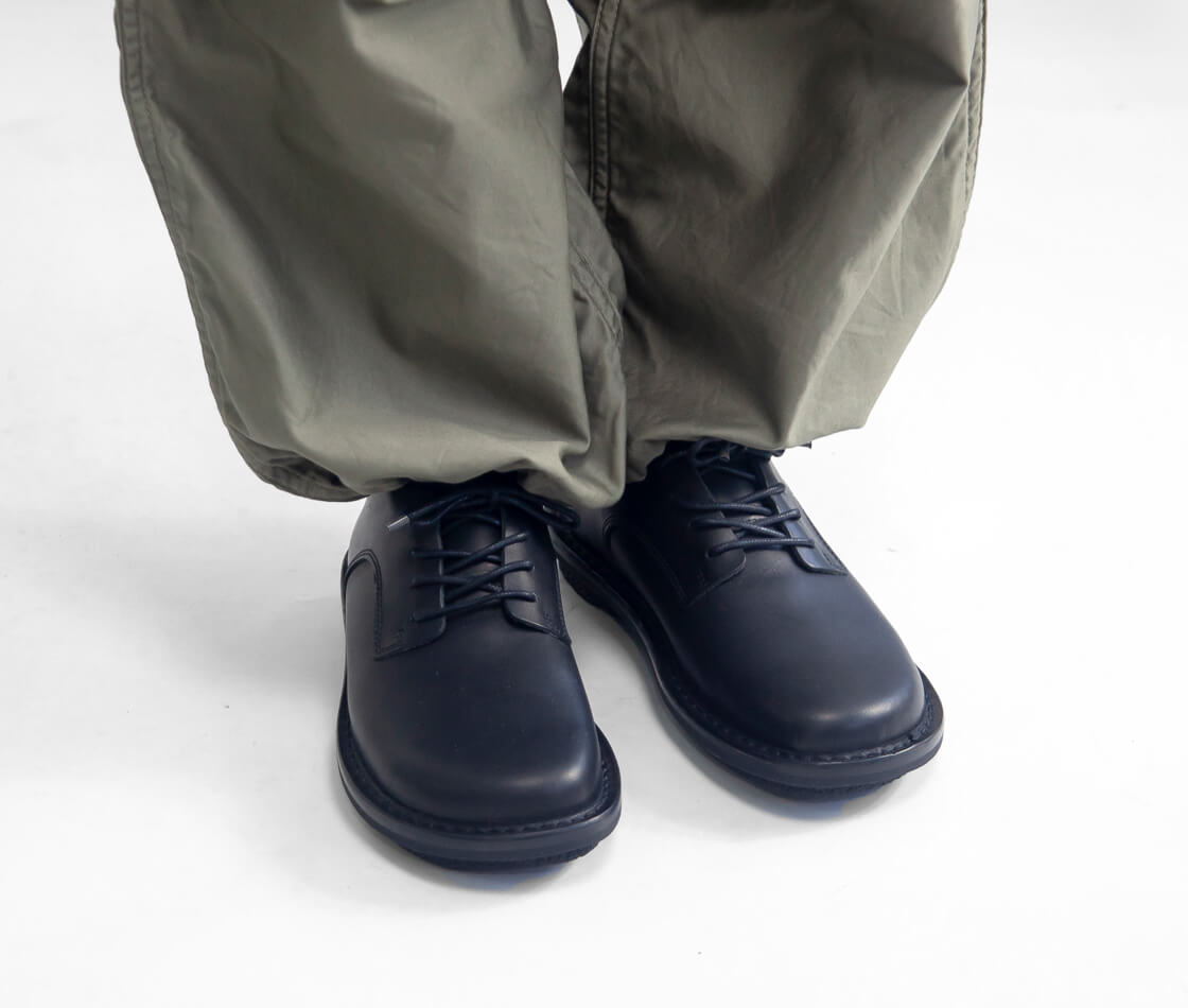 trippenから、クラシックなルックスと快適な履き心地を兼ね備えたレースアップシューズ「Ernie」をご紹介。 DERBYとの違いはソールステッチが一重で、アッパーがほとんど一重仕立てになっている点。 厚い革を使うことで耐久性は損なわず、価格を抑えています。 つま先にゆとりがある、日本人には履き心地の良い足型。 解剖学に則したコルク製インソールが自然なフィット感を実現しています。 アウトソールは耐久性と屈曲性を両立し、疲れにくい仕様です。 素材にはベジタブルタンニン鞣しのカーフレザーを使用。 繊細で美しい肌目と柔らかさを持ちながら、エイジングも楽しめます。 シンプルで汎用性の高いデザインは日常使いにも最適で、永く愛用できる一足です。