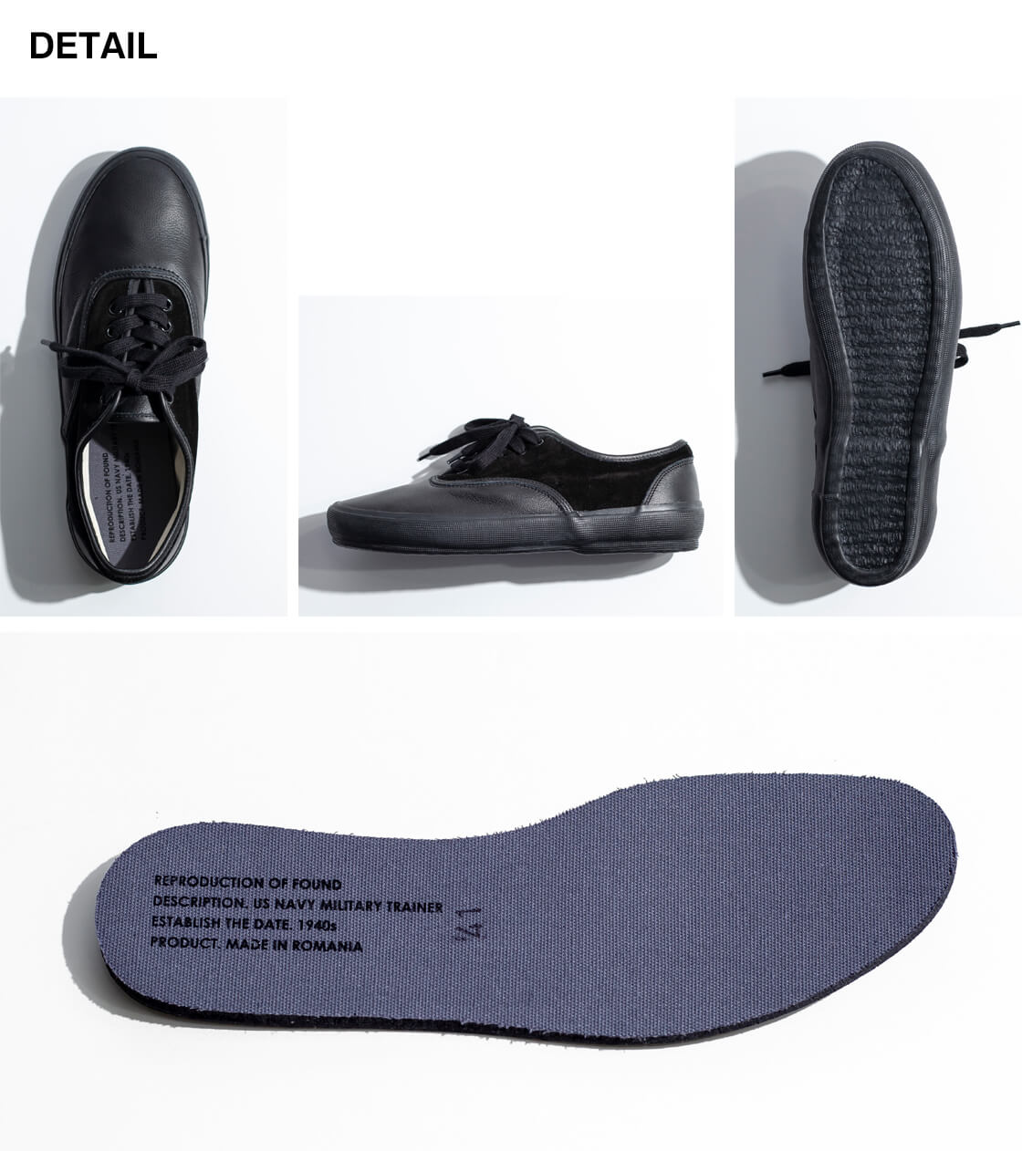REPRODUCTION OF FOUNDから1940年代に米海軍で採用された幻のモデルを復刻したレザースニーカーをご紹介。 イタリア軍やNATO軍の軍用シューズを手掛けていたルーマニアの工場で一足ずつハンドメイド生産。 水を逃す形状とやや高めのヒール設計をで、厚みのあるEVAインソールで快適な履き心地を支えます。 シルエットは当時のトレーニングシューズを踏襲したクラシックな佇まい。 イタリア老舗レザーメーカーによる柔らかさと耐久性を備えた牛革ナッパと牛革スエードを使用。 時代を超えて楽しめる一足です。
