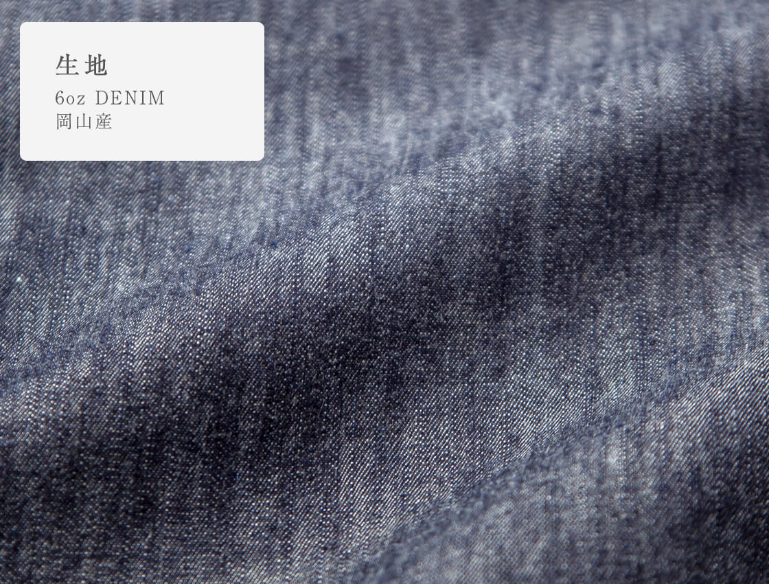 岡山産6オンスのロングスラブインディゴデニムは節感ある豊かな表情と柔らかな着心地が魅力。