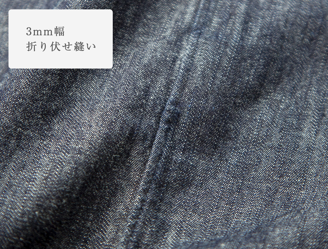ドレスシャツ専門工場による3mm幅の折り伏せ縫いなど丁寧な作りが光ります。