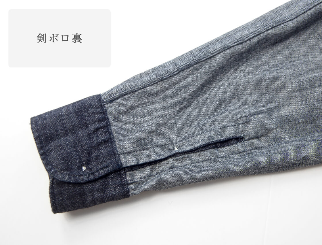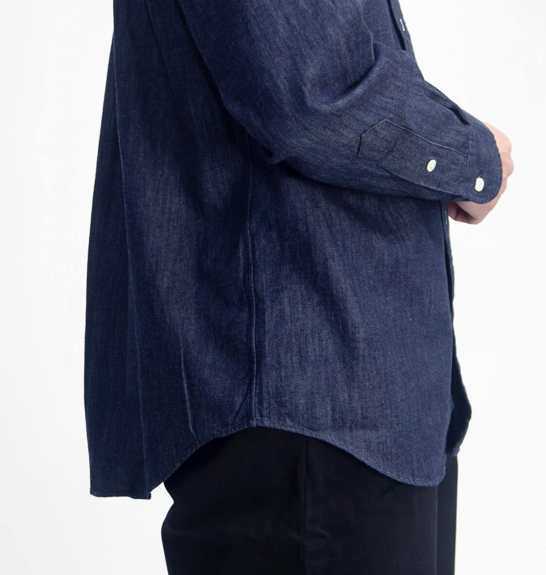 ![]() MANUAL ALPHABET - 6oz DENIM BD SHIRTS(ONE WASH) [BULGING FIT] ![]() シャツに絶対の自信を持つ「MANUAL ALPHABET」の定番。クラシックなゆとりのあるサイズ感を提案するBulging Fitのボタンダウンデニムシャツ(ONE WASH)。 ![]() MANUAL ALPHABET(マニュアルアルファベット) MANUAL ALPHABET(マニュアルアルファベット)はシャツを基本としたメーカー発国産ブランド。MANUAL ALPHABET(マニュアルアルファベット)は"点字"を意味し、 実際に手に取って商品の良さを確かめて欲しいという想いから名づけられています。メーカーだからこそ、気付くヒントを基にクオリティ、コストを大事にし、 高いから良い、安いから悪いでなく、時代の流れにあった、最適なバランスを探求しています。ディテールとシルエットのデザイン性を兼ね備えることで生まれる「佇まい」を大事に、「大人が楽しくなるシャツ」を創り続けていきます。 ![]() 節感のあるロングスラブのムラ糸を岡山県で織物にした6オンスインディゴデニム生地 不規則な長い節を持ったロングスラブのムラ糸で織り立てられた岡山産デニム生地。経緯ともに20番手の糸で織り立てられたライトな6オンスデニム生地なのですが、生地の表情がとっても豊か。糸に節感があり、ムラ糸を使用しているため、インディゴ糸と未晒し糸の色差で遠くから見ると光沢のあるようにも見えます。生地はとても柔らかく、着心地も良いデニム生地です。 ![]() ドレスシャツ専門工場で製作される脇部分の手間のかかった3mm幅の織り伏せ縫い。 縫い代が隠れて表も裏もスッキリきれいで丈夫に仕上がる折り伏せ縫い。生地どうしを本縫いで縫い合わせたあと、 片方の生地端をカットした後、片方の縫い代をもう片方の縫い代で包み、包んだ端にステッチをかける方法ですと説明は簡単ですが、幾度もの工程がかかり、さらに3mmの幅となると熟練の工場でも至難の技術になります。通常では5~10mm程度の折り伏せや、量産するには生地を重ねて巻き込む巻き縫いの方が効率が良いのですが、縫い目のパッカリング(ステッチに出るしわしわ)を防ぎ、生地の重なりで厚みがでるのを防ぐため、美しい脇線の仕上がりになります。 ![]() 折り返しても美しい裏から見ても綺麗な剣ボロ裏。 剣ボロ裏は生地端のボロが出ないよう工夫し、袖を折り返した時も表との違和感のない美しさを表現しています。 ![]() ルーズでクラシックなゆとりあるシルエットのBulging Fit。ゆったりしながらも品のある佇まいは、 時代が変わっても変わることのない普遍的なデザイン。 オンタイム、ジャケットスタイルにも対応する"オン"シャツ。クラシックなゆとりあるスタイルを提案するBulging Fitは、ルーズでリラックスしたシルエット。肩幅、バストにゆとりを持たせ着易さを実現しながらも品のある佇まい。また身体の動きに連動するようにヨーク幅を狭く、後ろ身頃にボックスプリーツを入れることで肩回りの可動性も高い仕様。 ![]() ![]() 身長168cm、体重65kgの男性が2サイズ着用。