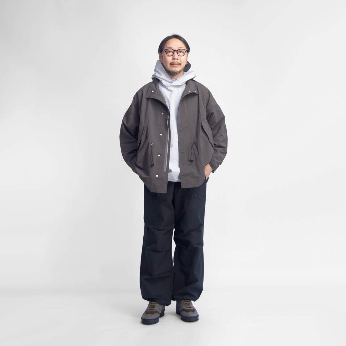 2 / 着丈72 / 身幅62 / 肩幅66 / 袖丈56 モデル着用 170cm/62kgで2サイズ 素材 綿100% カラー展開 ブラック、シルバーグレー 生産国 日本 モデル着用コメント 2サイズを着用しました。身幅はゆったりオーバー気味なシルエットですが、袖幅やアームホールは太すぎないので、インナーとしても比較的使いやすいかと思います。生地に伸縮性はありませんが生地が突っ張るような部分も無く、着丈は裾は絞ってある程度調整できるので問題なしです。袖丈は少し長めですが袖口のゴムで止まるので違和感はありません。僕の場合、2サイズで十分ゆったりなので、特にサイズアップの必要はないです。 スタッフ着用コメント 3サイズを着用しました。身幅、肩幅ともにゆったりなサイズ感です。肩がドロップし、ダーツのおかげで肩のラインもなだらかで、全体的にラフなシルエットという印象です。着丈はヒップが8割ほど隠れるくらいの長さです。裾をギュッと絞ってブラウジングさせても良いですし、ゆとりのあるサイズ感ながら全体的には野暮ったい感じはありません。気持ちスッキリとさせるなら2サイズでもいいかと思いますが、それでもラフさのある着用感です。 |