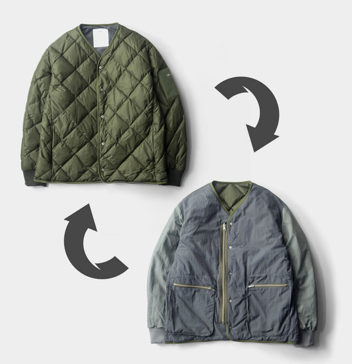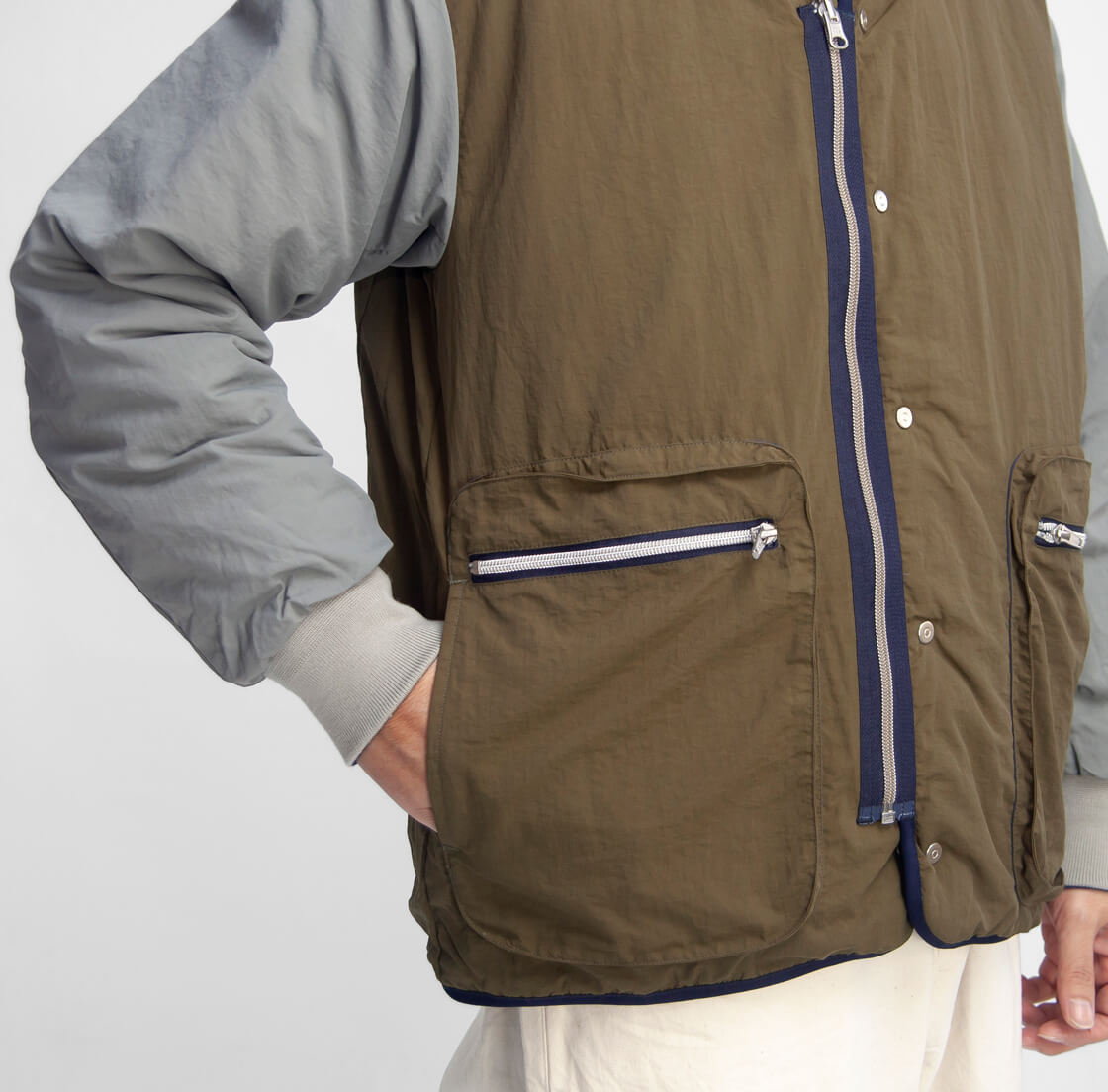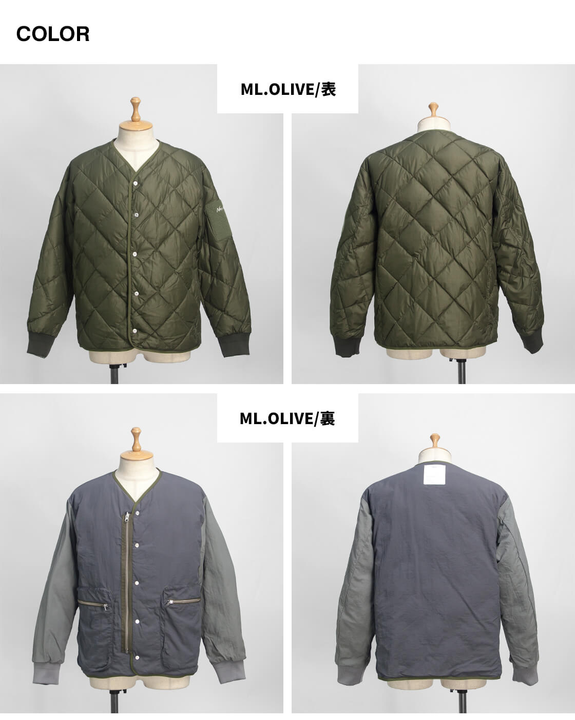 リバーシブルジッパーとスナップの前立てで着脱が快適。