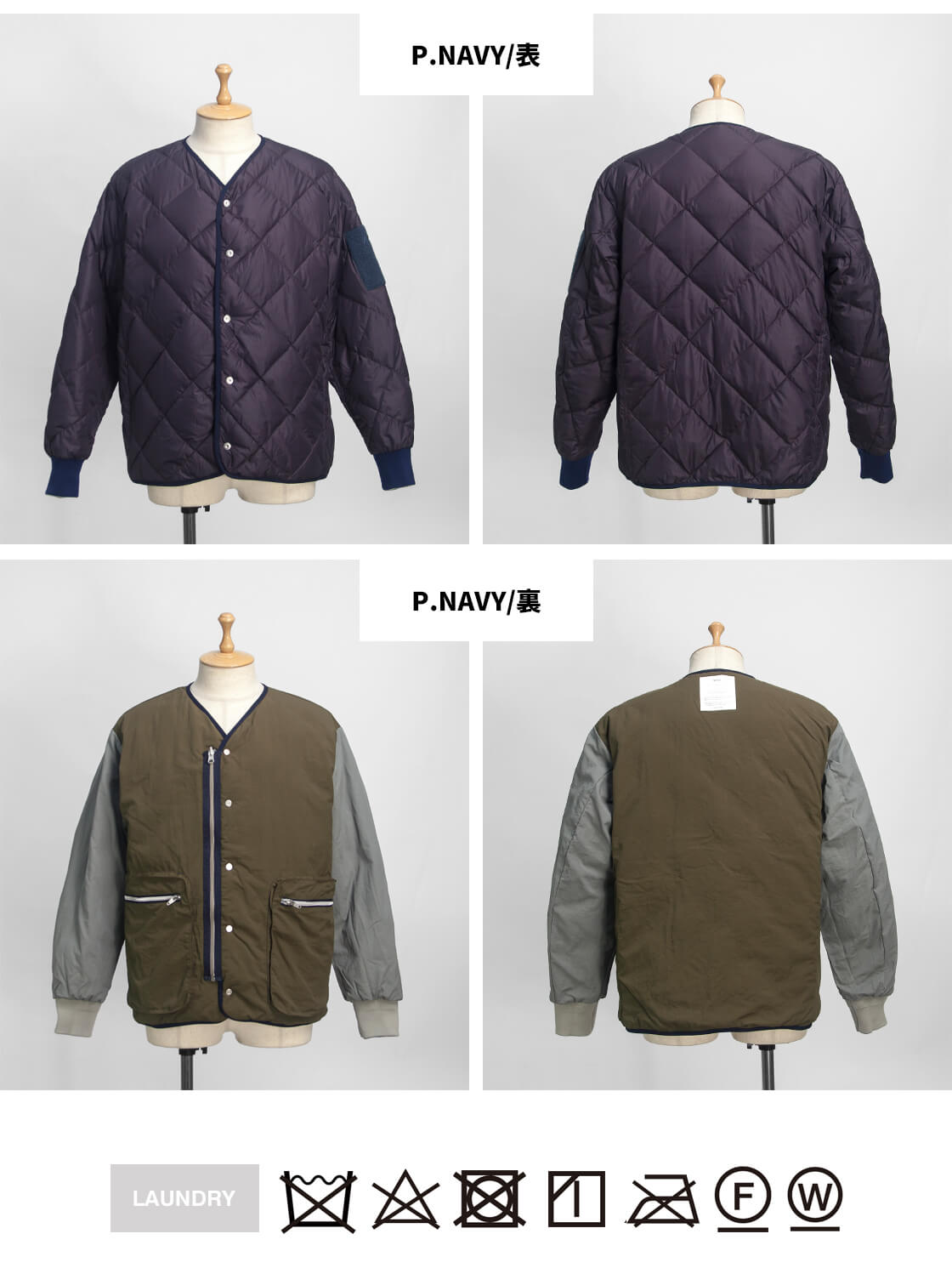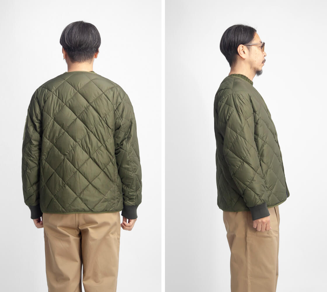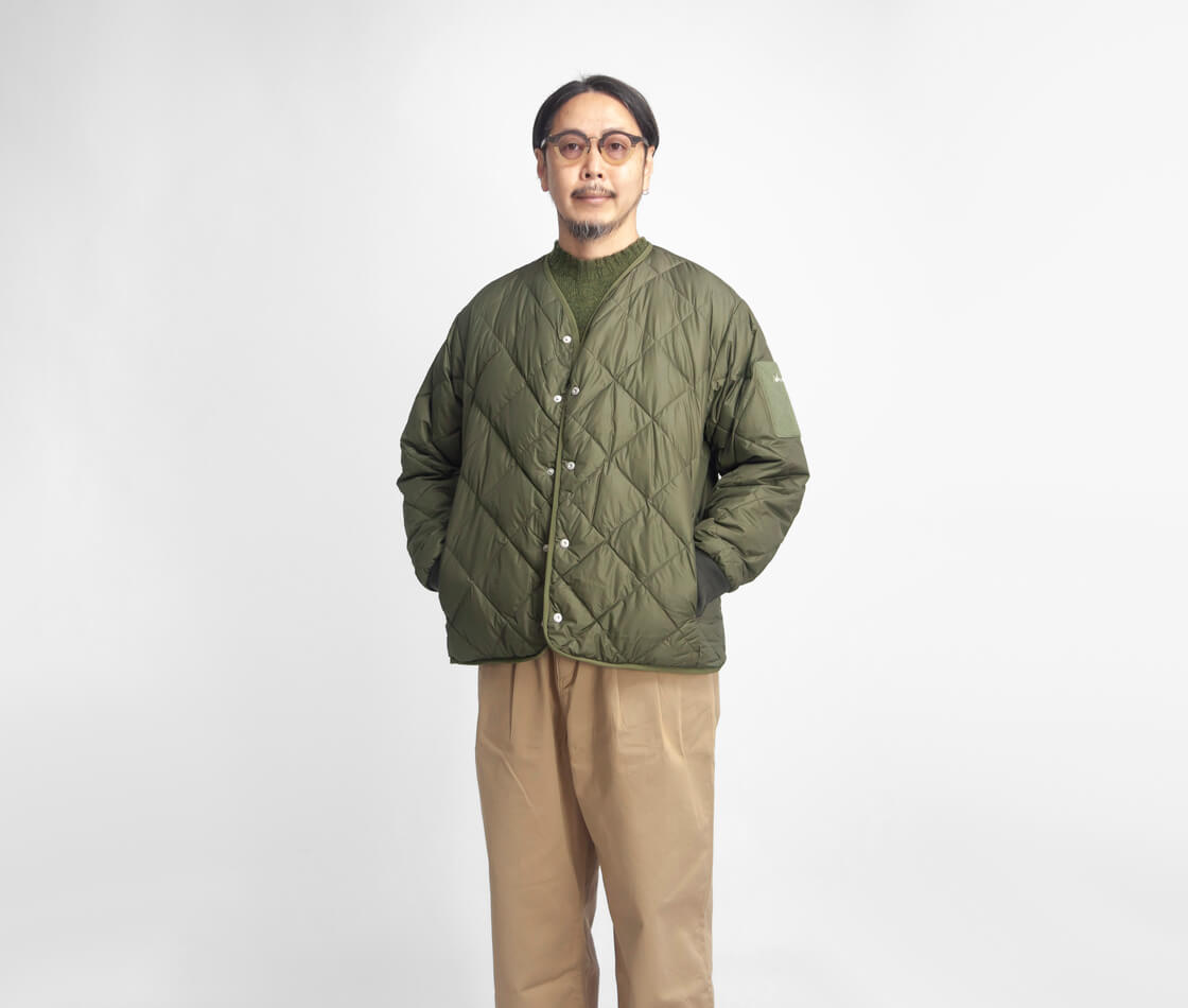 ![]() NANGA×MANUAL ALPHABET - CMR REVERSLE DOWN JACKET ![]() NANGAとMANUAL ALPHABETコラボによる、表裏の両面で着用できるリバーシブル仕様のダウンジャケット。 ![]() M-51ライナージャケットのようなノーカラーデザインにリバーシブル仕様。 アウトドアフリークに多くのファンを持つ国産屈指のシェラフ・メーカー「NANGA」に向けて「MANUAL ALPHABET」が別注をかける恒例のダウンシリーズ。今作は、アメリカ軍M-51のライナージャケットのようなノーカラーデザインに、表裏の両面で着用できるリバーシブル仕様のダウンジャケット「CMR REVERSLE DOWN JACKET」。ゆとりがありつつも、決してオーバーではないサイズ感はボトムスを選ばず、やや短丈のシルエットは動きやすくて、インナーとのレイヤードも楽しめる。フロントにはコンシールファスナー開きのポケットが4つ、裏返せば腰位置にハンドウォーマーポケットとジップポケットが付いていて、合計8個ものポケットで収納力抜群。フロントは回転式リバーシブルスライダー+スナップボタンの二重構造で、着脱もストレスなし。左袖にはNANGAの刺繍入りフィールドを搭載し、好みのモラールパッチを貼って楽しむことも可能。袖口はウールの段リブで、ヴィンテージさと上質さを漂わせます。 ![]() 表面は超軽量撥水マイクロリップ、裏面はマットな色味でコットンライクな肌触りが特徴のタスランタフタ。 表面に用いているのは、ナイロン100%のマイクロリップストップ生地。ミリタリー・アウトドア用品の素材としてよく使われる、軽量+高強度なリップストップ生地。万が一生地が裂けても格子状に縫い込まれた繊維がそれ以上の進行を食い止めてくれる丈夫な素材ですが、こちらは格子がとても細かいマイクロリップストップ生地。このマイクロリップは格子と生地目がとても細かいため、シャカシャカ音がしなくて、生地表面が滑らかで柔らかくしなやかに仕上げた生地。これは隠密行動が必要な特殊部隊などに必須な機能性。夜な夜な家族にバレないように家を抜け出すお父さんには必要な機能だということです。笑。とても軽量でいて、撥水性も持ち合わせた機能素材です。 ![]() 高品質なスペイン産ホワイトダックダウン。心地よく体に馴染むダウンです。 使用している羽毛は高品質なスペイン産のホワイトダックダウン。フィルパワーは[760フィルパワー]のかさ高さで70g充填しています。羽毛は独自の専門機器や優れた技術を持つ羽毛加工メーカー「河田フェザー」に洗浄を依頼しています。汚れはもちろんのこと羽毛特有の臭いもほとんどありません。羽毛という素材が持つ性能を最大限に活かすために必要なのが高度な精製技術。国内精製羽毛はそのクオリティーにおいて他国の追従を許しません。 ![]() ![]() ![]() 身長170cm、体重62kgの男性が2サイズ着用。