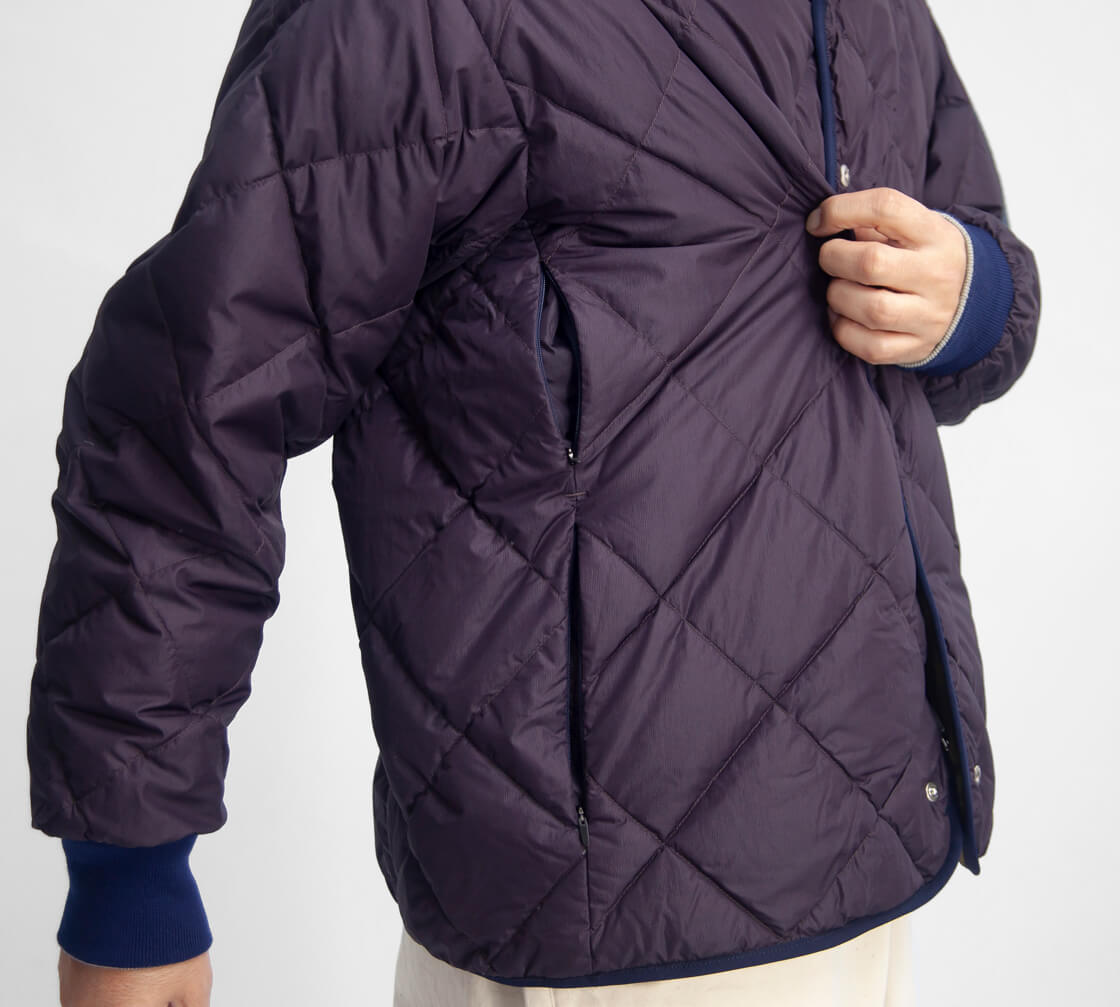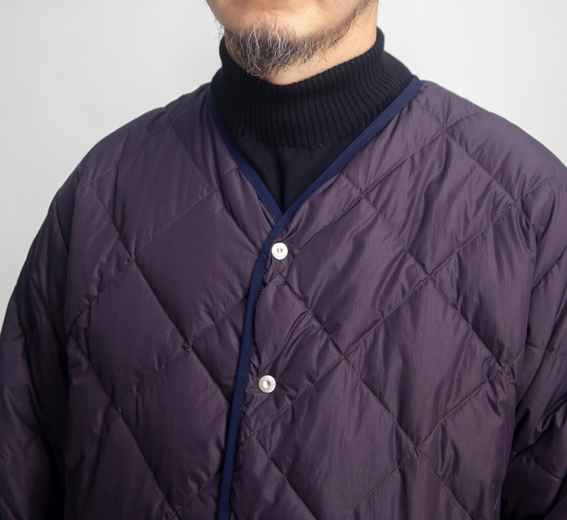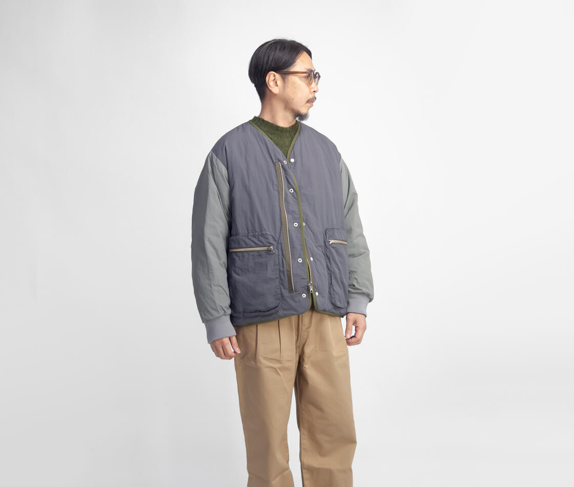MANUAL ALPHABET × NANGAからリバーシブル仕様のノーカラーダウンジャケットのご紹介。 表裏で異なる表情が楽しめ、収納力の高さが特徴です。 リバーシブルジッパーとスナップの前立てで着脱が快適。 袖口にはウールリブを配し、程よく品のある仕様。 短丈で重ね着しやすいシルエットで、タウンユースでも軽快な印象です。 撥水性を持つマイクロリップストップと、コットン調のナイロンタスランタフタを採用。 中綿は760フィルパワーのホワイトダックダウンを70g充填し自然と体に馴染む。 軽さと保温性を両立し、日常的に使いやすいバランス感の一着です。