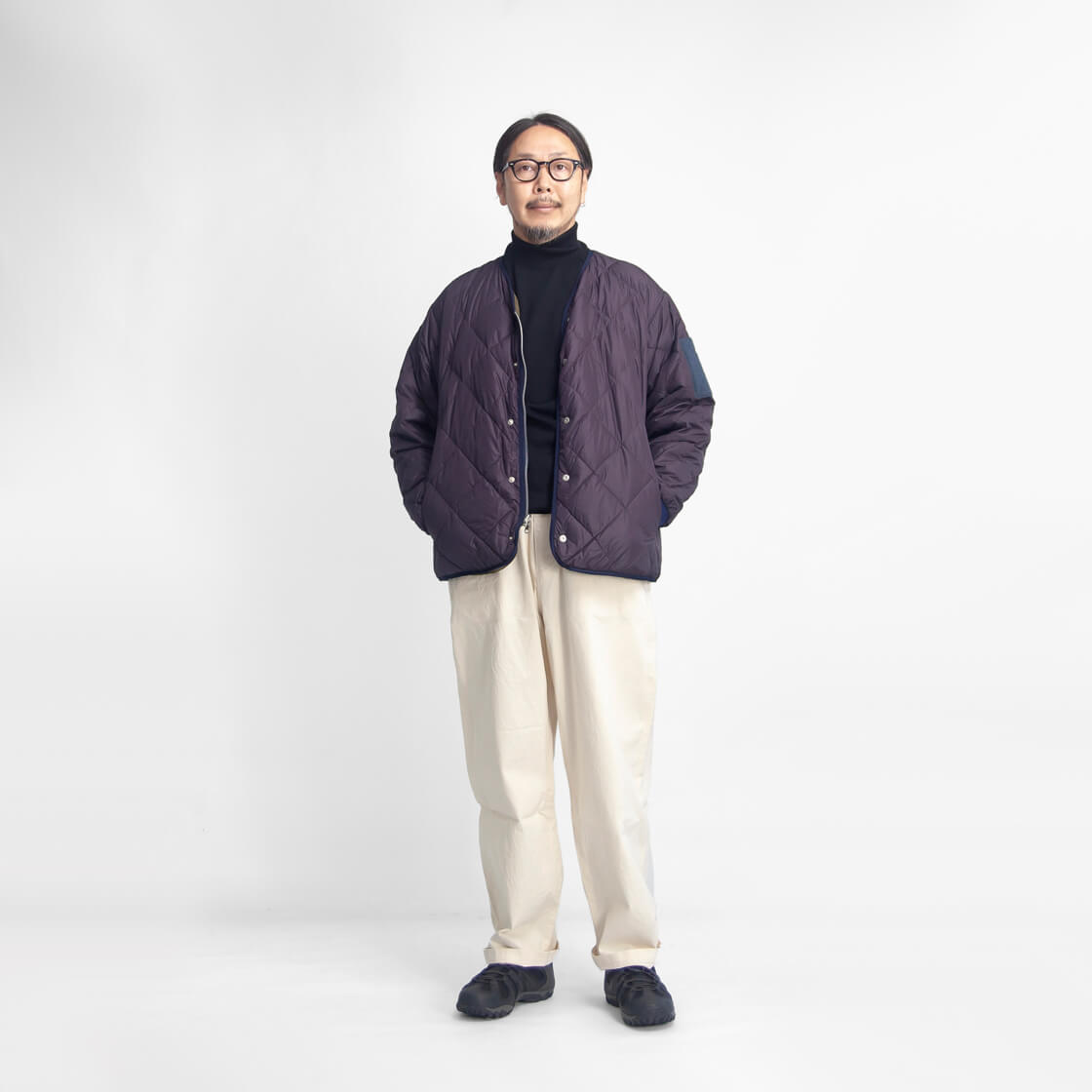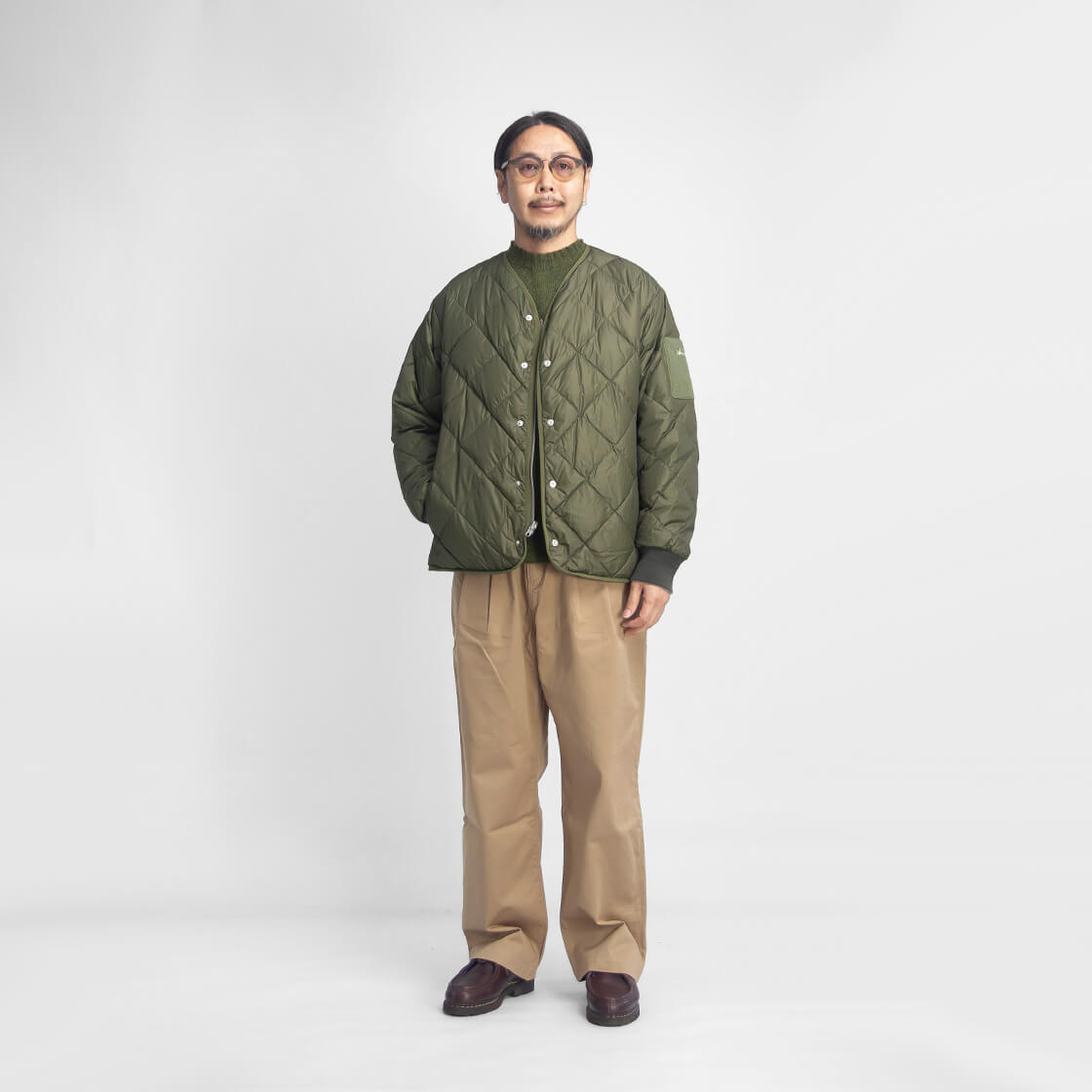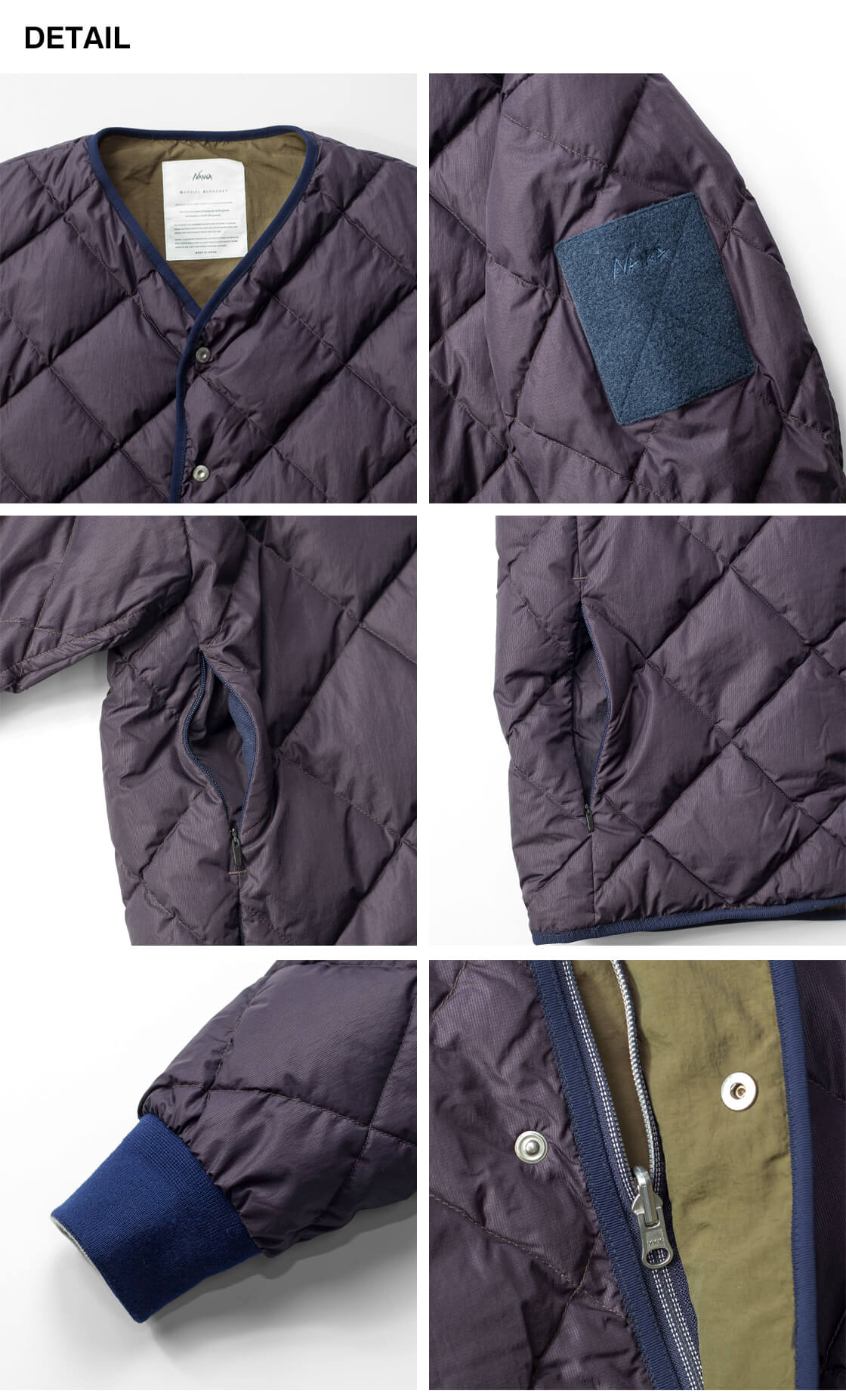 MANUAL ALPHABET × NANGAからリバーシブル仕様のノーカラーダウンジャケットのご紹介。 表裏で異なる表情が楽しめ、収納力の高さが特徴です。 リバーシブルジッパーとスナップの前立てで着脱が快適。 袖口にはウールリブを配し、程よく品のある仕様。 短丈で重ね着しやすいシルエットで、タウンユースでも軽快な印象です。 撥水性を持つマイクロリップストップと、コットン調のナイロンタスランタフタを採用。 中綿は760フィルパワーのホワイトダックダウンを70g充填し自然と体に馴染む。 軽さと保温性を両立し、日常的に使いやすいバランス感の一着です。