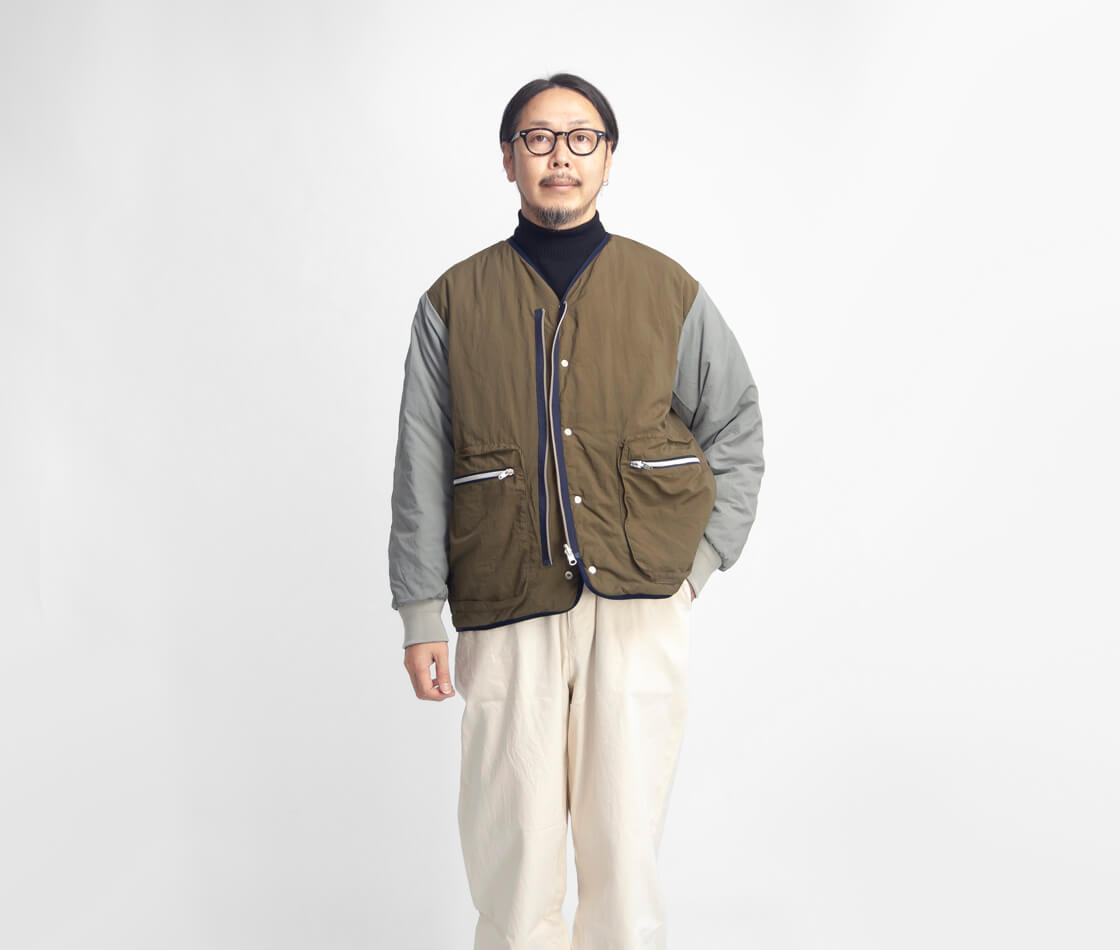 MANUAL ALPHABET × NANGAからリバーシブル仕様のノーカラーダウンジャケットのご紹介。