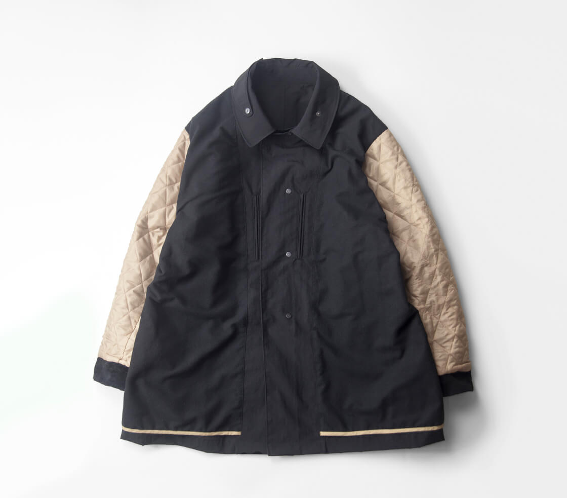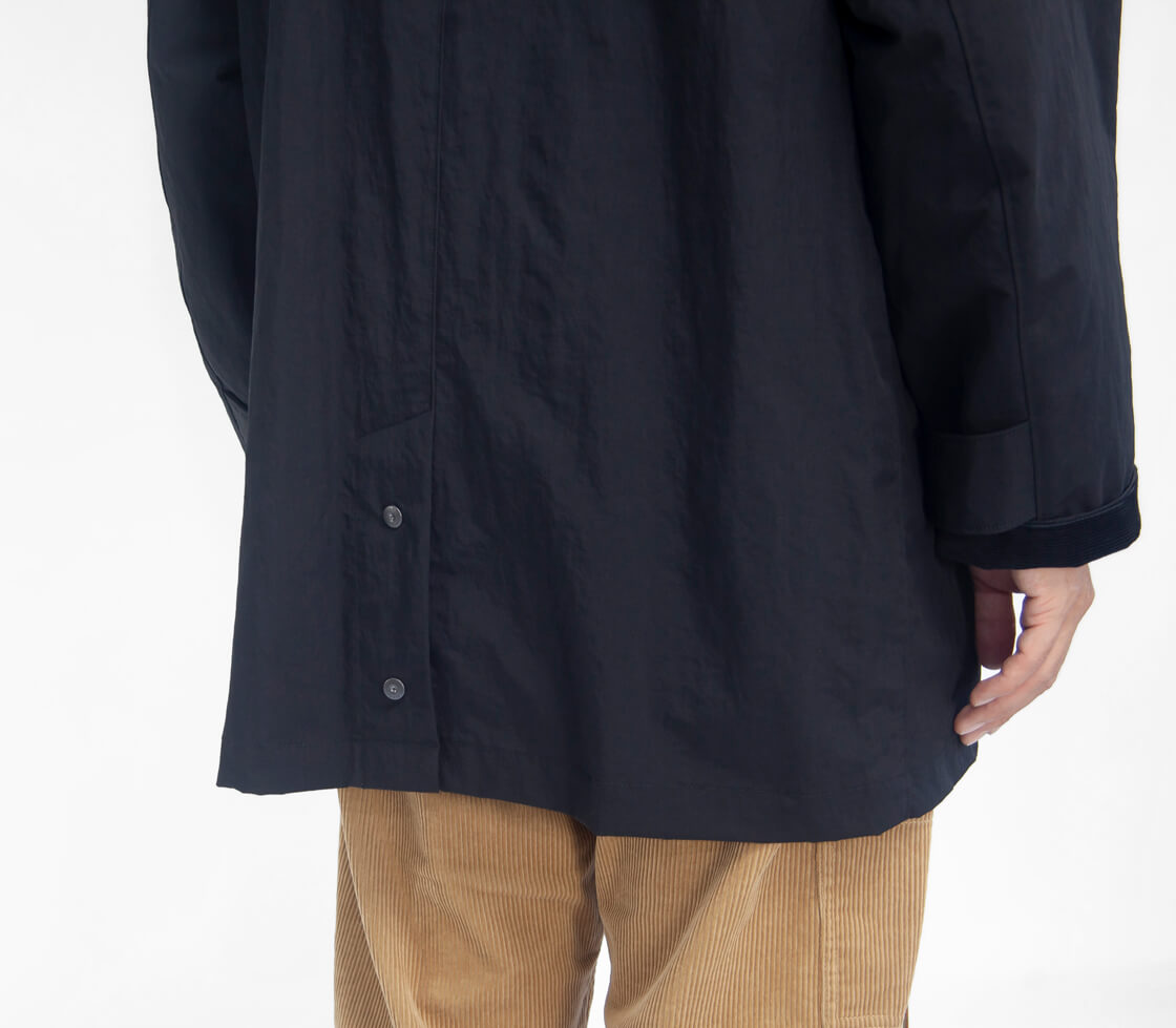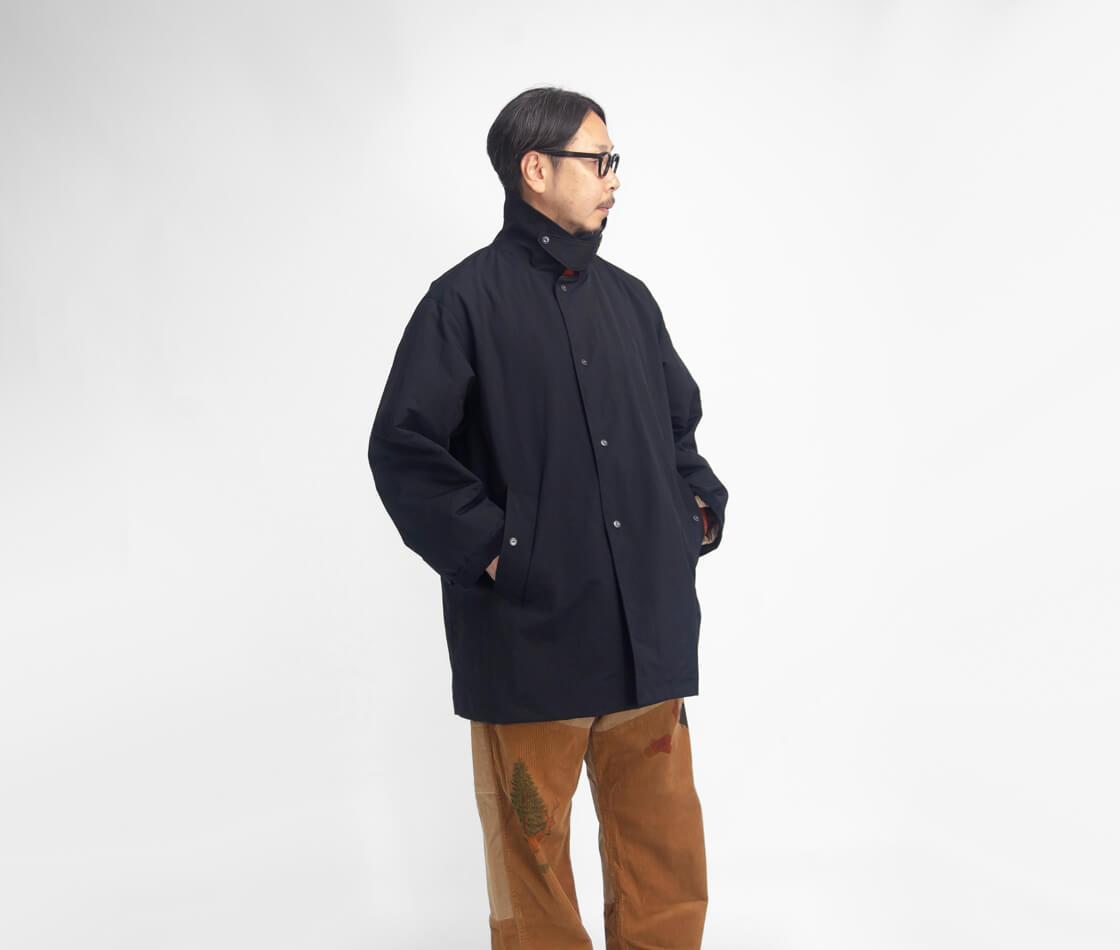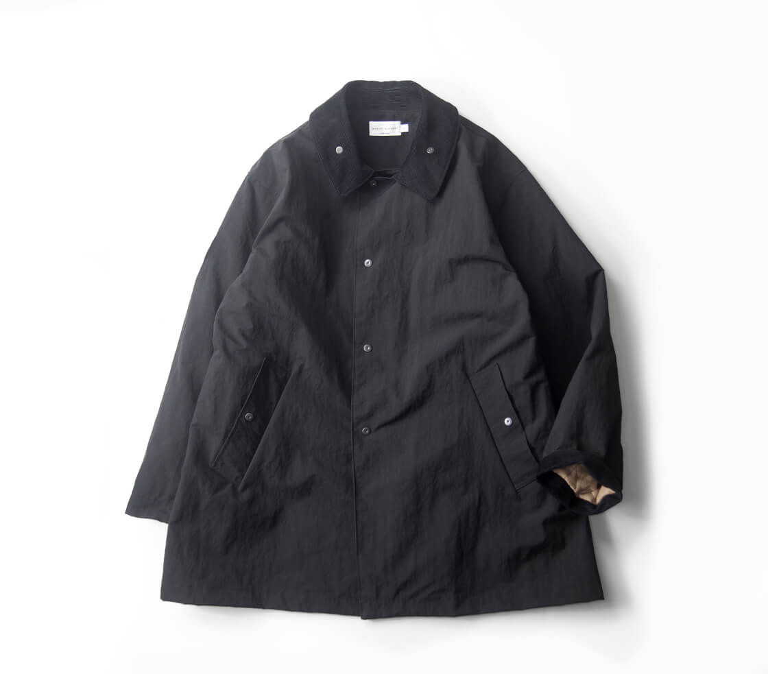 MANUAL ALPHABETから、コーデュロイ襟と袖裏の切り替えが印象的なバルカラーハーフコートをご紹介。 身幅を広く取ったゆったりシルエットで、厚手のインナーも着込みやすく、襟裏にはチンストラップを装備。 腰位置の深めポケットや内ポケットも備え、機能性とデザインを両立しています。 表地は自然なシワ感と鈍い光沢を持つナイロンタッサー。 撥水加工を施し、軽量で肌離れの良い快適な着心地を実現。 裏地には身頃にフランネル、袖裏に中綿入りのダイヤキルトを配し、保温性と快適さを確保。 軽く羽織れて暖かく、Aラインシルエットも上品。 日常に馴染みながらクラシカルな雰囲気漂う、完成度の高いハーフコートです。