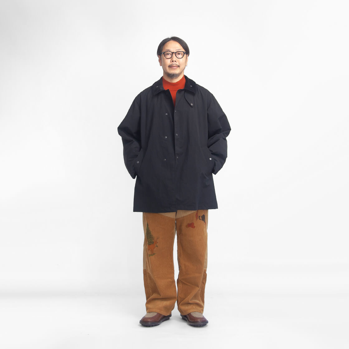 MANUAL ALPHABETから、コーデュロイ襟と袖裏の切り替えが印象的なバルカラーハーフコートをご紹介。