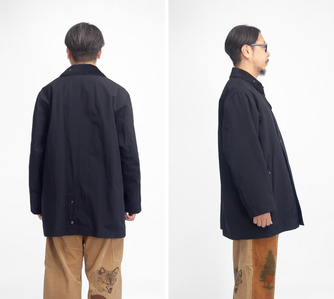 2 / 着丈80 / 身幅65 / 肩幅52 / 袖丈59 モデル着用 170cm/62kgで2サイズ 素材 本体(ナイロン100%) カラー展開 ブラック 生産国 日本 モデル着用コメント 2サイズを着用しました。ゆったりとしたシルエットで、身幅もまだまだ余裕が感じられました。生地に伸縮性はありませんが生地が突っ張るような部分も無く着心地もノンストレスです。着丈は太もも上部が隠れるくらいの、ミドルコートな長さ。袖丈は少しだけ長めですが、袖を折り返して袖裏のコーデュロイを見せても良い感じですし違和感はありません。僕の場合、2サイズで十分ゆったりとしているので、特にサイズアップの必要はありません。 スタッフ着用コメント 3サイズを着用しました。身幅など全体的に大きめですが、見た目としてはラフすぎることもないシルエットのバランスも抜群です。肩幅も大き目で少し落ち、袖丈は気持ち長めですが全然許容範囲です。3サイズでザックリと羽織れますが、気持ちスッキリと合わせるなら2サイズでもありですね。 |