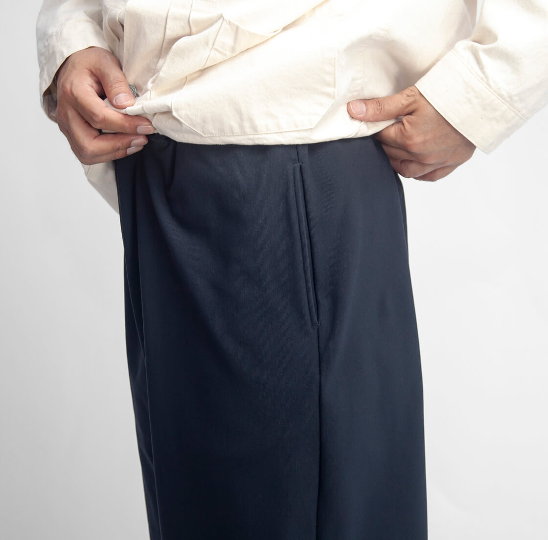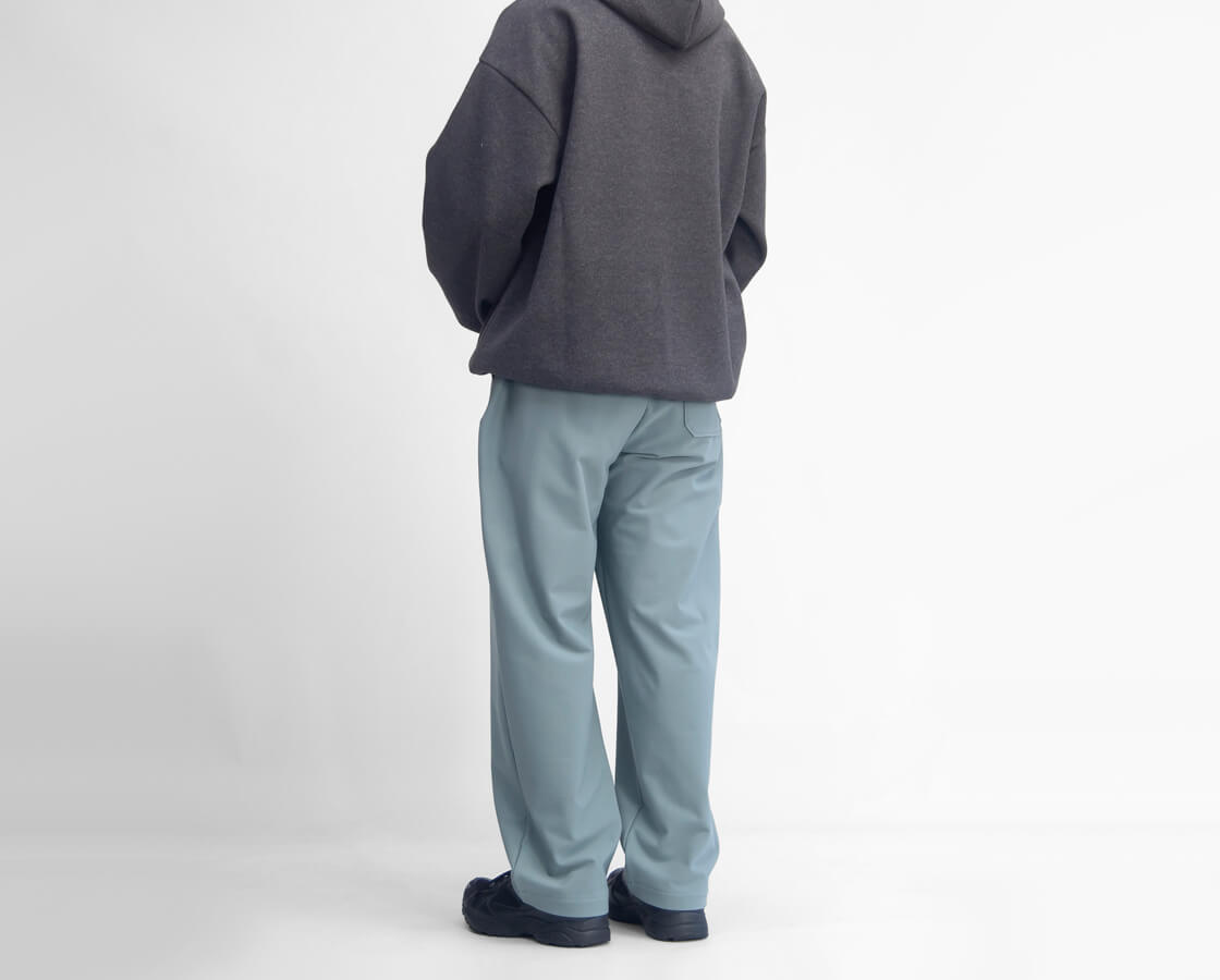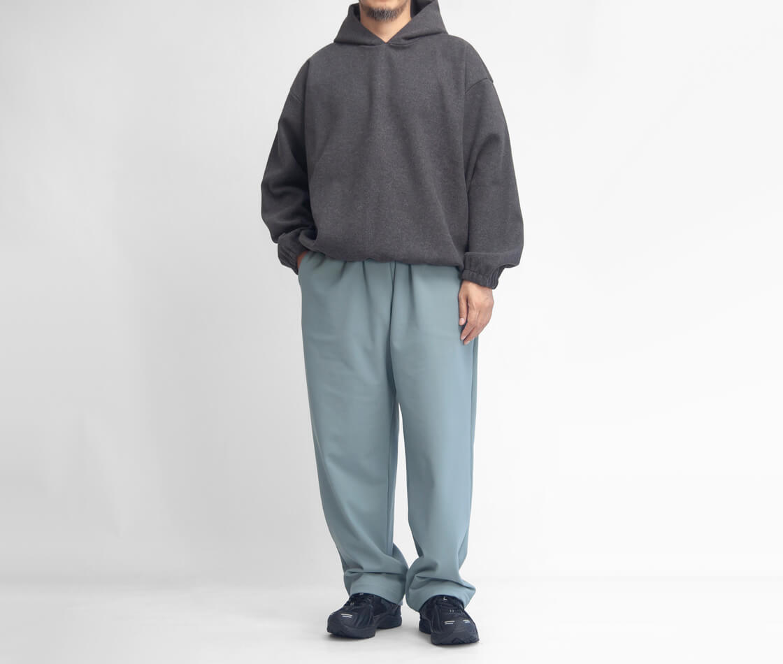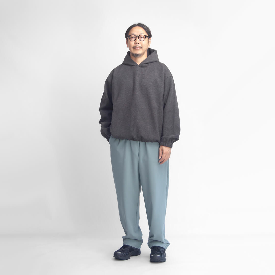 2 / ウエスト72-98 / レングス74 / 股上35 / ワタリ37 / 裾幅23 モデル着用 170cm/62kgで2サイズ 素材 ナイロン69% ポリエステル21% ポリウレタン10% カラー展開 ブルーグレー、ブラック、ダークオリーブ、チャコール 生産国 日本 モデル着用コメント 2サイズを着用しました。ウエストのゴムが良く伸びるので、比較的体型を選ばず着用出来ますし、大きい場合でもドローコードでしっかり固定できます。股上は深めでワタリもゆったりとしているので、特にタイトな部分はなく全体的な穿き心地はリラックス感がありました。ウエストの固定位置にもよりますがレングスはワンクッションするぐらいの長さで、個人的にはベストなバランス。3サイズでも問題はないですが、レングスの長さの面では2サイズがしっくり来ますね。 スタッフ着用コメント 3サイズを着用しました。ウエストは内蔵されているゴムとドローコードでウエストに合わせてしっかりフィットさせられます。軽量でデザインも使いやすく、ワイドな作りなのでとにかく履き心地が楽です。コーディネートに迷ったらとりあえずコレ!的な一本かと思います。2サイズでも特に問題なく穿けますが、気持ちすっきりとしたシルエットになり、レングスもクッションしないくらいの長さになりヌケ感が出ます。正直サイズ2でもいいですが、極力太いパンツの方が今は気分なので個人的には3サイズを選びますね。 |