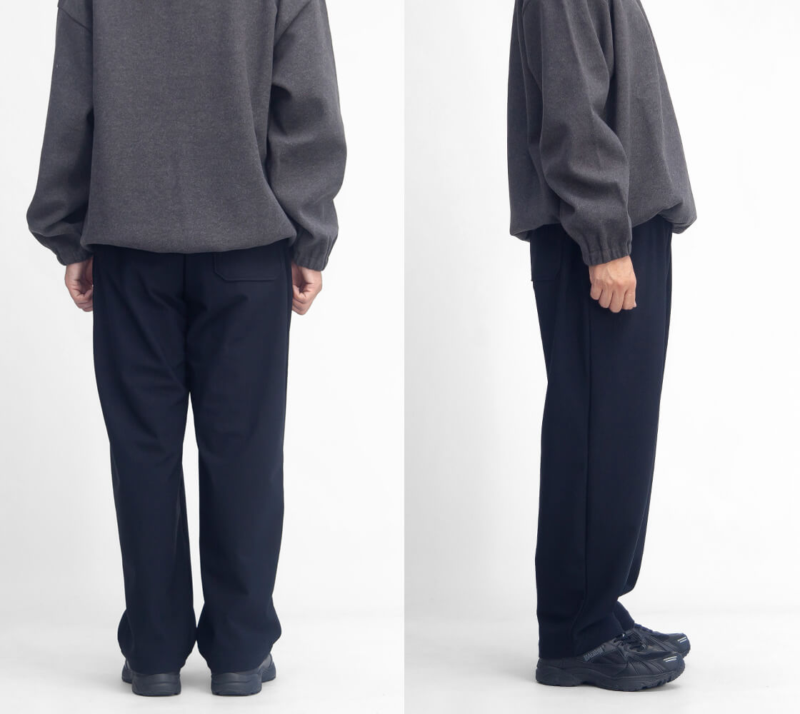 シルエットはゆったりしたワイドで、深めの股上と裾に向かって軽くテーパード。