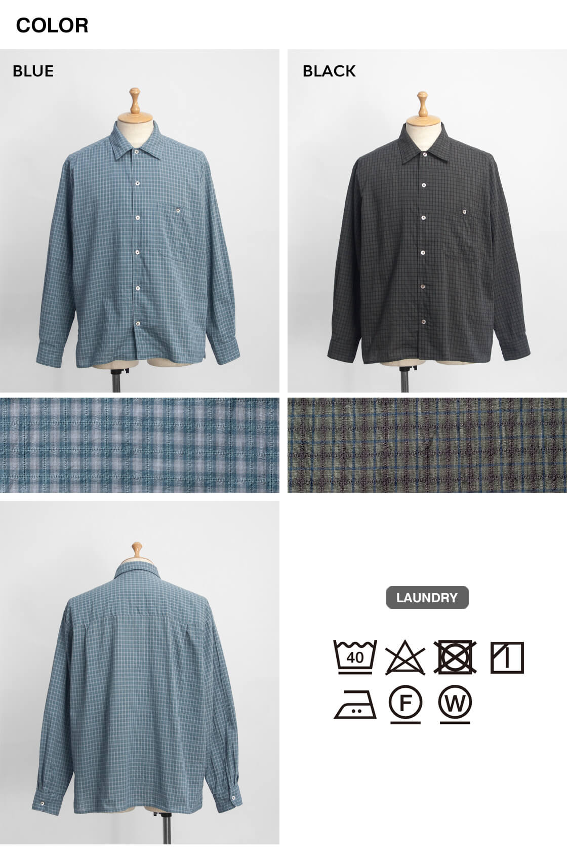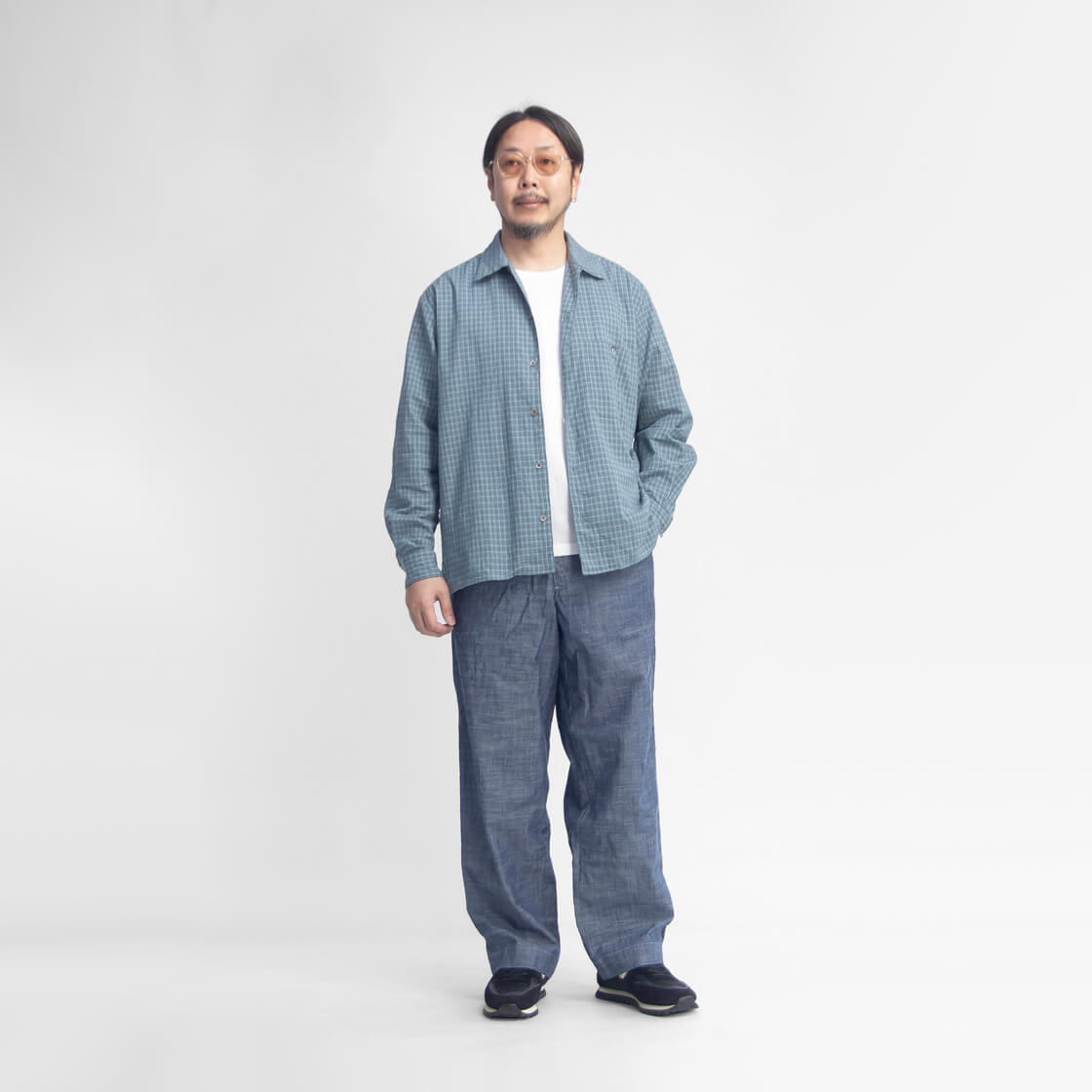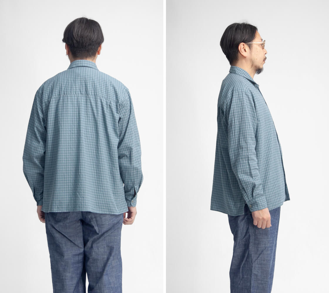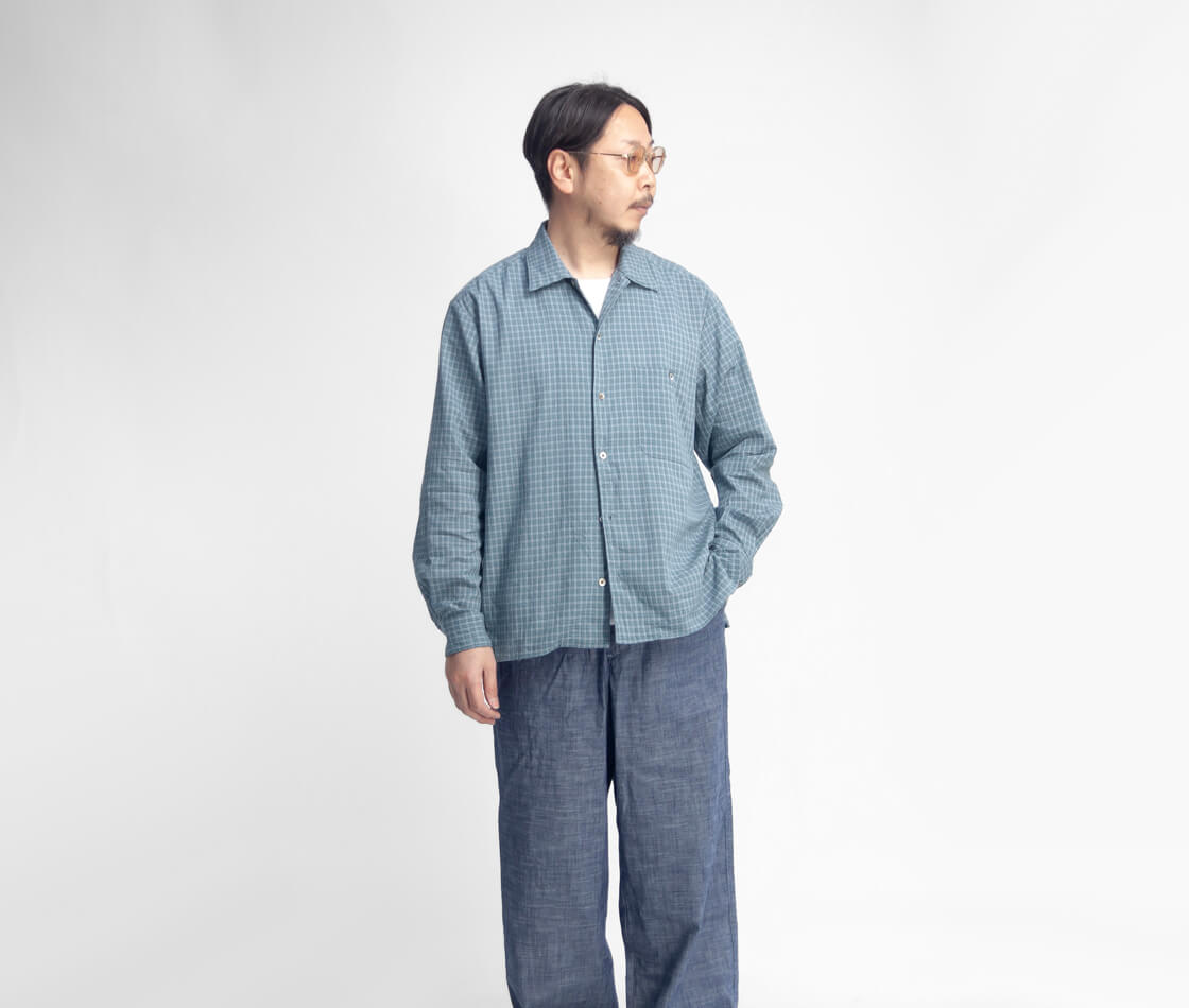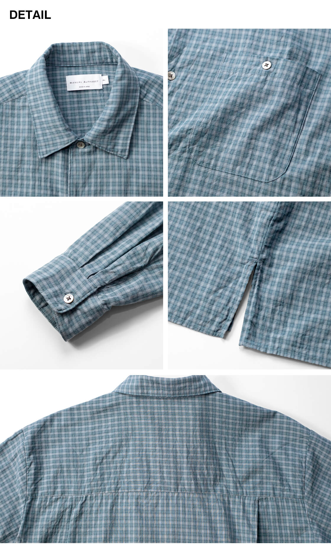 ![]() MANUAL ALPHABET - DOBBY CHECK L/S SHT ![]() スクエアカットの裾に、程よくゆとりのあるボックスシルエットのドビーチェックシャツ。ボタンを開ければオープンカラーになる2WAY仕様で、雰囲気の変化も楽しめる一着です。 ![]() MANUAL ALPHABET(マニュアルアルファベット) MANUAL ALPHABET(マニュアルアルファベット)はシャツを基本としたメーカー発国産ブランド。MANUAL ALPHABET(マニュアルアルファベット)は"点字"を意味し、 実際に手に取って商品の良さを確かめて欲しいという想いから名づけられています。メーカーだからこそ、気付くヒントを基にクオリティ、コストを大事にし、 高いから良い、安いから悪いでなく、時代の流れにあった、最適なバランスを探求しています。ディテールとシルエットのデザイン性を兼ね備えることで生まれる「佇まい」を大事に、「大人が楽しくなるシャツ」を創り続けていきます。 ![]() ボタンのかけ方で雰囲気の変わるワンナップカラー。 落ち着いた配色のミニチェックのドビー織生地を用い、裾をスクエア状にカットして、肩幅や身幅をやや広めにとったルーズなボックスシルエットのワンナップカラーシャツ「DOBBY CHECK L/S SHT」。やや薄手で柔らかな生地のおかげで、着用時は程よく落ち感のあるフォルムに。ステッチを極力見せないようにした縫製仕様で、カジュアルなチェックシャツと言えど、ミニマルでクリーンな雰囲気が印象的です。特徴的なのはボタンのかけ方で雰囲気の変わるワンナップカラー。所謂オープンカラーなのですが、台襟のないやや大き目の襟は、ボタンを一つ外して襟を広げればオープンカラーに。程よくゆったりのリラックスしたシルエットは、ボタンをフルオープンして羽織りとしての着用でも良し。オーバー過ぎない程よくリラックスなシルエットは、ボトムを選ばず幅広い着こなしに対応してくれます。 ![]() ドビー織りが生む、立体感と通気性を持ったドビーチェック生地。 本体に用いているのは、ドビー織機を用いて奥行きのあるチェック柄が表現されたドビーチェック生地。凹凸のある立体感に和紙の様なシワっとした表面感が雰囲気の良い素材です。凹凸のある織り組織が空気を通しやすく、見た目以上に涼しくて清涼感も感じさせてくれます。フラットな平織りに比べ、多少のシワも「アジ」として成立するので、アイロンでピシッとしすぎなくてもサマになるのは、大人には嬉しいポイント。織り方のせいなのか、コットン100%なのに麻の様にカラッと乾いた独特のタッチもあります。 ![]() ![]() 身長170cm、体重62kgの男性が2サイズ着用。