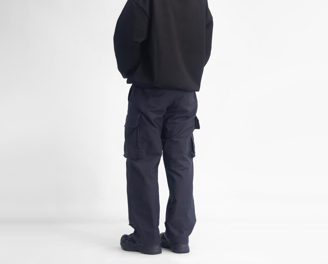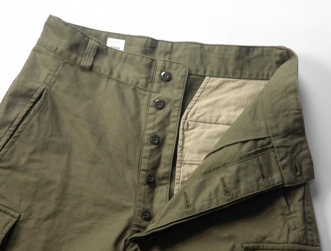 ARANから、フランス軍M-47カーゴ後期型を忠実に再構築した一本をご紹介。 仕立ての良さが評価される名作を、現代の空気感に寄り添う形で丁寧にアレンジしています。 深めの股上やボタンフライ、二重補強、大容量カーゴポケットなど、オリジナルを細部まで再現。 巻き縫いの縫製も相まって堅牢なつくりに仕上がっています。 裾までストンと落ちる中太のストレートで、無骨さの中に品の良さを感じるバランスの取れたライン。 密度高く織り上げた綿100%サージを採用し、硫化染めによるフェード感がミリタリーらしい生地。 ARANならではの上質な仕立てと実用性が共存し、日常に自然と馴染む一本です。