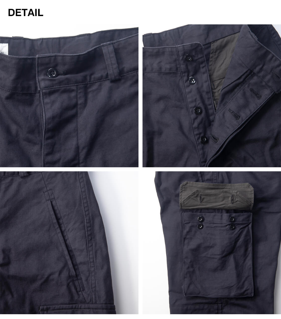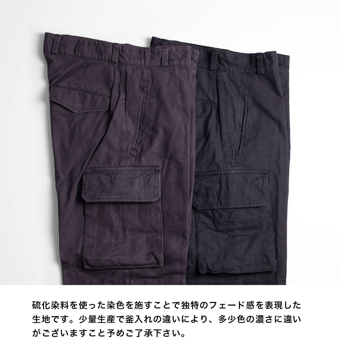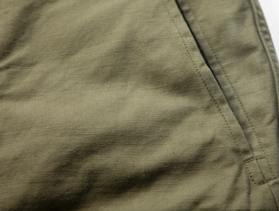 密度高く織り上げた綿100%サージを採用し、硫化染めによるフェード感がミリタリーらしい生地。