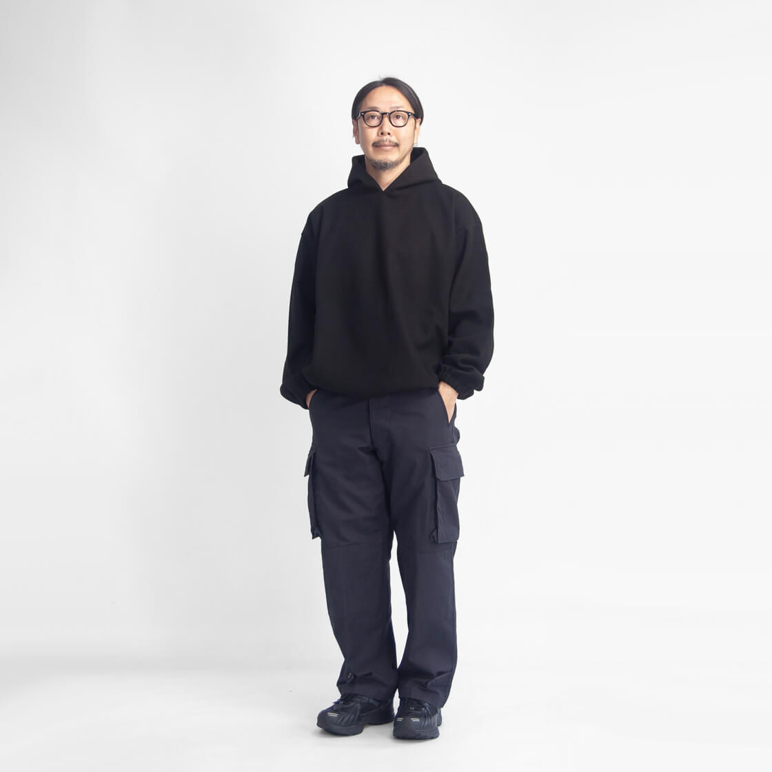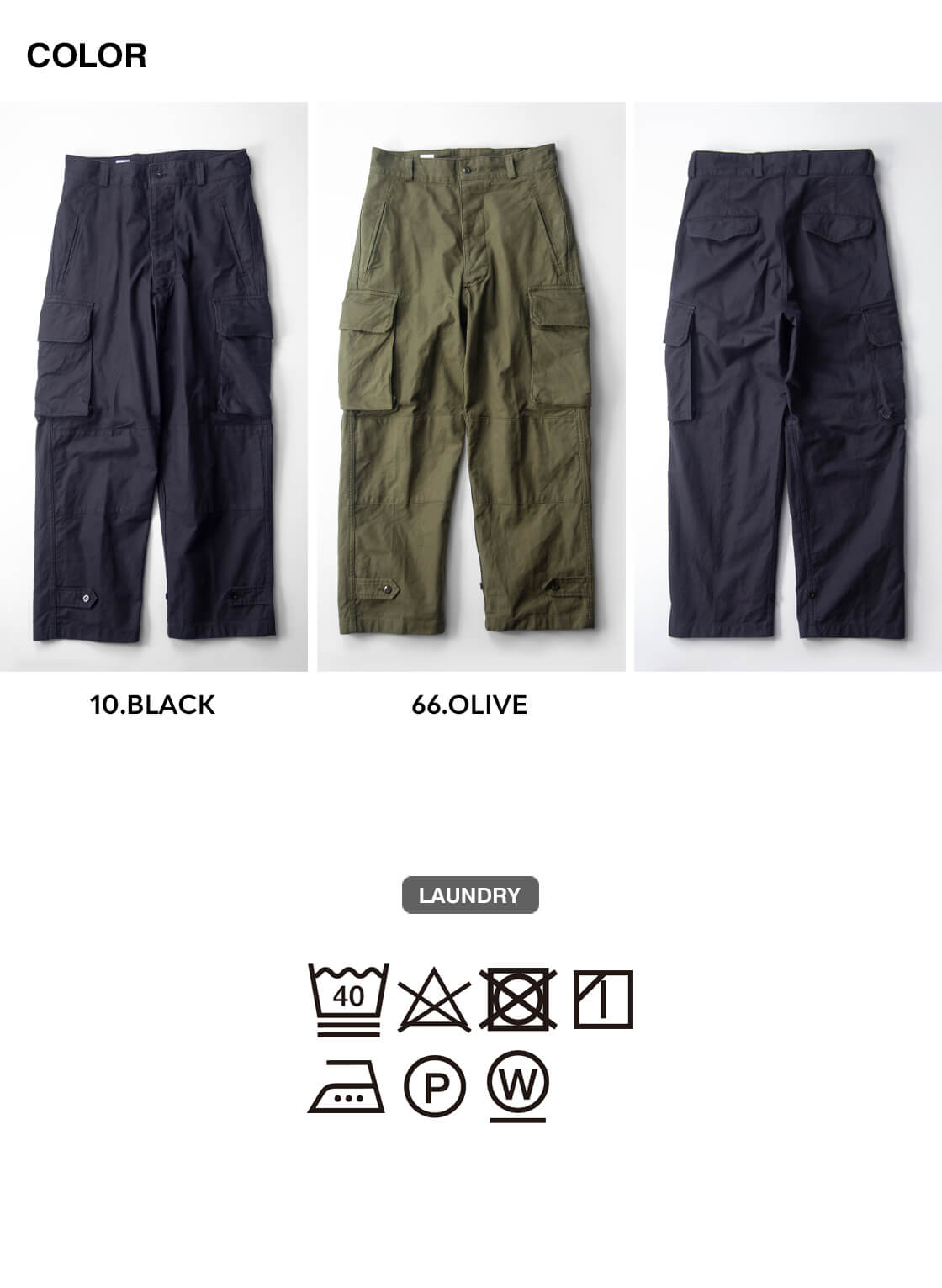 2 / ウエスト80 / レングス72 / 股上33 / ワタリ34 / 裾幅23 モデル着用 170cm/62kgで2サイズ 素材 綿100% カラー展開 ブラック、オリーブ 生産国 日本 モデル着用コメント 2サイズを着用しました。ウエストは2サイズで少し余裕のある着用感でベルトがあった方が心強い感じです。レングスは少しクッションするぐらいの長さで、短すぎず長すぎず丁度いい長さです。深めの股上&やや太目シルエットで窮屈感はありません。2サイズでも良いですが、3サイズにアップしてもう少しボリュームを出しても良いですね。 スタッフ着用コメント 3サイズを着用しました。ウエストは少し大きめなので、ベルトが必須です。股上は深めでウエストの固定位置にも寄りますが、レングスは靴を履いて気持ちクッションするぐらいの長さで個人的には丁度いい長さでした。全体的に太目なシルエットのカーゴパンツですが不思議と上品な印象も感じられる一本です。2サイズでも着用出来ますが、太い方が好みなので僕の場合、3サイズか4サイズが良いですね。 |