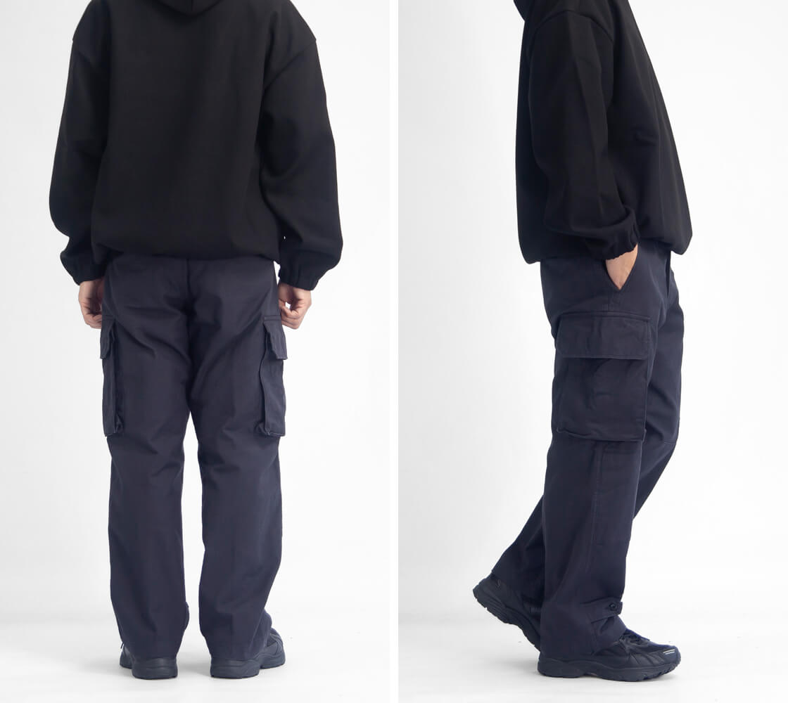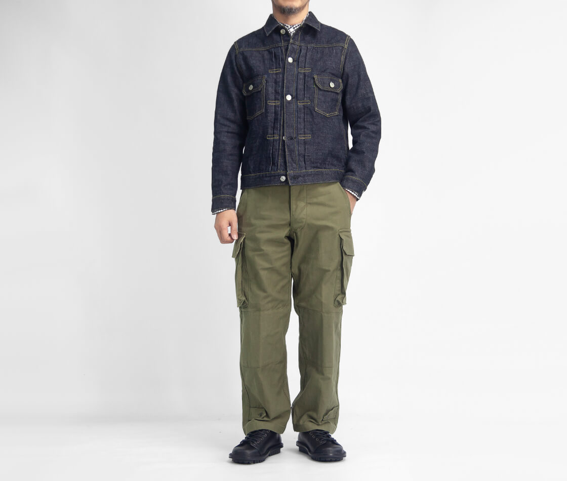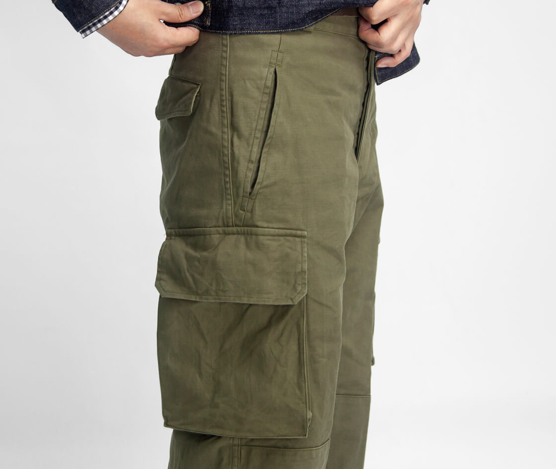 深めの股上やボタンフライ、二重補強、大容量カーゴポケットなど、オリジナルを細部まで再現。