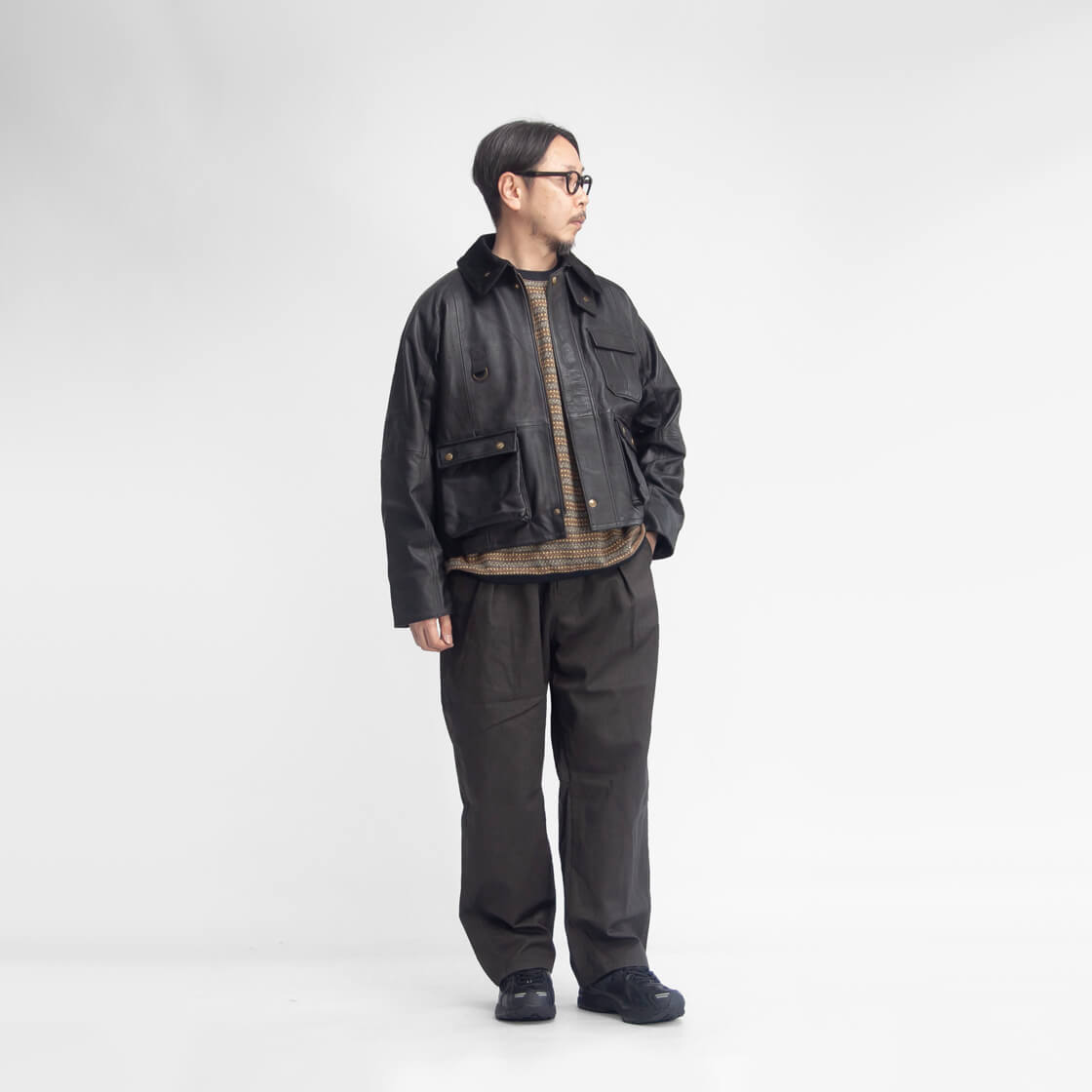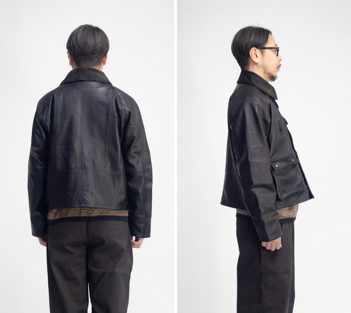 ![]() YOUSED - LEATHER FISHING JACKET ![]() ヨーロッパのレザー古着を解体し再構築したフィッシングジャケット。ボックス型のシルエットにショートな着丈が印象的な一着です。 このデザインを見て、「あ、知ってるよ」と思った方も多いはず。とあるブランドのショート丈のヴィンテージ・フィッシングジャケットをモチーフに、ヨーロッパの古着を解体し、再構築したレザーフィッシングジャケットです。このオールレザーのフィッシングジャケットはYOUSEDのイタリアンレザーシリーズの中の一つですが、ゆったりとしたボックスシルエットにショートな着丈が印象的な一着。使用しているのは、ユーズドレザーの中でも極力状態の良い部分のみ。だからこそ生まれるパーツごとの表情の違い。ツギハギのように組み合わされた切り替えは、単なるリメイクの痕跡ではなく、このジャケットの個性そのものです。 ![]() YOUSED(ユーズド) 厳選された世界中のビンテージウェアを解体し 「あなただけの」服をお届けします。 「エイジング」と「今」を融合させて生み出されるハーモニーは、 古着が持つ唯一無二の力強さ、 そして 洗練された遊び心で着る人を楽しく包み込みます。 長い年月を経ても新鮮で色あせない素材を「今」のパターンニングに落とし込み、 YOUSEDはあなたの日常に 新たな「いろどり」をもたらします。 ![]() 本格的なフィッシング仕様のデザインで説得力のある一着。 着丈はショートで軽快、腰位置が高く見えることでスタイルにメリハリが生まれ、動きやすさとスポーティーさを自然に両立します。胸元には無骨なD管リング。腰位置のポケットはマチ付きで立体的に設計され、視覚的なアクセントであると同時に、実用性もしっかり確保。さらに背面にはゲームポケットと呼ばれる大容量ポケットを搭載しています。本来は釣った魚や餌を入れるためのディテールですが、街でその用途に使うことはないはず。けれど、この圧倒的な収納力こそが魅力。バッグいらずで出かけられる安心感と、使い方を考える楽しさがあります。内ポケットも備え、合計5つのポケットを完備。デザインとしての完成度だけでなく、リアルな機能美を備えた本格的なフィッシング仕様というのが大きな魅力です。首元はコーデュロイ襟にチンストラップ付き。立てれば風の侵入をしっかりと防ぎ、袖口の内側にはリブを配して防風性を高めています。身頃の裏地にはシャンブレー生地、袖裏にはポリエステルタフタを使用。滑らかな袖通しで、ストレスなく羽織れる着心地も抜かりありません。 ![]() 身頃の裏地はシャンブレー生地、袖裏はポリエステルタフタで袖通しも滑らか。 ![]() しっとりして柔らかい、重すぎないイタリアンレザーを用いた本体。 イタリアンレザーを用いたヨーロッパの古着を解体しているわけなのですが、イタリアンレザーと言えば"バケッタ製法"。植物性タンニンをじっくり時間をかけて染み込ませながらなめしていくという伝統的な製法ですが、柔らかさと色の深みと艶がなんと言っても特徴的。オイルをたっぷり含んだ革はエイジングにより、より深みのある色と艶を手に入れるのですが、こちらは既にエイジングされた革。使い始めよりイタリアンレザー独特の艶が発せられているわけです。柔らかくて軽いレザーを用いているためオールレザーとは言え、着心地も快適です。 ![]() ![]() 身長170cm、体重62kgの男性が1サイズ着用。