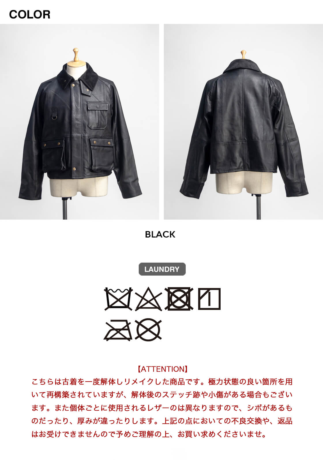 1 / 着丈58 / 身幅62 / 裄丈87 モデル着用 170cm/62kgで1サイズ 素材 表地(革100%) カラー展開 ブラック 生産国 パキスタン モデル着用コメント 1サイズを着用しました。身幅はゆったりとしたサイズ感でリラックスして着用出来ます。肩幅は関係ないラグランスリーブで突っ張った感じもありません。着丈はヒップ上部が少し隠れるぐらいのショートな長さです。2サイズになると袖が長くなるので、見た目にもやはり1サイズが良さそうです。 スタッフ着用コメント 2サイズを着用しました。身幅はワイドな作りで、ゆったりとしたサイズ感で着用出来ます。着用感は重すぎず、冬場の比較的厚手のものを着込んでも大丈夫なサイズ感です。サイズ1になると、着丈がかなり短か目になるので、2サイズの方が個人的には好みです。 ※こちらは古着を一度解体しリメイクした商品です。 極力状態の良い箇所を用いて再構築されていますが、解体後のステッチ跡や、画像にはない元素材のステッチ、小傷がある場合もございます。 また個体ごとに使用されるレザーは異なりますので、シボがあるものだったり、厚みが違ったりします。 上記の点においての交換や、返品はお受けできませんので予めご理解の上、お買い求めくださいませ。 |