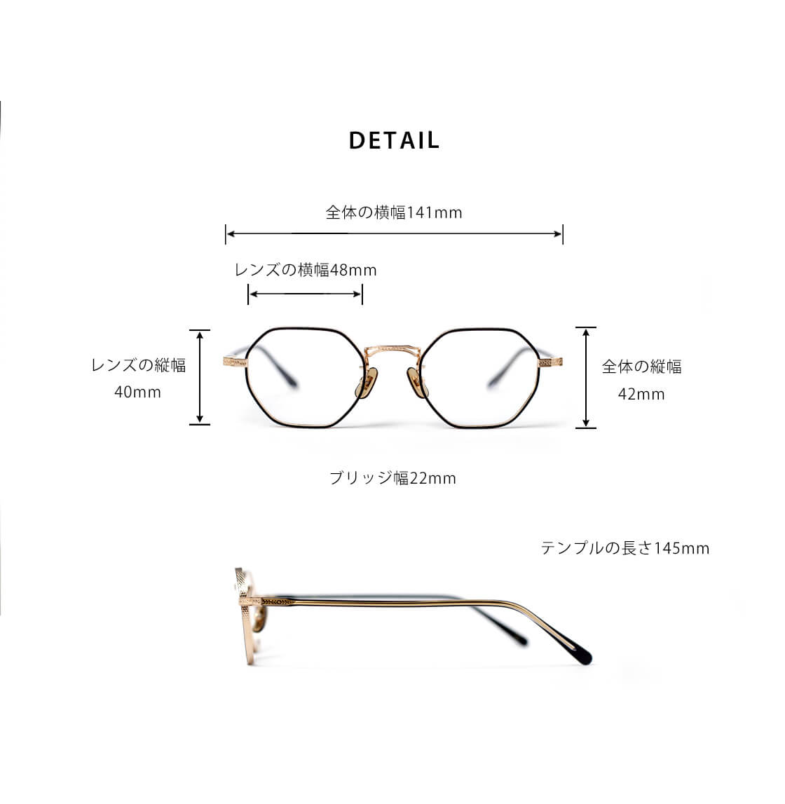 (FREE)/レンズ横幅48mm/レンズ縦幅40mm/全体の横幅 (フレーム込み)141mm/全体の縦幅(フレーム込み)42mm/ブリッジ幅22mm/テンプル長さ145mm