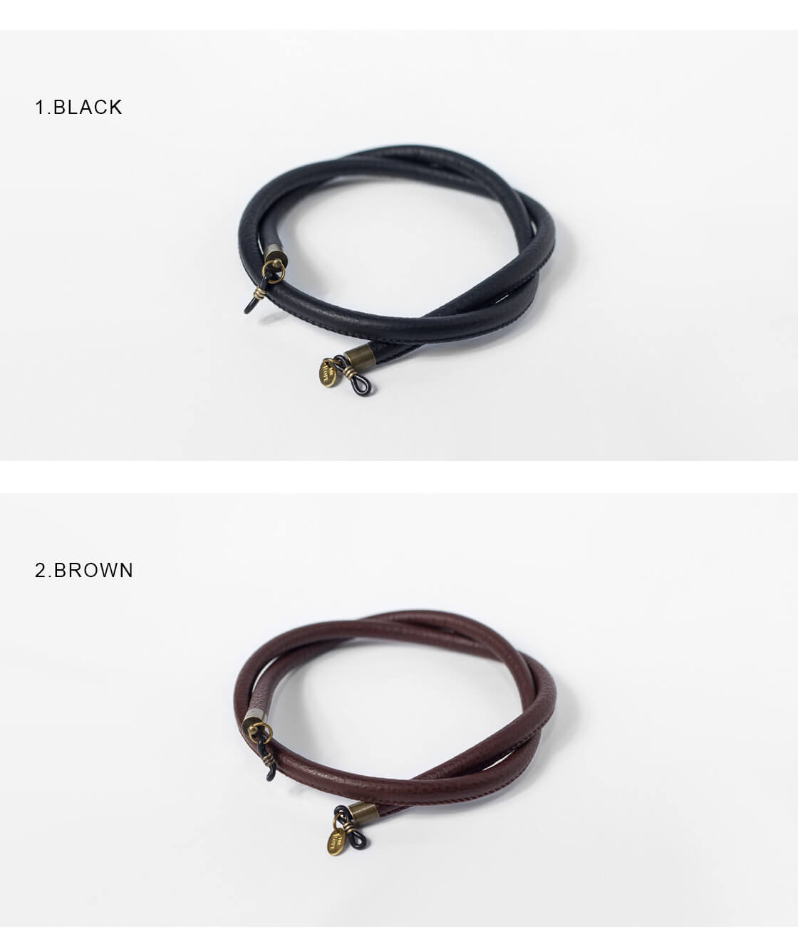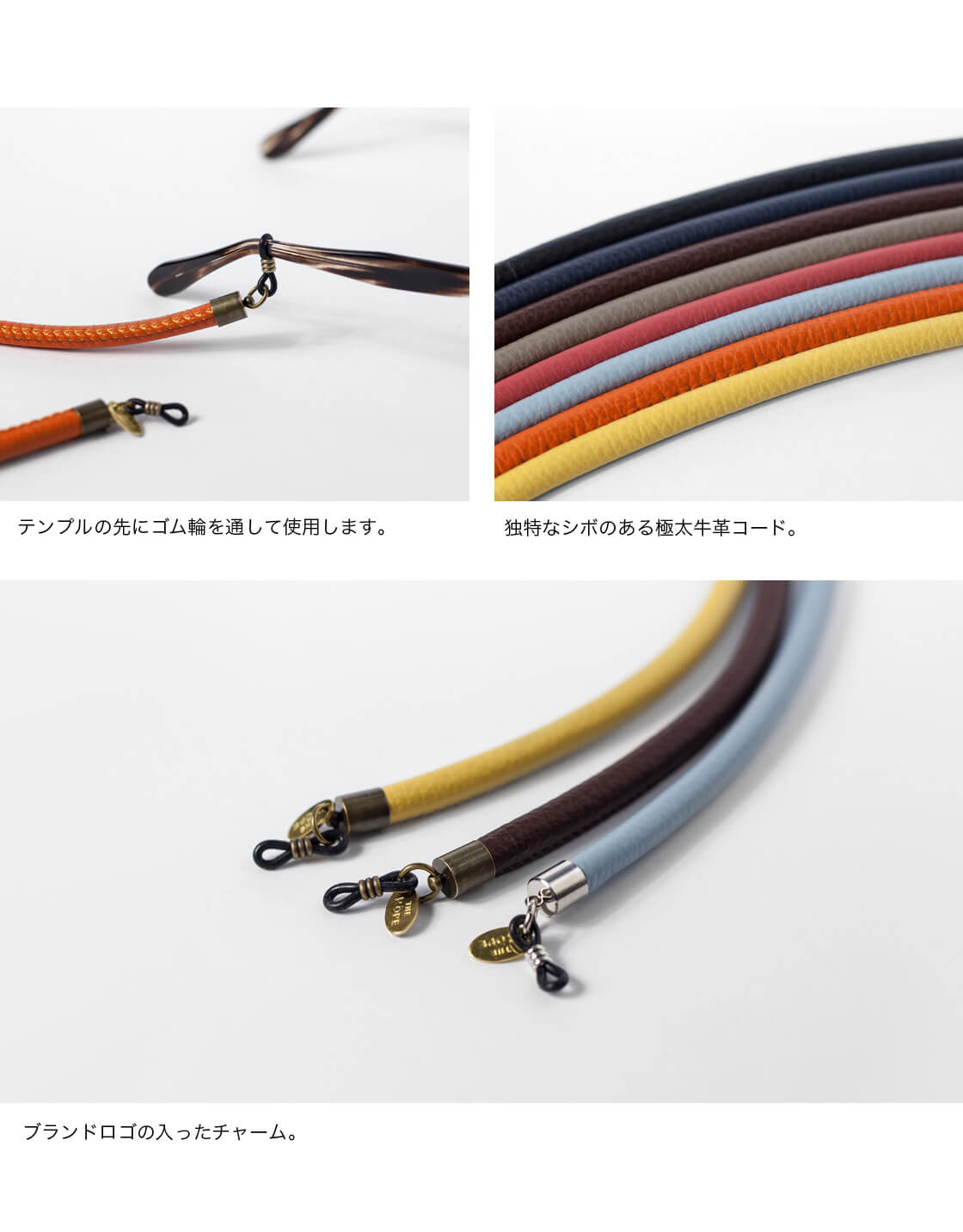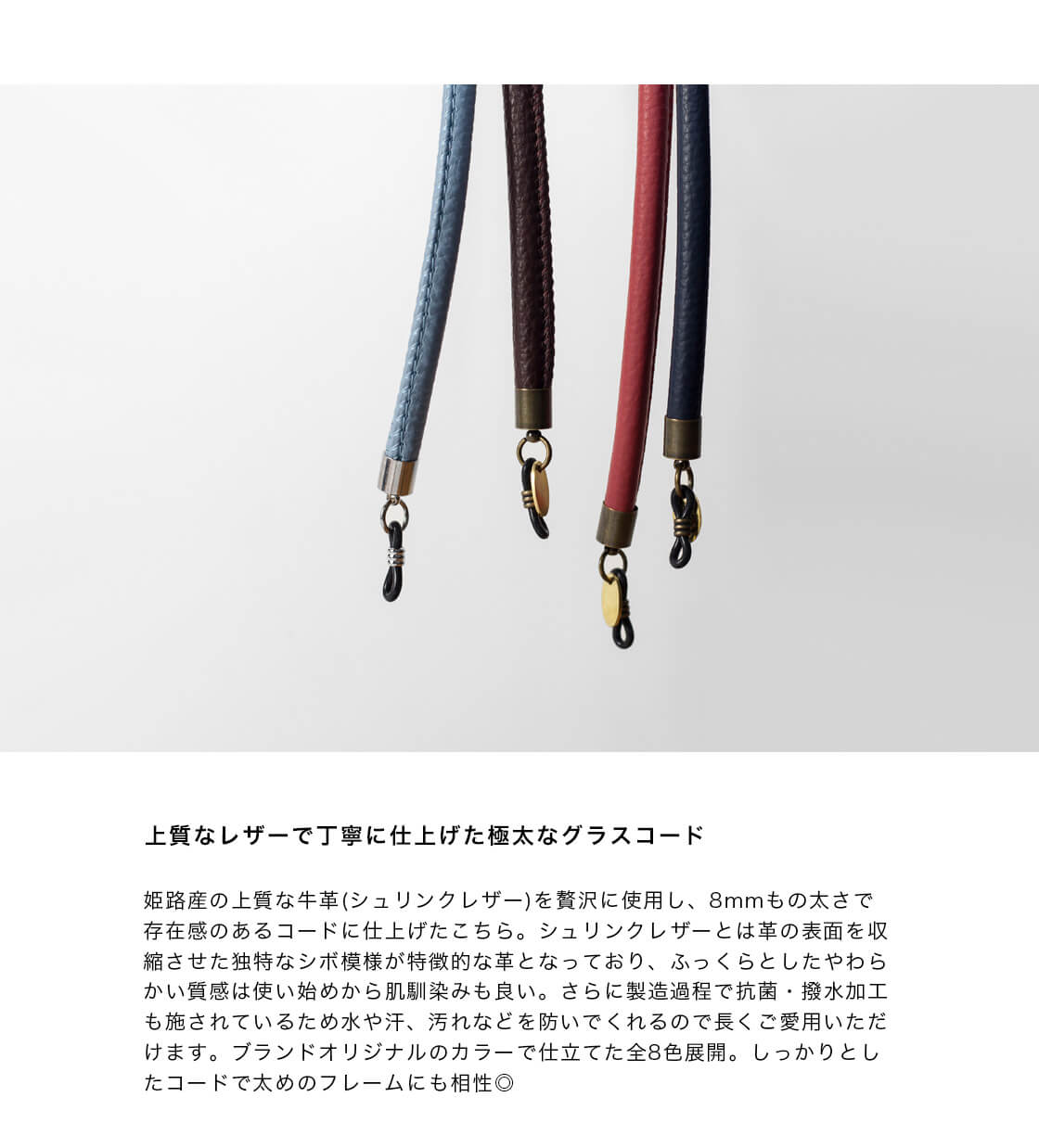 姫路産の上質な牛革(シュリンクレザー)を贅沢に使用した極太なコードが印象的なこちら。シュリンクレザーとは革の表面を収縮させた独特なシボ模様が特徴的な革となっており、ふっくらとしたやわらかい質感は使い始めから肌馴染みも良い。しっかりとしたコードで太めのフレームとも相性◎