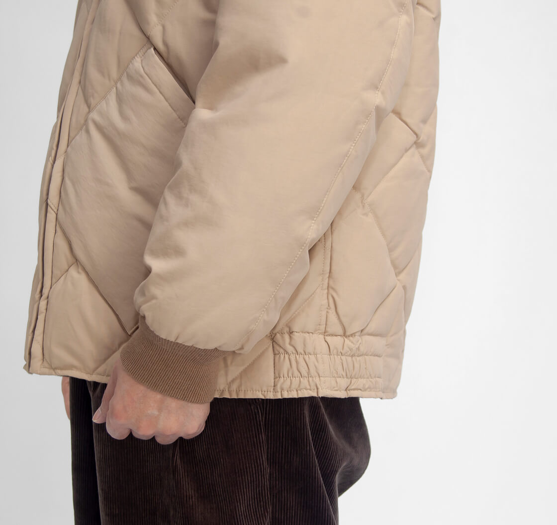 ![]() Eddie Bauer - JAPAN EDITION / SKYLINER ![]() 1936年に初めて作られた世界初のダウンジャケット「スカイライナー」を復刻させたクラシカルなダウンジャケット。 ![]() Eddie Bauer(エディー・バウアー) 1920年にアメリカ・シアトルでテニスショップとして誕生したEddie Bauer(エディーバウアー)。20年代にはインディアンニットを販売し、その後フィッシンググッズも販売。1936年には、ダウンジャケットとダウンパーカを発売。そのダウンジャケットは人気となり、売上で一番大きな比重を占めるようになります。エディー・バウアーはアメリカで初のダウンジャケット「スカイライナー」を作ったことで広く知られており、1953年にはアメリカK2ヒマラヤ遠征隊の依頼により完成したダウンウェア「カラコラム」を発表し、アメリカ初のエベレスト登山のダウン装備はすべて製作しているなど、アメリカを代表するアウトドアブランドとして世界中で多くの人々から今もなお愛されています。 ![]() ダイヤモンドキルティングにボンバージャケットデザインがトレードマーク。 エディー・バウアーのJAPAN EDITIONは、エディー・バウアーのアーカイブアイテムからインスピレーションを受け、より日本人のスタイルや感性に寄り添った形でアップデートし展開するコレクションです。そのエディー・バウアーJAPAN EDITIONから、1936年に初めて作られた世界初のダウンジャケット「SKYLINER(スカイライナー)」が復刻登場。「スカイライナー」は、エディー・バウアーのオリジナル商品の1つであり、エディー・バウアーが最初に特許を取得したダウンジャケット。MA-1を彷彿させるボンバージャケットデザインに、ダイヤモンドキルティングがトレードマーク。腰位置にはキルティングデザインに沿った大き目のポケット。首裏には1940〜60年代に使われていた"日の出タグ"を忠実に再現。前立てのファスナーは、60〜80年代に見られた"デカTALON"を思わせる無骨な真鍮ジッパーを採用し、ヴィンテージ好きにはたまらないディテールが満載です。袖口は編みピッチを変えた段リブ仕様でクラシックなムードを強調。一方でシルエットは、オリジナルの武骨さを残しながらも、現代的に整えたレギュラーフィット。ゆったりしすぎず細すぎない、現代のスタイルにフィットします。 ![]() 充填している羽毛は700フィルパワーのかさ高さを持つダックダウン。 本体に充填している羽毛は700フィルパワーのかさ高さを持つダックダウン。フィルパワーとは羽毛の膨張する数値みたいなものですが、大体500を超えてくると質の良いダウンかなぁといった印象です。700のフィルパワーだと、街中で使用するような一般的なダウンジャケットやコートであれば十二分。ダウン量はやや控えめですが、着膨れ感が抑えられているのでダウンジャケットと言えどもスッキリと着用出来ます。 ![]() コットン60%、ナイロン40%のバランスでクラシックな雰囲気のコットンナイロンの表地。 表地に用いているのは、コットン60%、ナイロン40%のバランスで混紡しているコットンナイロンの生地。お気づきの方も多いかと思います、いわゆる60/40(ロクヨン)クロスと同じ、アウトドアウェアの世界で長く支持されてきた黄金比ですね。コットンが湿気を含むと膨張する性質を持ち、生地の目が詰まって水や風の侵入を防ぐというのが最大の特徴。そしてコットン特有の自然なマット感・温かみのある風合い・ナイロン由来の耐久性・摩耗耐性があり、見た目のクラシックさと、タフな性能がポイント。ナイロン100%と違い、コットンのアタリやパッカリングが広がり、着込むほどに表情が増す、経年で"味が出る"生地感というのも長く愛されてきた理由です。 ![]() ![]() 身長170cm、体重62kgの男性がLサイズ着用。