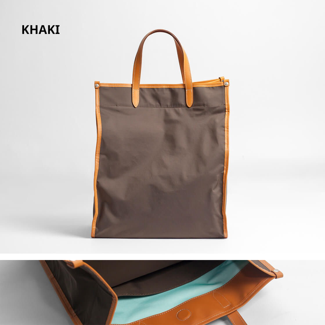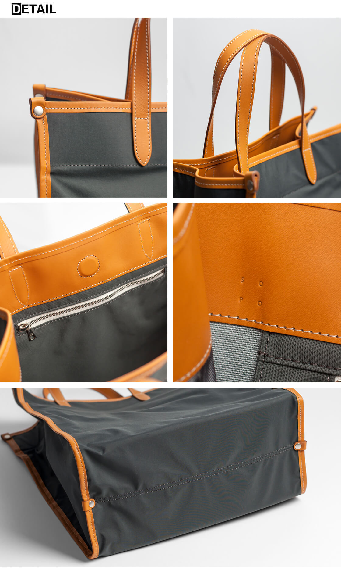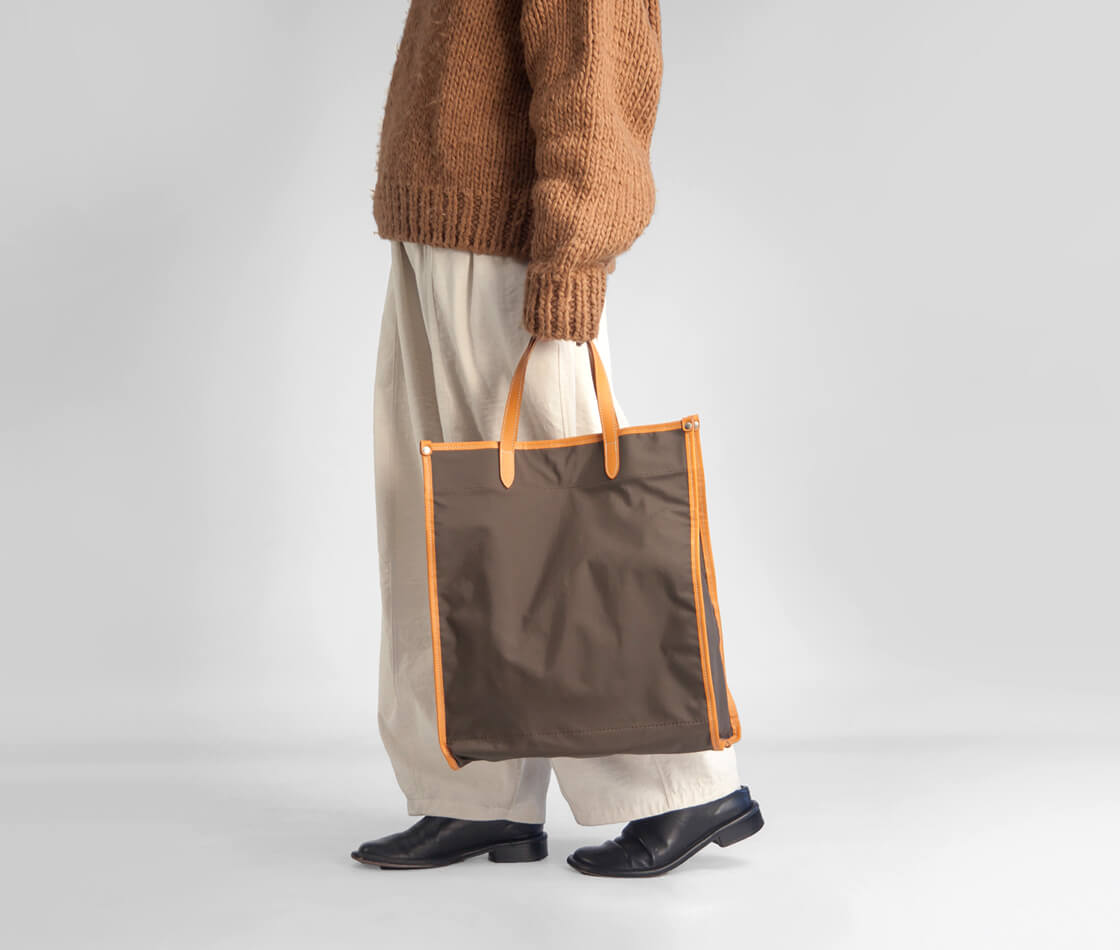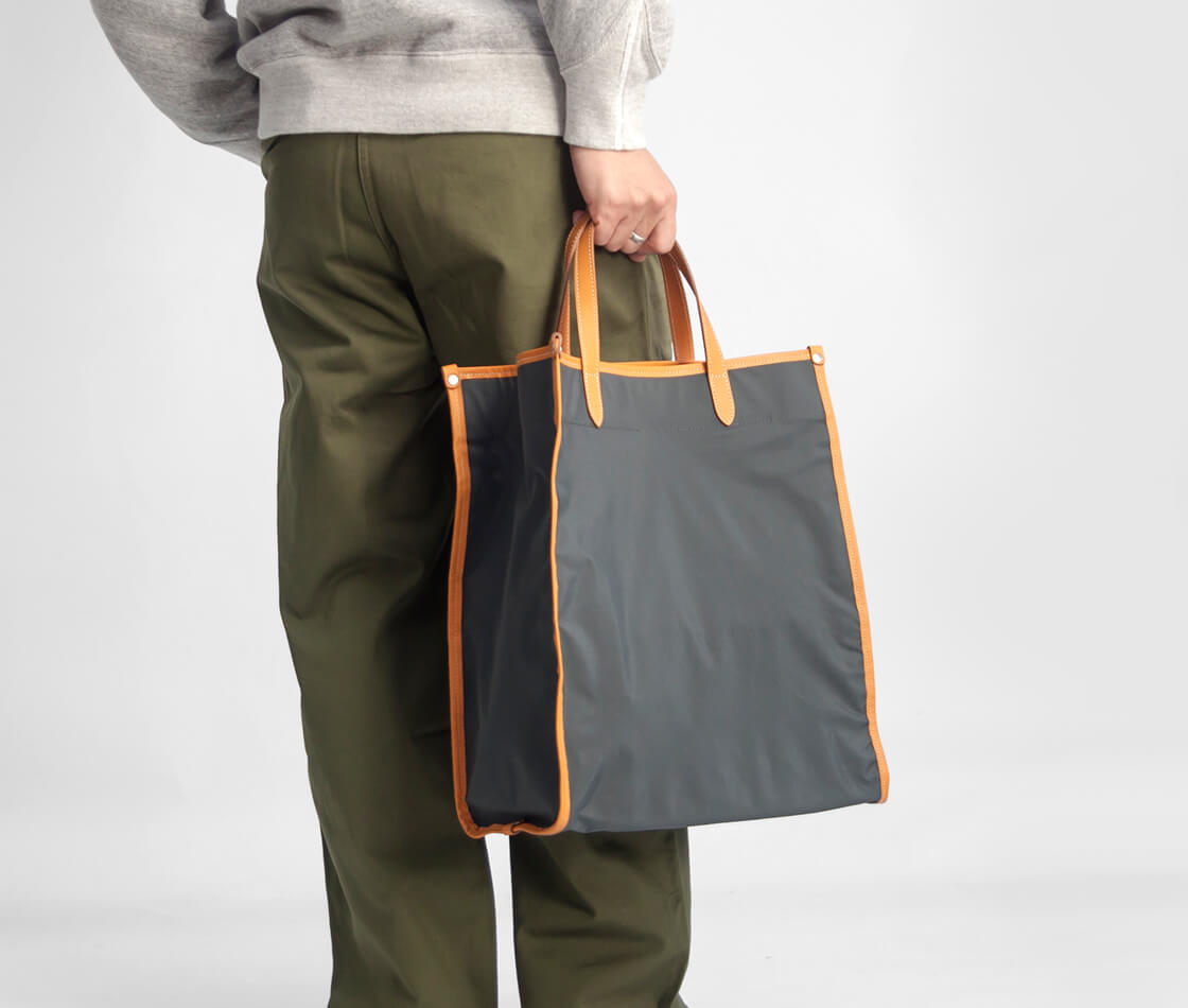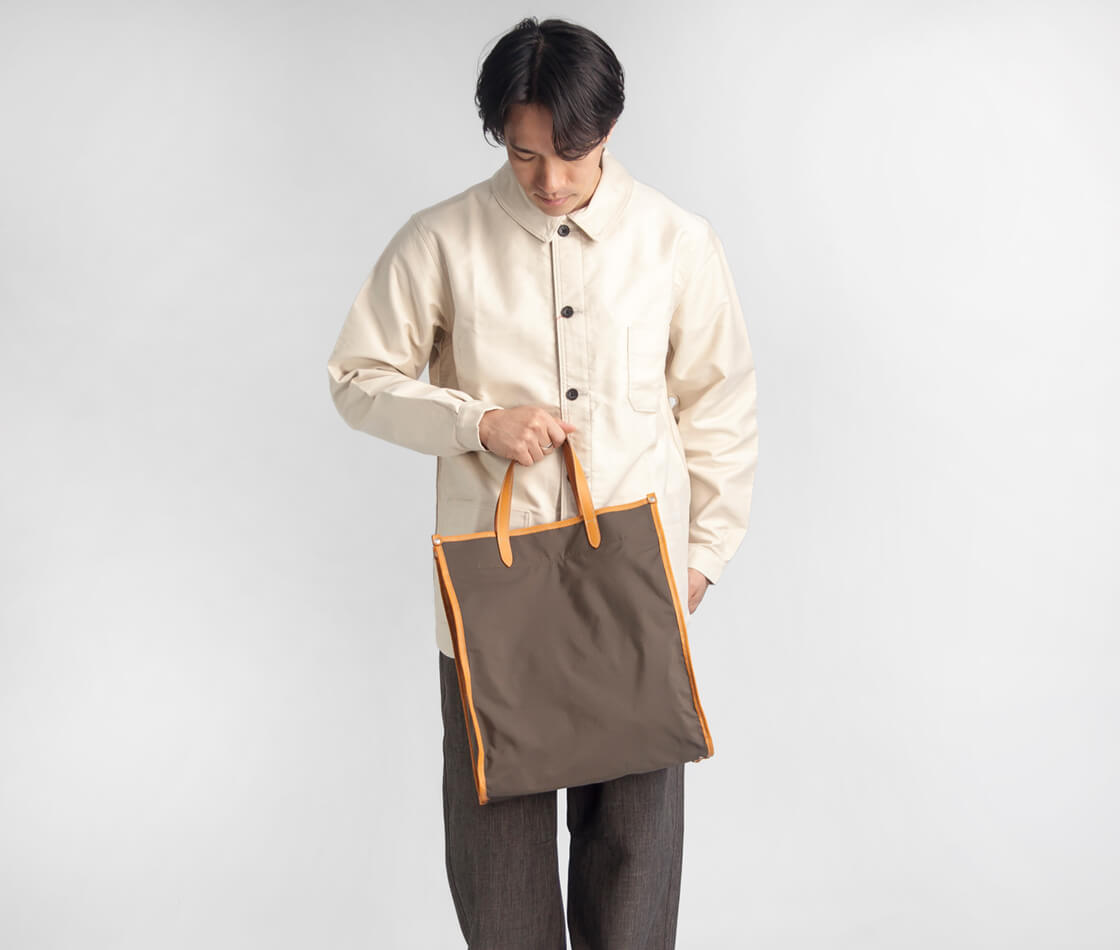 SOPOから3層構造の防水透湿ナイロンとキップレザーパイピングを組み合わせた軽量トートバッグをご紹介。