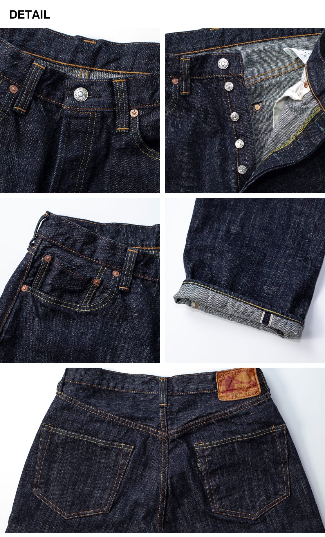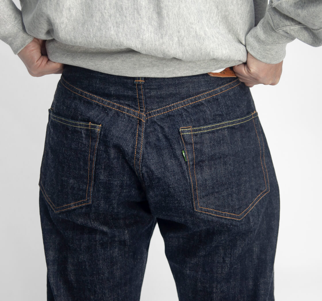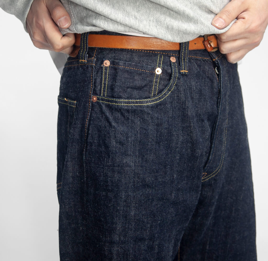 ボタンフライ、むき出しリベット、鹿革パッチなどクラシック仕様を踏襲。