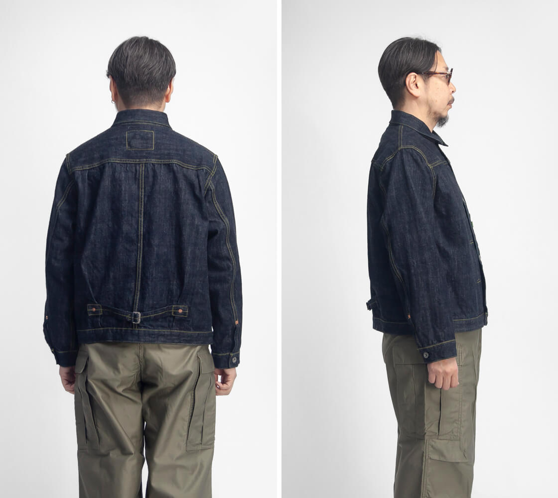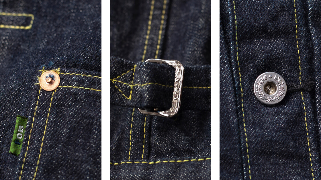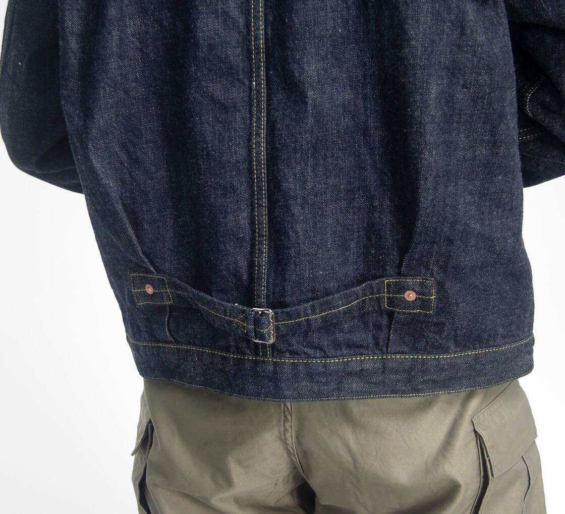プリーツやシンチバック、月桂樹ボタンなど大戦モデルのディテールと、洗い後にはパッカリングが生まれるヴィンテージライクな表情も魅力です。