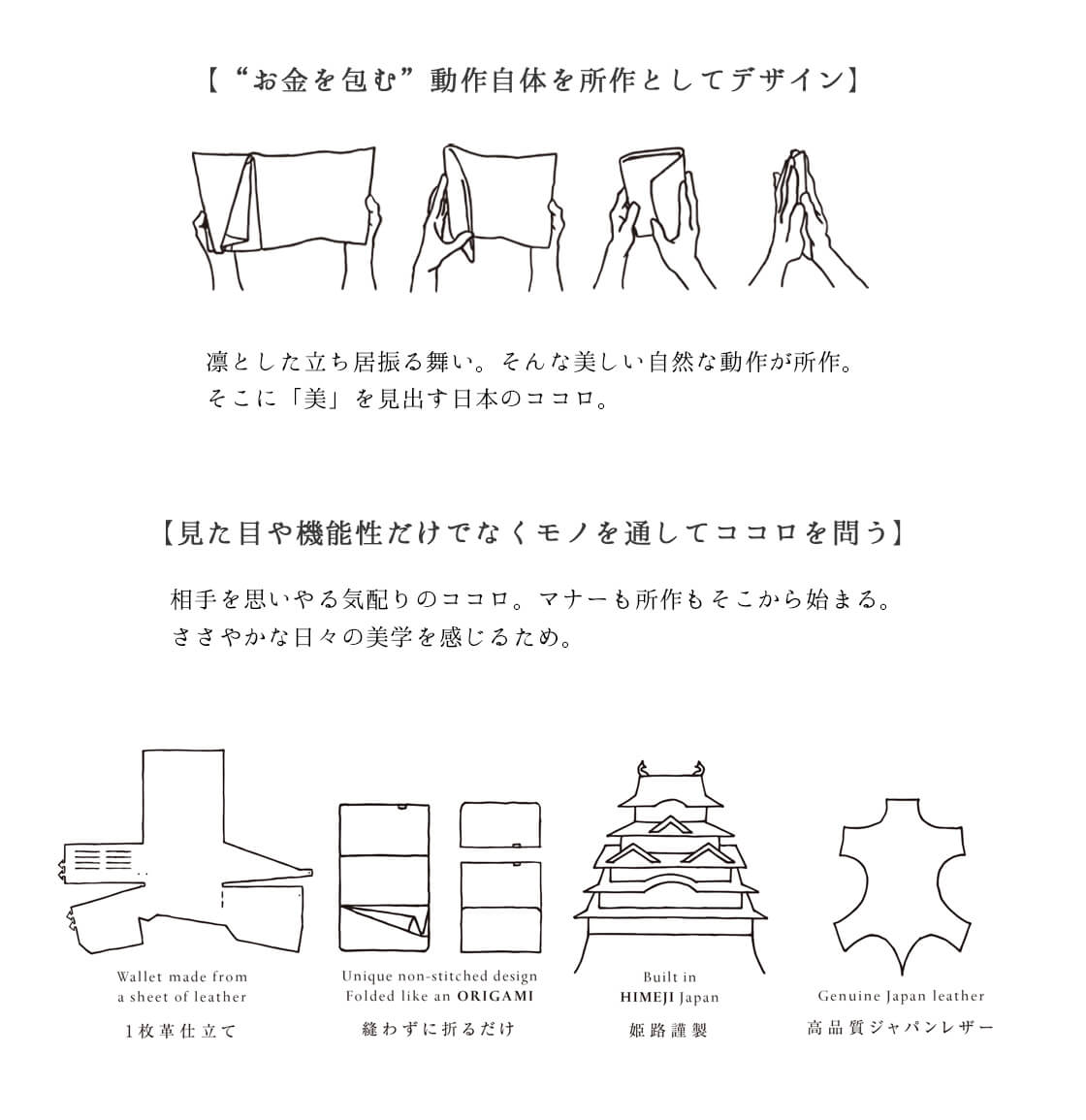![]() 所作 カードケース TARO ![]() 現代アートを思わせる柄が目を引く所作のカードケース。 結婚式などでお祝いを包む1枚の布「袱紗(ふくさ)」がモチーフとなった所作のカードケース。黒地に現代アートの巨匠を思わせるような柄をデボス加工で施したデザイン。凹凸で表現されたデザインが目を引くだけでなく手触りも楽しいシリーズです。 ![]() 所作 Shosa(ショサ) 兵庫県姫路市で一点ごとに作り上げられる、日本のレザーブランド「所作/ショサ」。結婚式などでお祝いを包む1枚の布「袱紗(ふくさ)」をモチーフに、贈答品を包む古い様式 「折形」の折り重なりをデザインに落とし込み、中身を取り出す際の仕草や動作などの「所作」を 美しくみせるアイテムを展開。この袱紗シリーズ以外にも、ワンアクションで開閉するCPシリーズもあり、1枚革を折り紙の様に縫わずに折って仕立てる技法が大きな特徴です。 ![]() ![]() ![]() 姫路産の堅牢な牛革に、抽象的ながら力強い凹凸 素材には皮革産業の盛んな兵庫県姫路産の成牛の革である肉厚で堅牢なステアハイドを1枚革で贅沢に採用。日本の職人が通常の革よりも時間を掛けて植物由来の成分によって仕上げられる革質はそのクオリティの高さもお墨付き。革の小傷や毛穴を消すラッカー加工などの後加工をあえて行わず革本来の風合いをそのまま生かし、魅力の1つとしている点もこのアイテムのこだわりです。 ![]() 日本伝統の「折形」のデザイン、絶対に緩まないハードロックナット 贈答品を包む日本伝統の様式「折型」を元に、紙が折り重なるというデザインにて仕上げられたカードケースタイプで、ファスナーやボタン、さらには縫製などを用いることなくボルトとナットで1ヶ所のみを固定しただけというシンプルで無駄のない美しい作りが特徴です。ちなみにそのナットについても「絶対に緩まないナット」として知られ、建築や宇宙開発の分野でも使用されているハードロックナットを使用。 ![]() 一番奥のカードポケットはお札入れとしても使用することが出来ます。 ![]() カードの収納ポケットは2つあり、それぞれ10枚程度の名刺を収納する事が可能です。 ![]() ![]() ![]() ![]() ![]() ![]() 専用ケース入りなのでギフトなどのプレゼントにもオススメ。 ![]() |