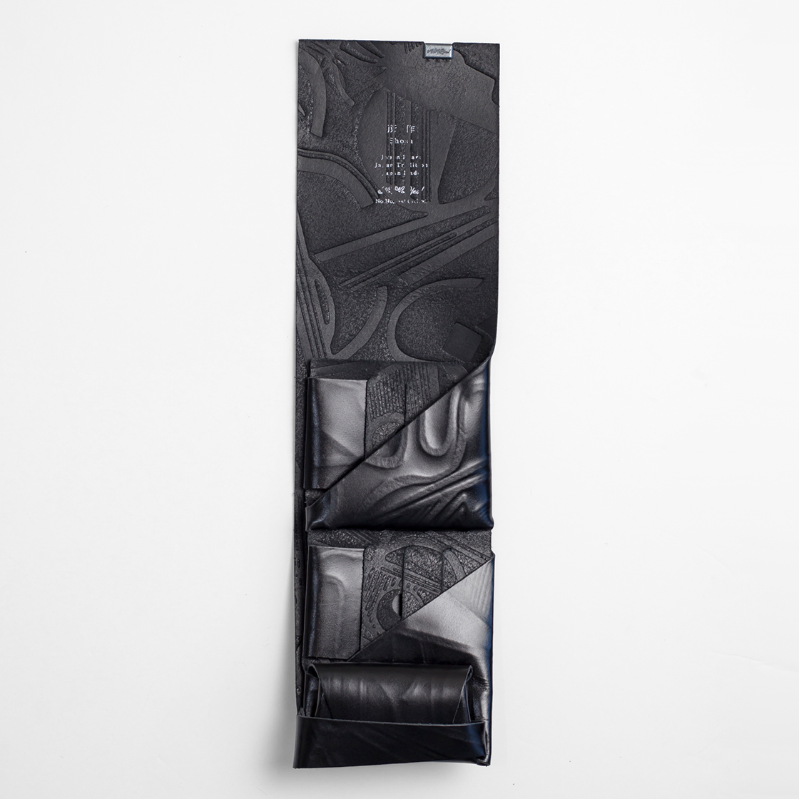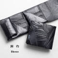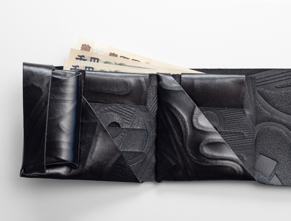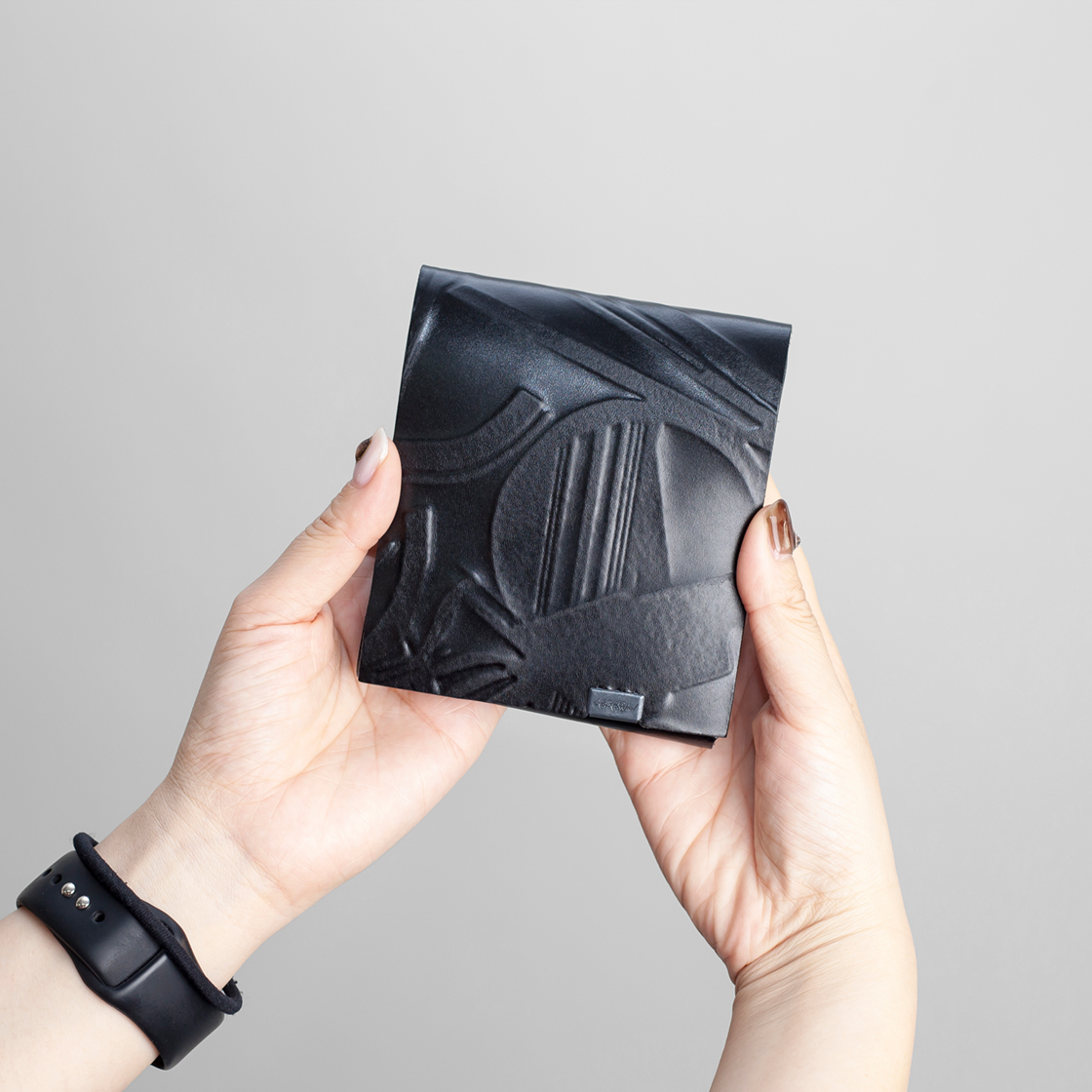 結婚式でお祝いを包む袱紗をモチーフに、折形の重なりをデザインへ落とし込んだシリーズより、 黒地に現代アートを思わせる抽象的な柄をデボス加工で施し、凹凸による立体感と手触りの楽しさを備えた三つ折り財布「ショートウォレット2.0 TARO」をご紹介。 閉じているときも開いたときも表情が変わり、有機的な線や丸い部分は指で触れたくなる魅力があります。 素材は姫路産ステアハイドを使用。 植物由来の成分で丁寧に仕上げ、革本来の風合いを活かしています。 縫製やボタンを用いず、唯一固定する部分にはハードロックナットを採用。シンプルで無駄のない美しい構造です。 大きく開く札入れ、6枚収納可能なカードポケット、取り出しやすいマチ付きコインポケットを搭載。 専用ケース入りでギフトにも最適な一点です。