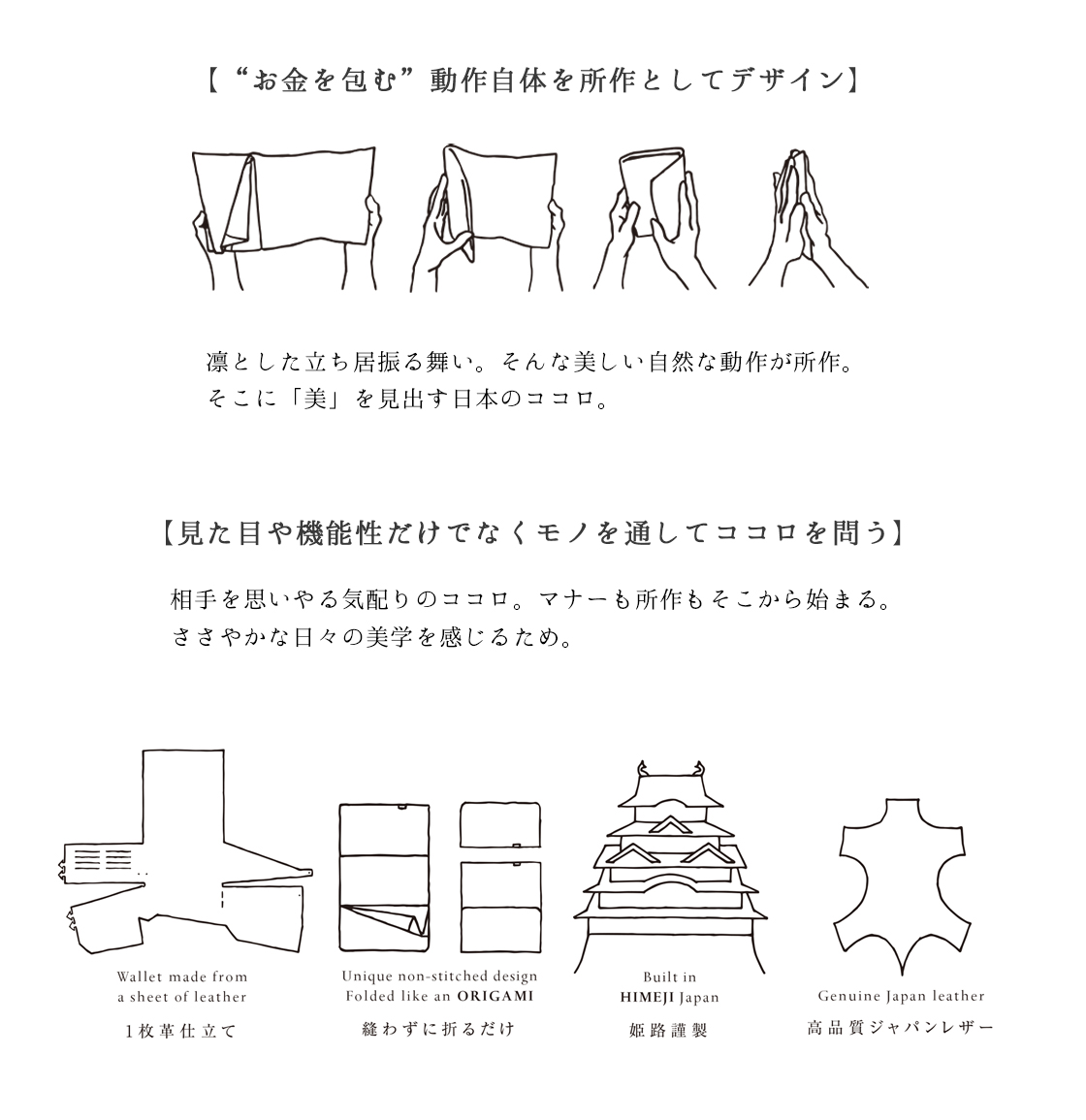![]() 所作 ショートウォレット2.0 TARO ![]() 現代アートを思わせる柄が目を引く所作の三つ折り財布。 結婚式などでお祝いを包む1枚の布「袱紗(ふくさ)」がモチーフとなった所作のショートウォレット2.0。黒地に現代アートの巨匠を思わせるような柄をデボス加工で施したデザイン。凹凸で表現されたデザインが目を引くだけでなく手触りも楽しいシリーズです。 ![]() 所作 Shosa(ショサ) 兵庫県姫路市で一点ごとに作り上げられる、日本のレザーブランド「所作/ショサ」。結婚式などでお祝いを包む1枚の布「袱紗(ふくさ)」をモチーフに、贈答品を包む古い様式 「折形」の折り重なりをデザインに落とし込み、中身を取り出す際の仕草や動作などの「所作」を 美しくみせるアイテムを展開。この袱紗シリーズ以外にも、ワンアクションで開閉するCPシリーズもあり、1枚革を折り紙の様に縫わずに折って仕立てる技法が大きな特徴です。 ![]() ![]() ![]() 姫路産の堅牢な牛革に、抽象的ながら力強い凹凸 素材には皮革産業の盛んな兵庫県姫路産の成牛の革である肉厚で堅牢なステアハイドを1枚革で贅沢に採用。日本の職人が通常の革よりも時間を掛けて植物由来の成分によって仕上げられる革質はそのクオリティの高さもお墨付き。革の小傷や毛穴を消すラッカー加工などの後加工をあえて行わず革本来の風合いをそのまま生かし、魅力の1つとしている点もこのアイテムのこだわりです。 ![]() 日本伝統の「折形」のデザイン、絶対に緩まないハードロックナット 贈答品を包む日本伝統の様式「折型」を元に、紙が折り重なるというデザインにて仕上げられた三つ折り財布タイプで、ファスナーやボタン、さらには縫製などを用いることなくボルトとナットで1ヶ所のみを固定しただけというシンプルで無駄のない美しい作りが特徴です。ちなみにそのナットについても「絶対に緩まないナット」として知られ、建築や宇宙開発の分野でも使用されているハードロックナットを使用。 ![]() ![]() ![]() ![]() 大きく開く札入れは出し入れがスムーズで快適。 ![]()