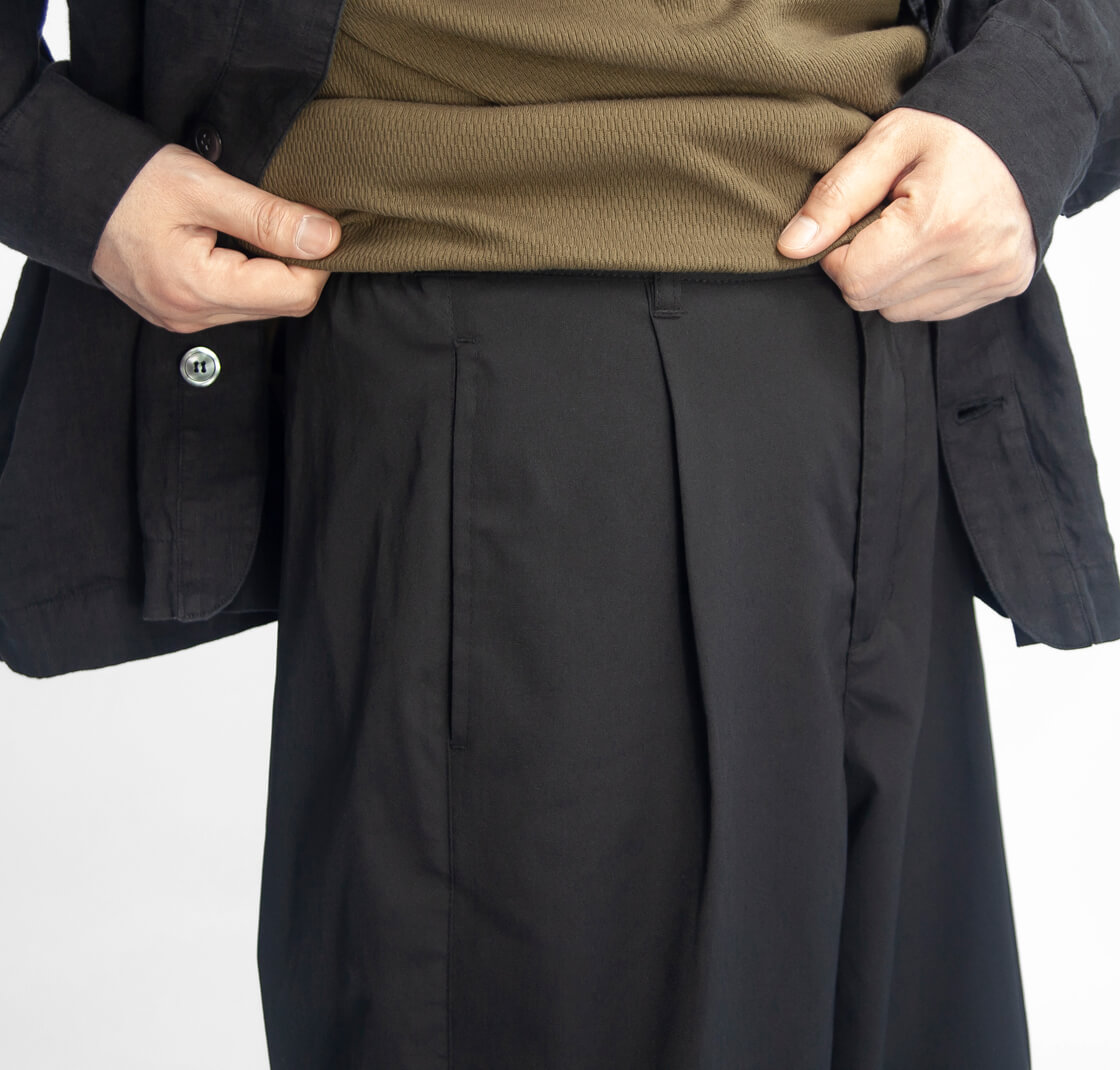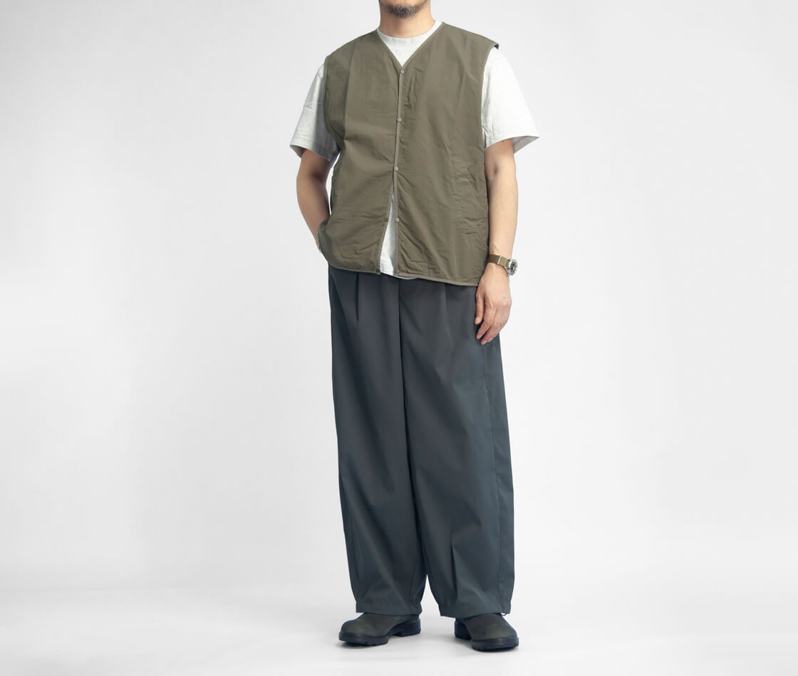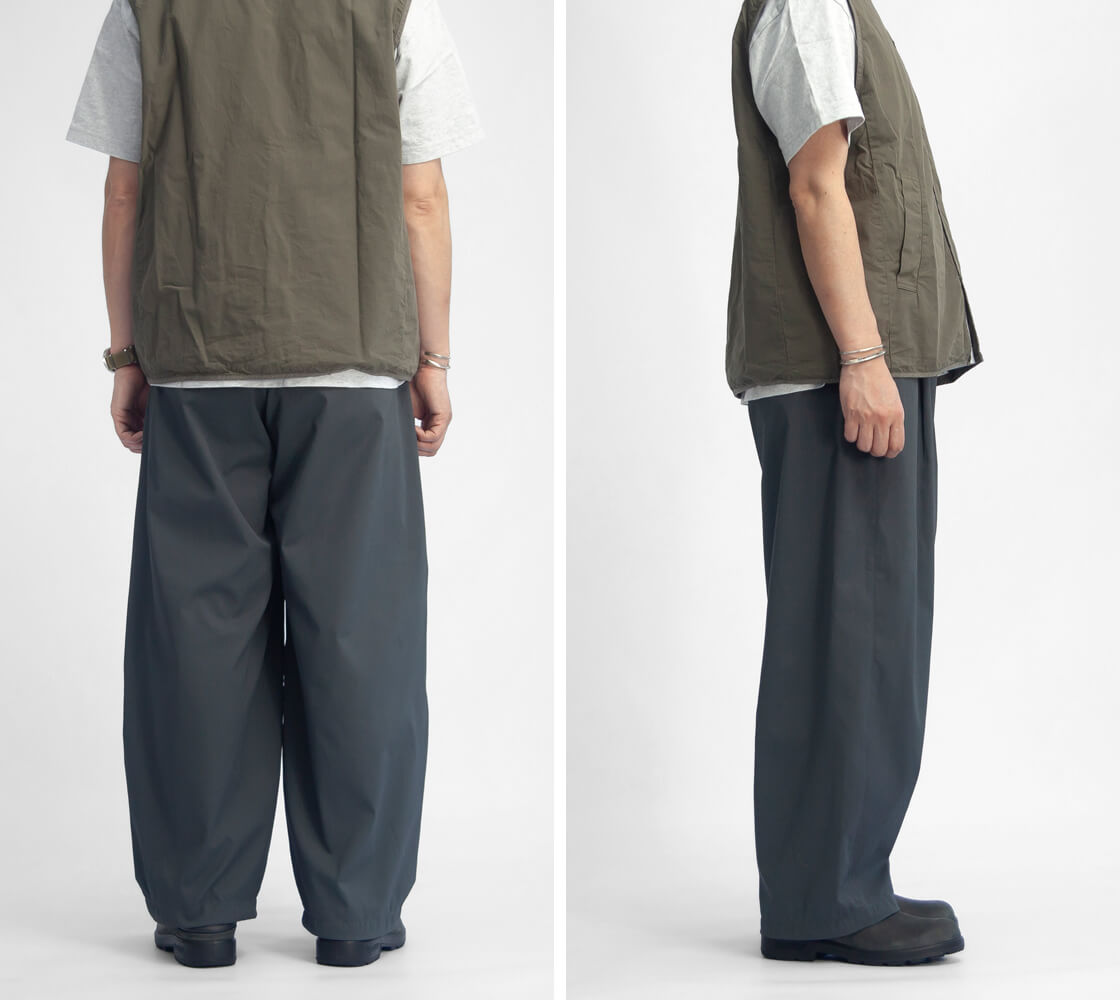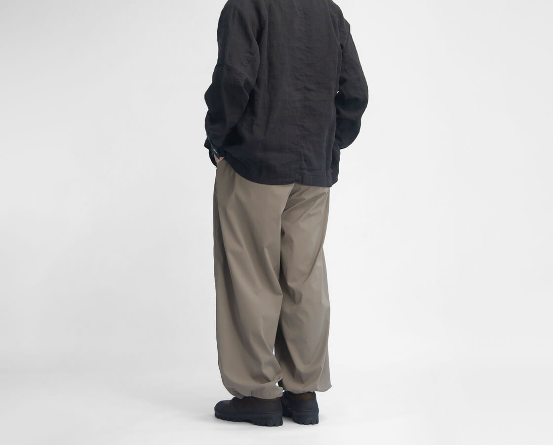 ![]() LAOTOUR - Air Dry Curved Easy Pants ![]() 真夏でも、軽やかに、涼しくショートパンツ感覚で穿ける、ドライで超軽量なイージーカーブドパンツ。 ![]() ワイドで丸み、抜け感のあるカーブドシルエット、裾のコードで絞りも効かせられる。 ドライで超軽量、吸水・速乾性に優れた機能素材を用いた当店オリジナル「LAOTOUR」のカーブドイージーパンツ。まず体感していただきたいのは、その軽さ。穿いていることを忘れるほどの軽快さと、濡れてもすぐに乾くドライな質感が、真夏の暑さの中でも快適さをキープ。ショートパンツ代わりに穿いていただきたい一本です。そして特徴なのは素材だけでなく、腿から裾にかけてカーブを描いた、バレル(樽)のようなシルエット。たっぷりとしたワタリと自然なドレープが生むリラックス感に、裾のドローコードを絞ることで、軽快なバルーンシルエットへと変化。このわたり幅のボリュームとドレープのあるゆるさ、裾を絞れる軽快さが、独特の存在感と身体の動きに制約を与えない快適な着心地を実現しているわけです。そして深めのワンタックで腰まわりにゆとりを持たせ、後ろウエストにはゴムを内蔵したセミイージー仕様。前開きはファスナー付き、ベルトループも備え、タックインも様になる設計に。バックは片玉縁ポケットで、すっきりとした印象に仕上げています。 ![]() 軽さと清涼感をまとう、ドライポリエステル。 本体に用いているのは、超軽量でありながら、汗や湿気を素早く吸収し、生地全体へと拡散させて一気に乾かす高い吸水速乾性を備えたポリエステル100%素材。繊維自体が水分を抱え込みにくいため乾きが非常に早く、蒸れやベタつきを抑え、常にドライな着心地を保ちます。さらにシワになりにくく、型崩れしにくいイージーケア性も魅力。軽量でありながら耐久性にも優れ、デイリーからアクティブなシーンまで頼れる存在です。肌離れの良いシャリ感と清涼感のあるタッチが、真夏でもストレスのない快適さを持続させます。 ![]() ![]() 身長170cm、体重62kgの男性がMサイズ着用。