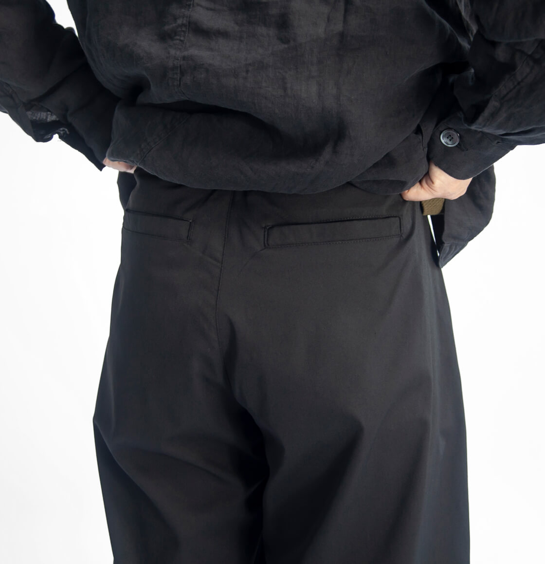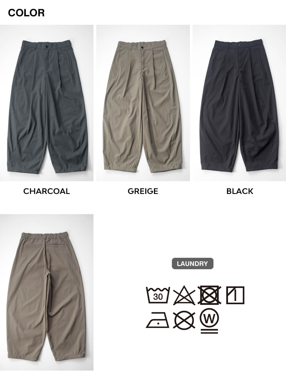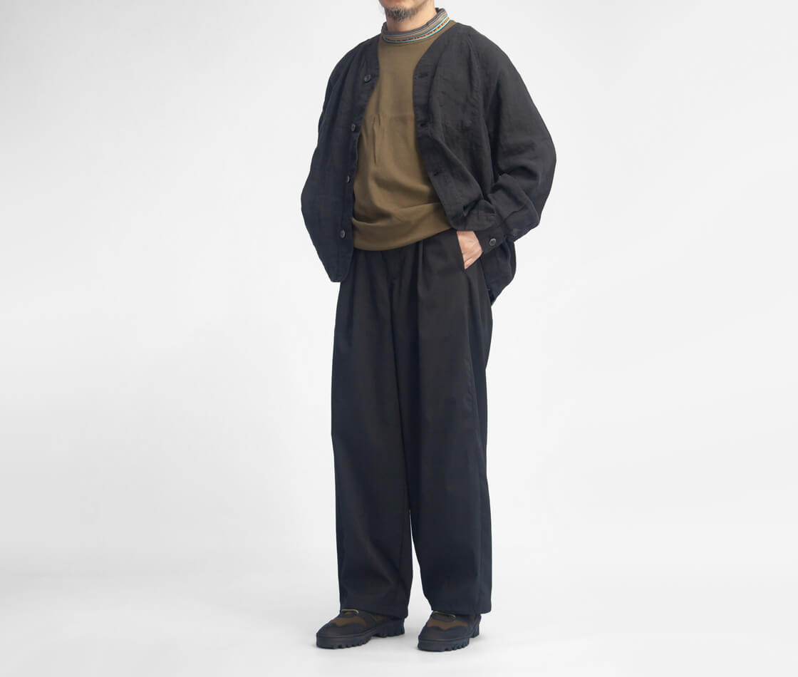 ![]() LAOTOUR - Air Dry Curved Easy Pants ![]() 真夏でも、軽やかに、涼しくショートパンツ感覚で穿ける、ドライで超軽量なイージーカーブドパンツ。 ![]() ワイドで丸み、抜け感のあるカーブドシルエット、裾のコードで絞りも効かせられる。 ドライで超軽量、吸水・速乾性に優れた機能素材を用いた当店オリジナル「LAOTOUR」のカーブドイージーパンツ。まず体感していただきたいのは、その軽さ。穿いていることを忘れるほどの軽快さと、濡れてもすぐに乾くドライな質感が、真夏の暑さの中でも快適さをキープ。ショートパンツ代わりに穿いていただきたい一本です。そして特徴なのは素材だけでなく、腿から裾にかけてカーブを描いた、バレル(樽)のようなシルエット。たっぷりとしたワタリと自然なドレープが生むリラックス感に、裾のドローコードを絞ることで、軽快なバルーンシルエットへと変化。このわたり幅のボリュームとドレープのあるゆるさ、裾を絞れる軽快さが、独特の存在感と身体の動きに制約を与えない快適な着心地を実現しているわけです。そして深めのワンタックで腰まわりにゆとりを持たせ、後ろウエストにはゴムを内蔵したセミイージー仕様。前開きはファスナー付き、ベルトループも備え、タックインも様になる設計に。バックは片玉縁ポケットで、すっきりとした印象に仕上げています。 ![]() 軽さと清涼感をまとう、ドライポリエステル。 本体に用いているのは、超軽量でありながら、汗や湿気を素早く吸収し、生地全体へと拡散させて一気に乾かす高い吸水速乾性を備えたポリエステル100%素材。繊維自体が水分を抱え込みにくいため乾きが非常に早く、蒸れやベタつきを抑え、常にドライな着心地を保ちます。さらにシワになりにくく、型崩れしにくいイージーケア性も魅力。軽量でありながら耐久性にも優れ、デイリーからアクティブなシーンまで頼れる存在です。肌離れの良いシャリ感と清涼感のあるタッチが、真夏でもストレスのない快適さを持続させます。 ![]() ![]() 身長170cm、体重62kgの男性がMサイズ着用。