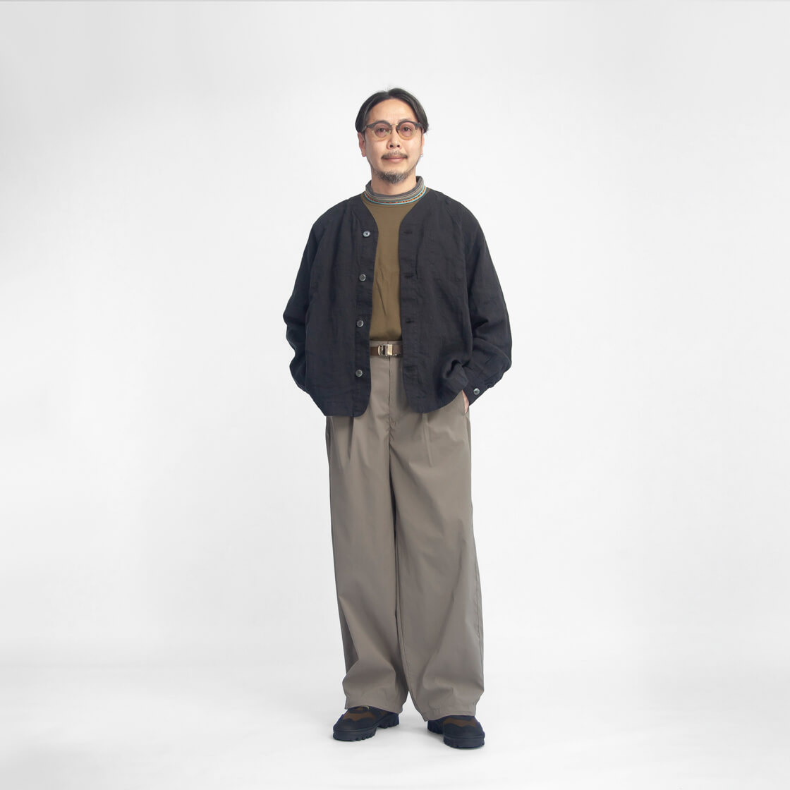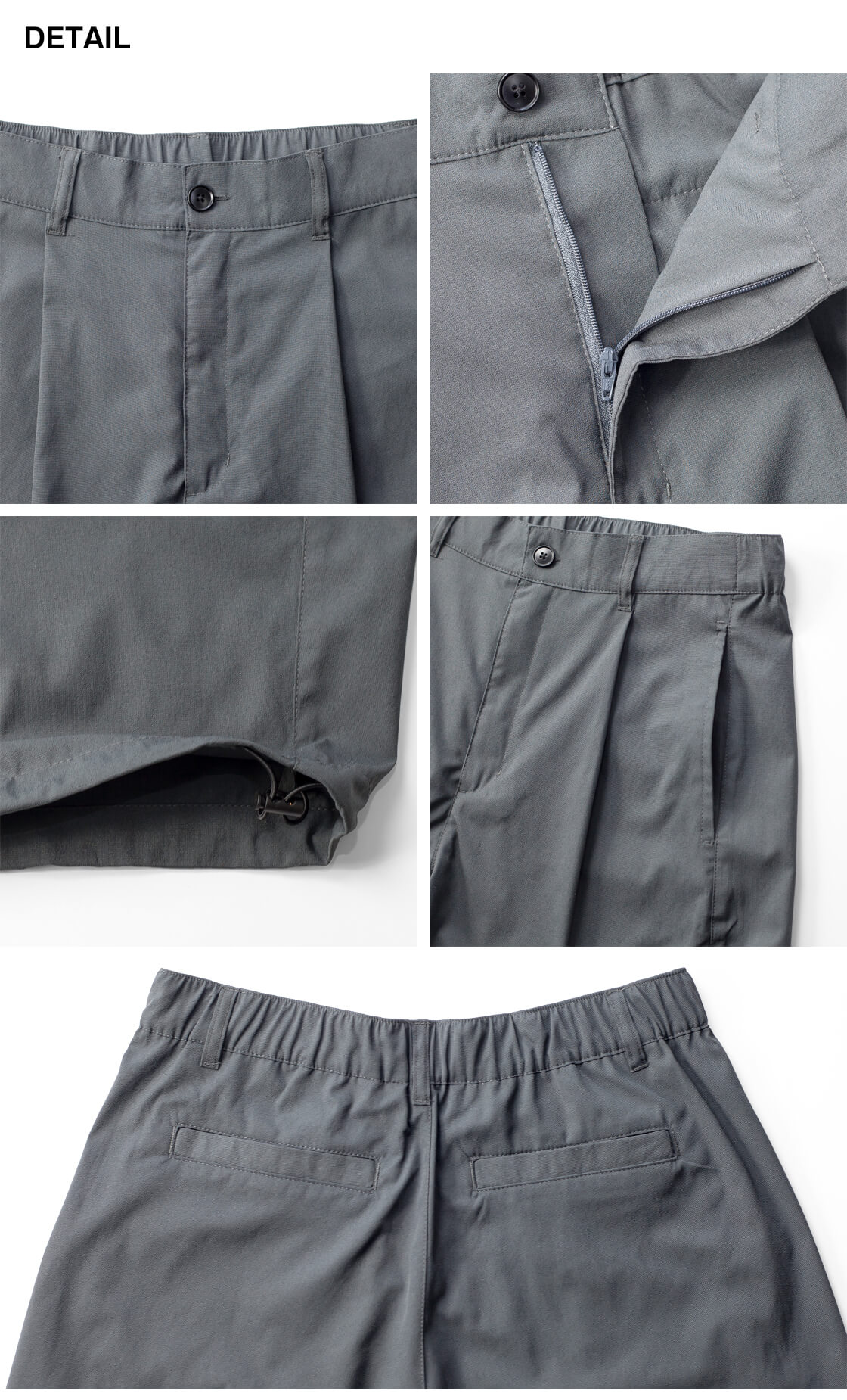 前開きファスナーやベルトループを備え、深めのワンタックやセミイージー仕様で動きやすさを確保。