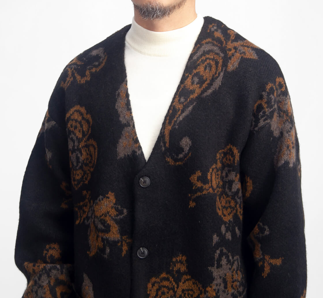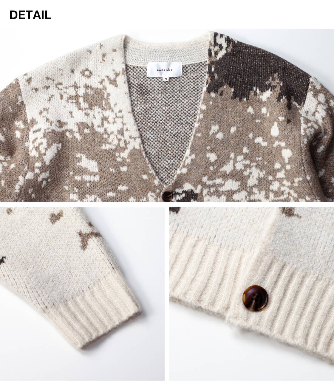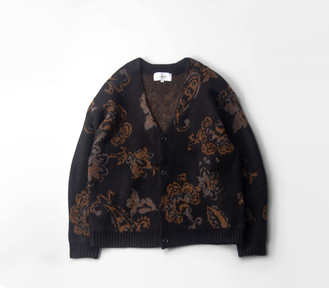 自社ブランドLAOTOURからレトロで存在感のある総柄が目を惹く、ダブルジャカードニットカーディガン。