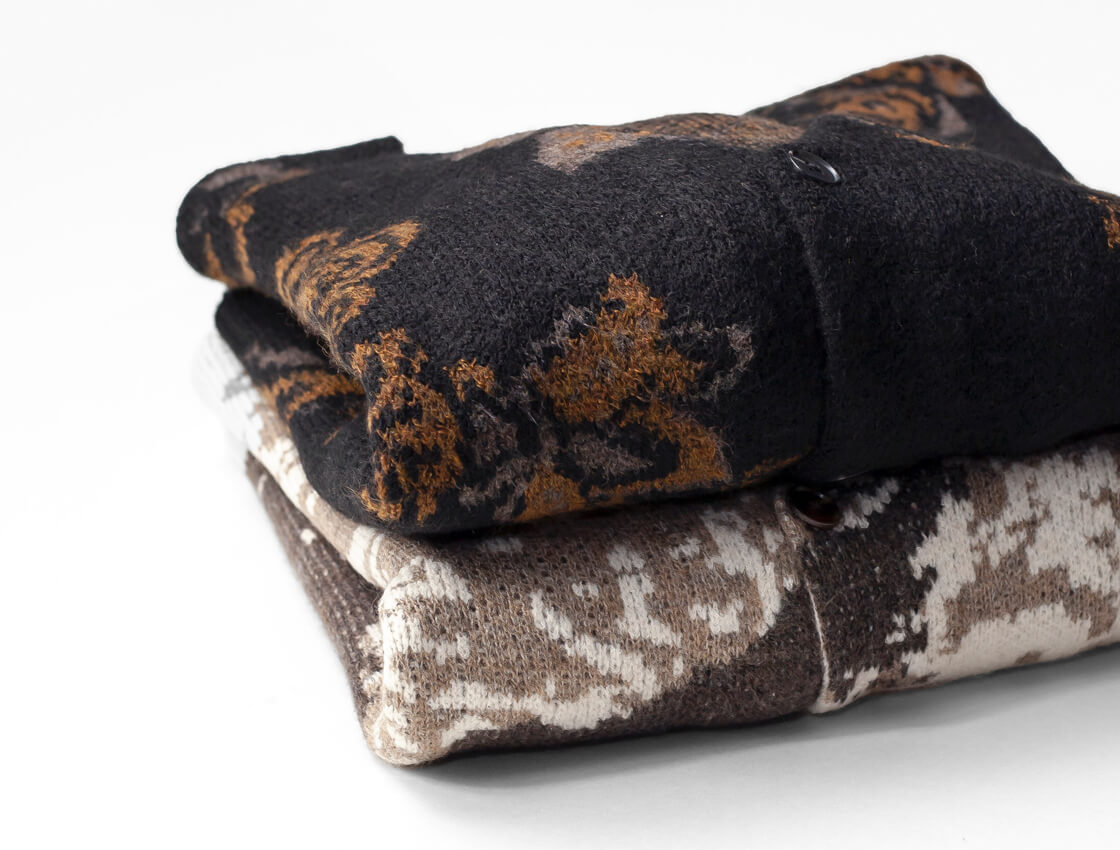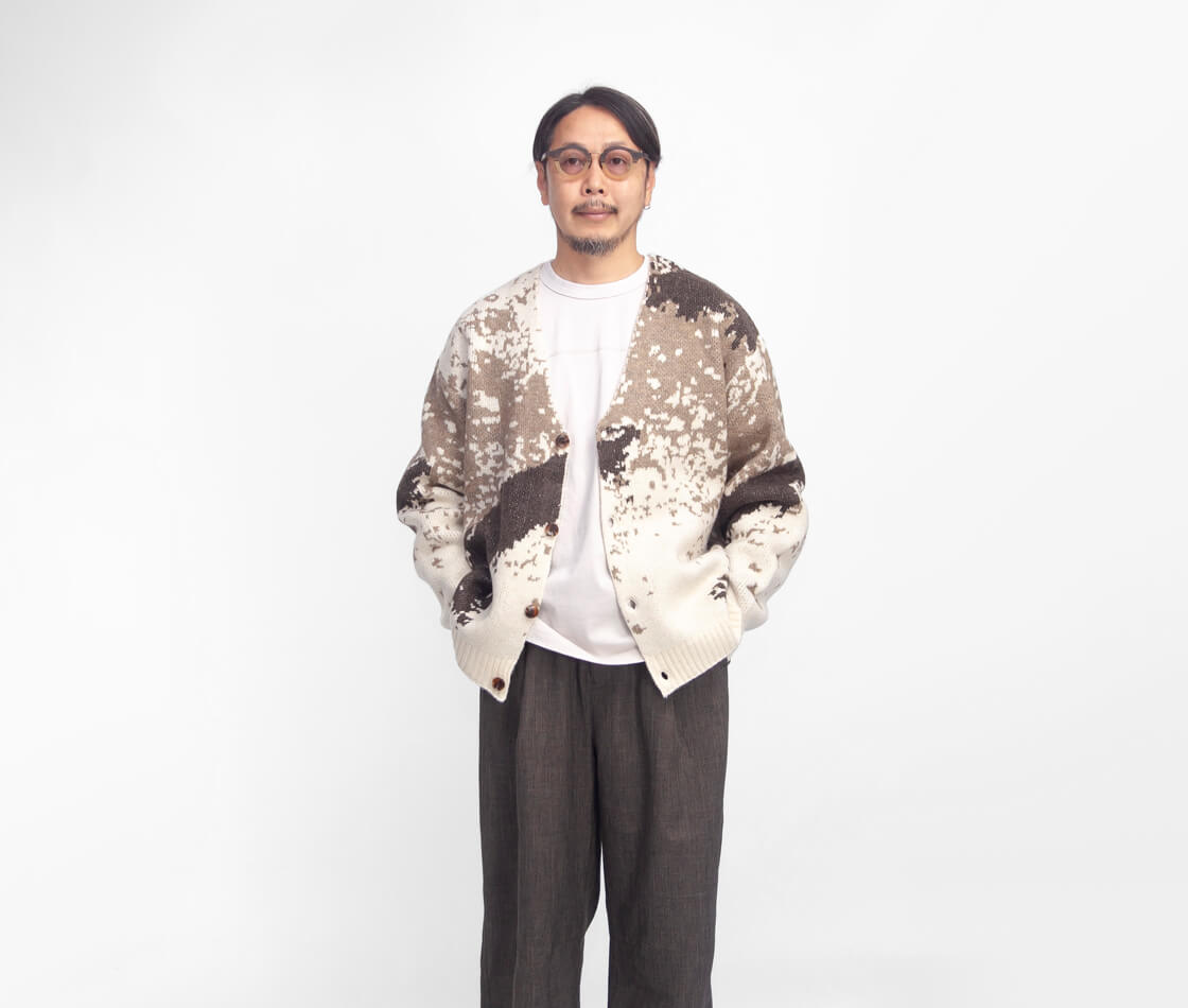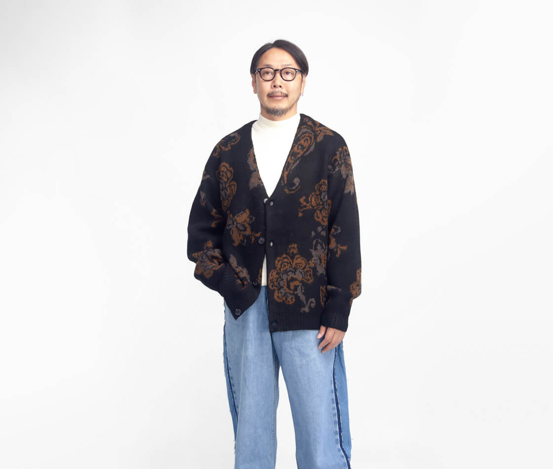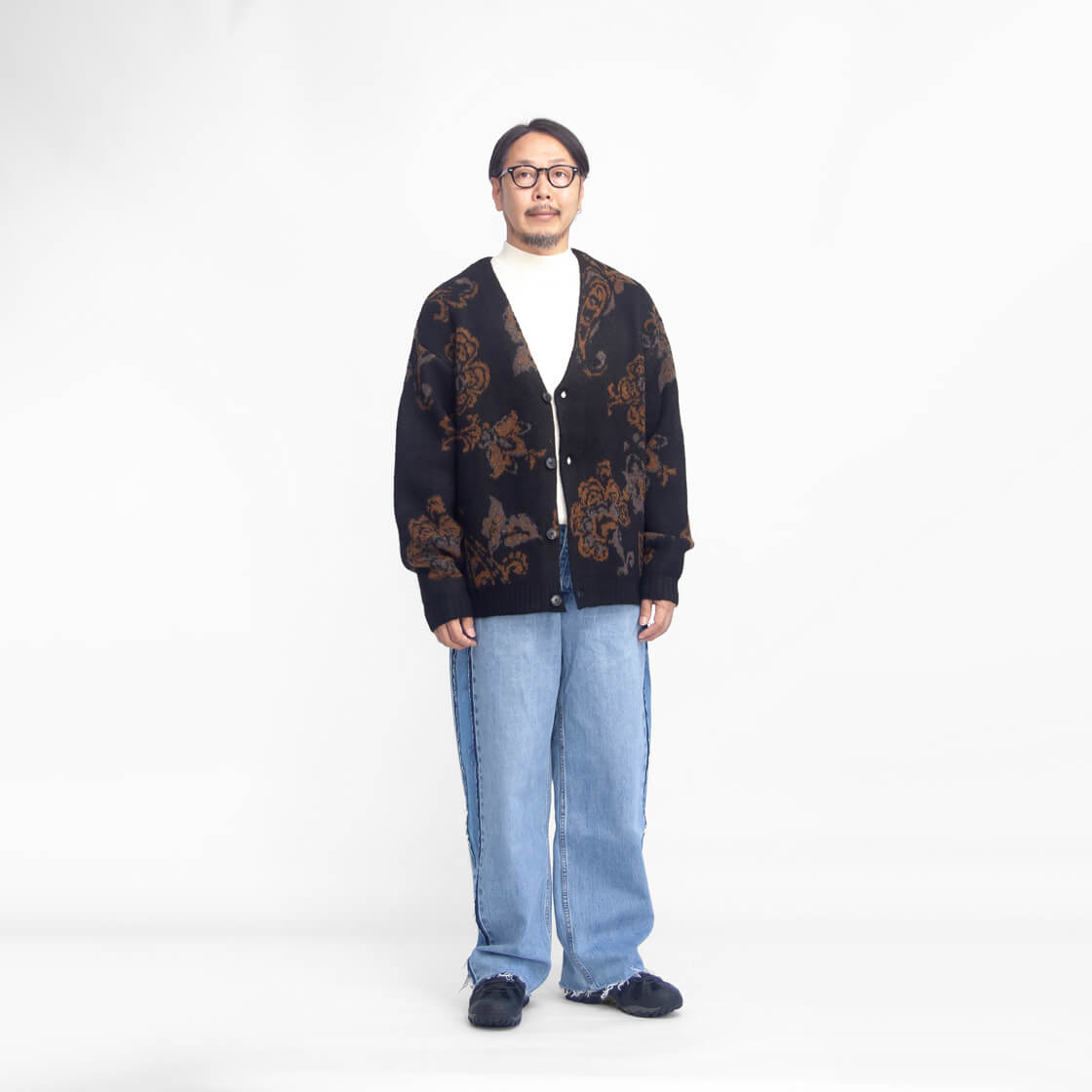 自社ブランドLAOTOURからレトロで存在感のある総柄が目を惹く、ダブルジャカードニットカーディガン。