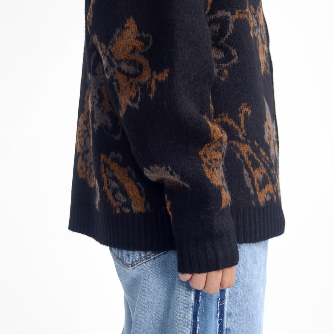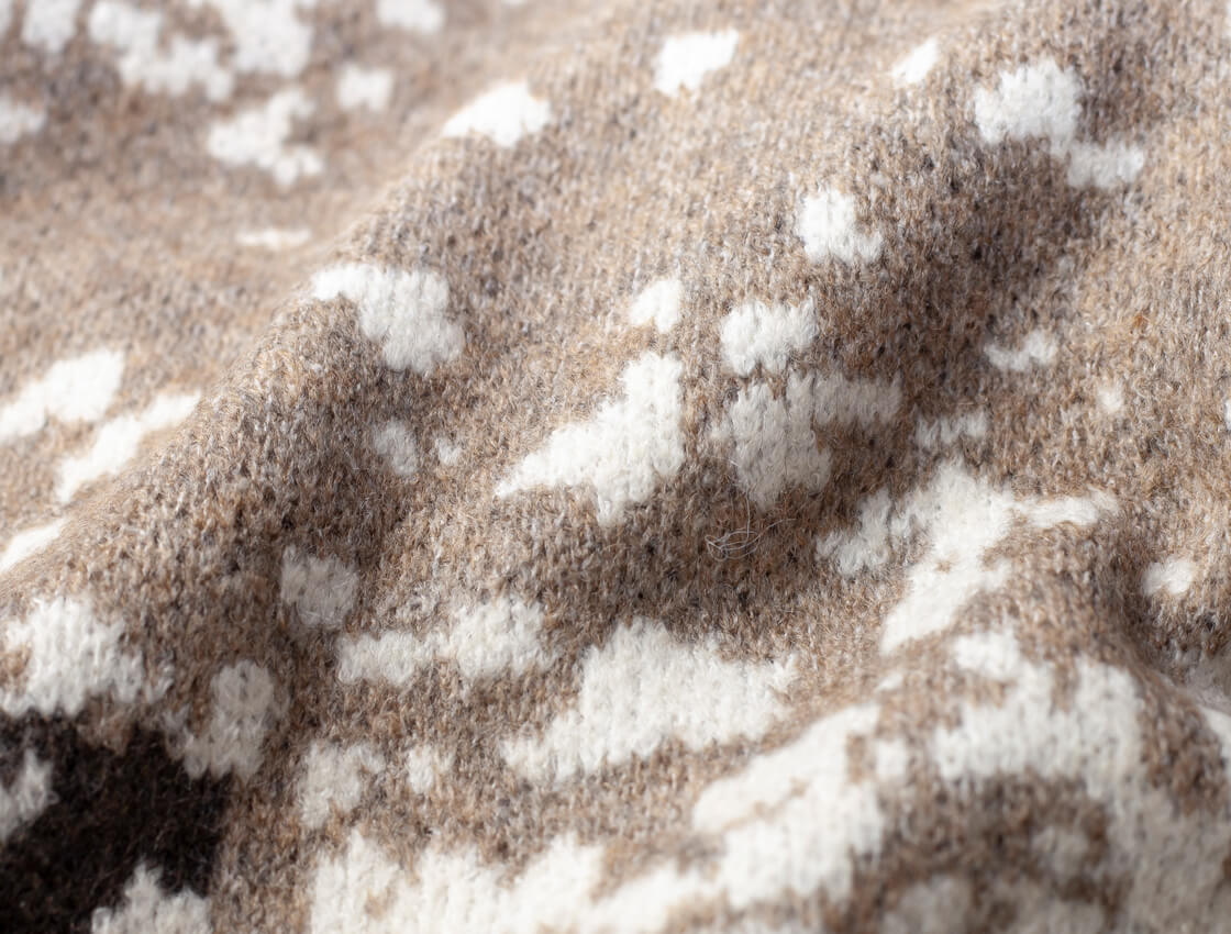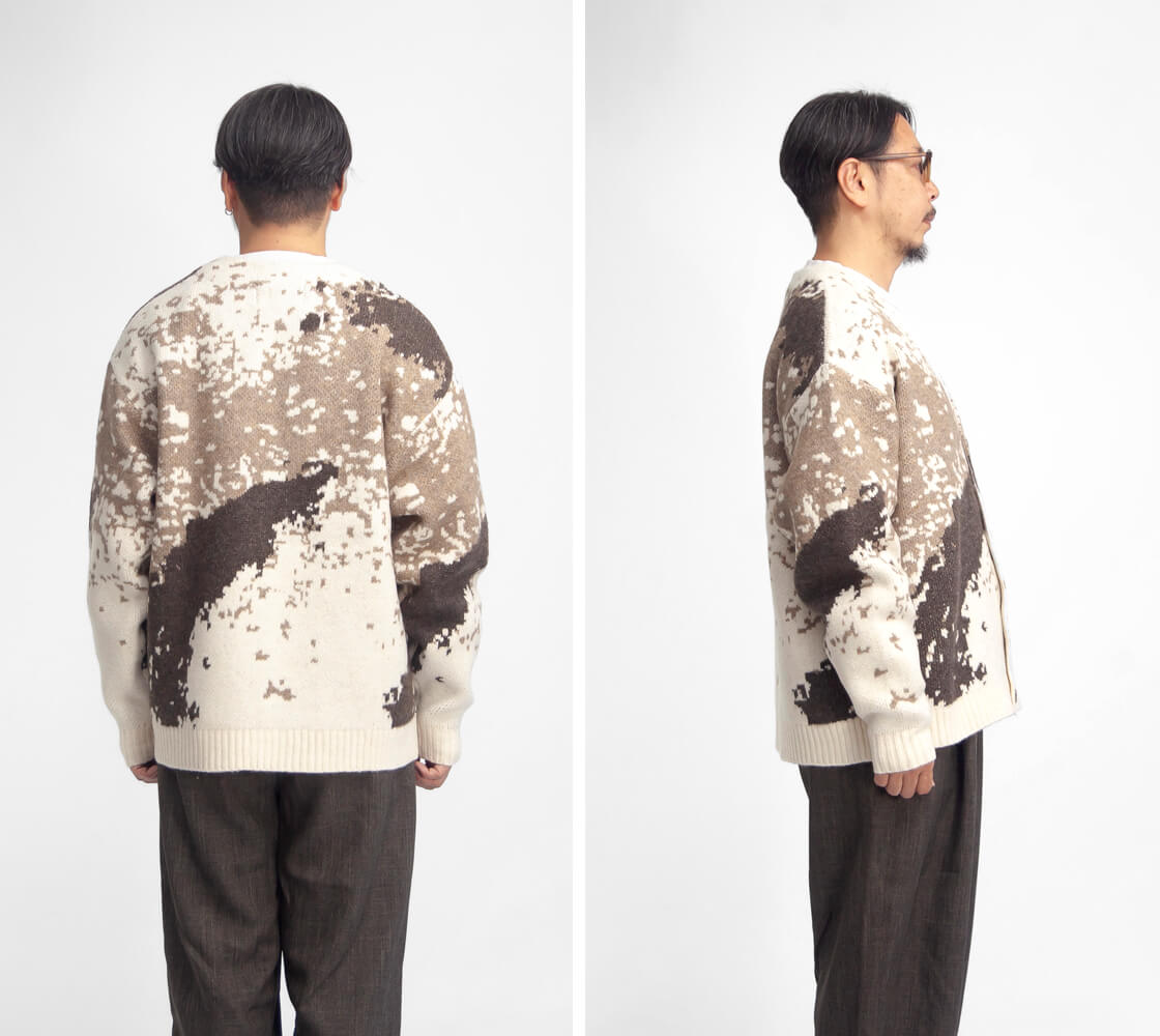 アンティークラグのような総柄を機械編みで表現し、ふんわりとしたモヘヤライクな風合いに仕上げた一着。