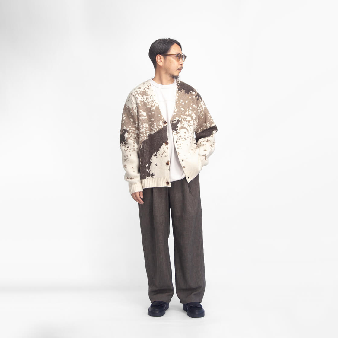![]() LAOTOUR - Double Jacquard Knit Cardigan ![]() 大胆な総柄のダブルジャカードニットカーディガン。モヘヤのような風合いにしっかり厚みがありながら軽い着用感で、存在感も抜群な一着です。 ![]() たっぷりルーズなシルエット、インにもアウトにも使いやすい大胆な柄。 機械編みで表現された、大胆な柄域が印象的なニットカーディガン。あるメーカーが持つ特別な編み柄をお借りして仕上げた一枚は、アンティークラグのようなレトロなムードが堪らない。モヘヤを表現したふんわりな表面感と、ゆったりとしたルーズシルエットが絶妙。一枚で主役になる存在感ながら、アウターのインナーに差しても洒落たアクセントをプラスしてくれます。シャツやカットソーに軽く羽織るだけで、雰囲気のあるスタイリングが完成です。 ![]() しっかり厚みがあるのに軽い着心地のダブルジャカードニット。 ![]() モヘヤの様なふんわり表面感、存在感がありながらデイリーに使いやすいニット地。 このレトロで大胆な柄はジャカード編みによるもの。7ゲージで裏の組織が後ろ鹿の子になった、表裏二重の編み組織を持つダブルジャカードと呼ばれる編地なのですが、しっかりと厚みがありながら重い着用感ではありません。それはアクリル・ポリエステル・ポリウレタンを掛け合わせた編み立てのため。ウールライクな柔らかさとふっくらとした暖かみを持ちながらも、軽くてシワになりにくい扱いやすい組成です。モヘヤを表現したふんわりな表面感に、ポリウレタンによるもっちりしたキックバック・伸縮性にも優れ、動きやすく快適な着心地。見た目にも存在感がありながら、デイリーに使いやすいバランスの取れたニット地です。 ![]() ![]() 身長170cm、体重62kgの男性がMサイズ着用。