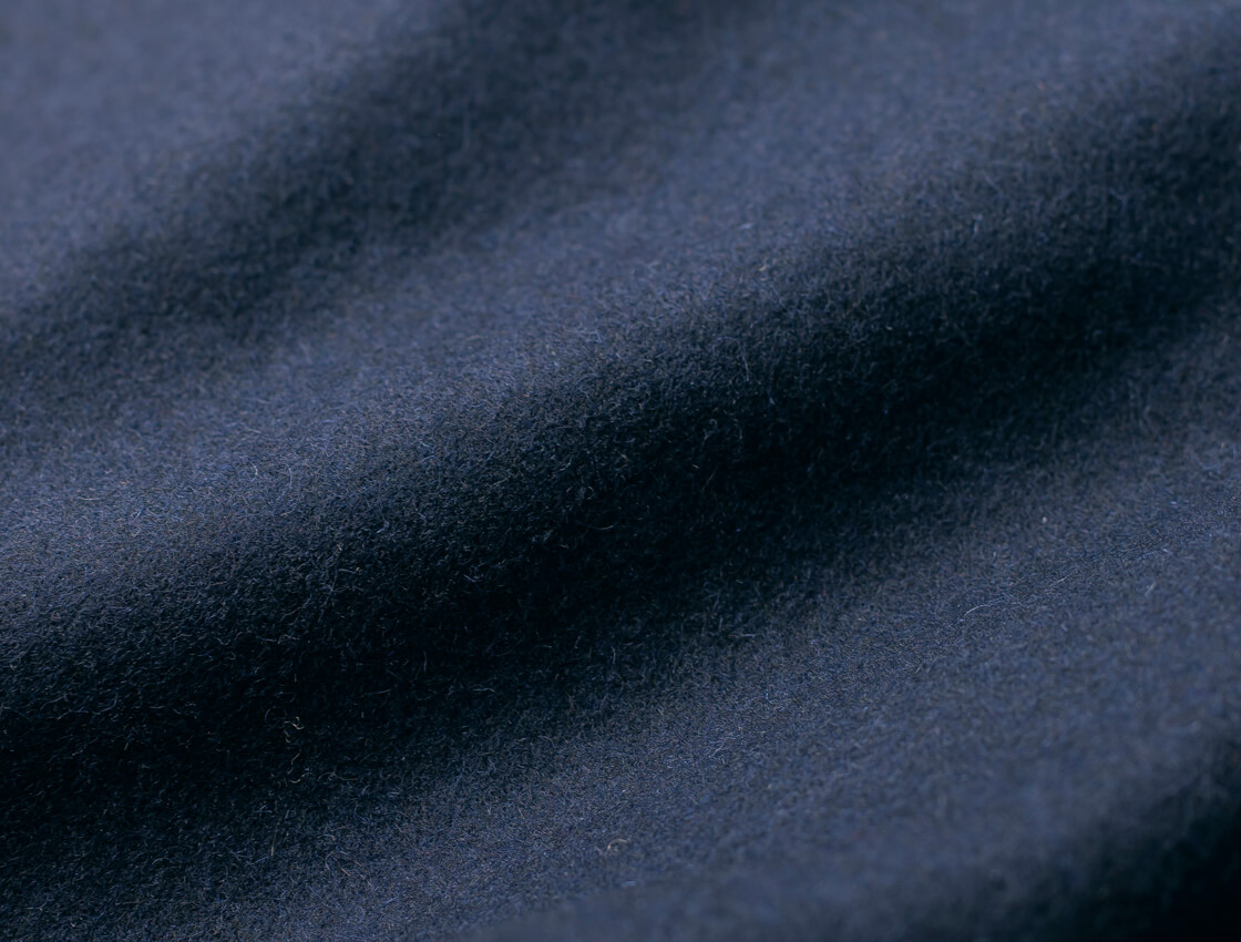 身頃はウール×ポリエステルのメルトンで軽さと耐久性を両立し、袖はシボ感のあるカウレザーで重厚感を演出。