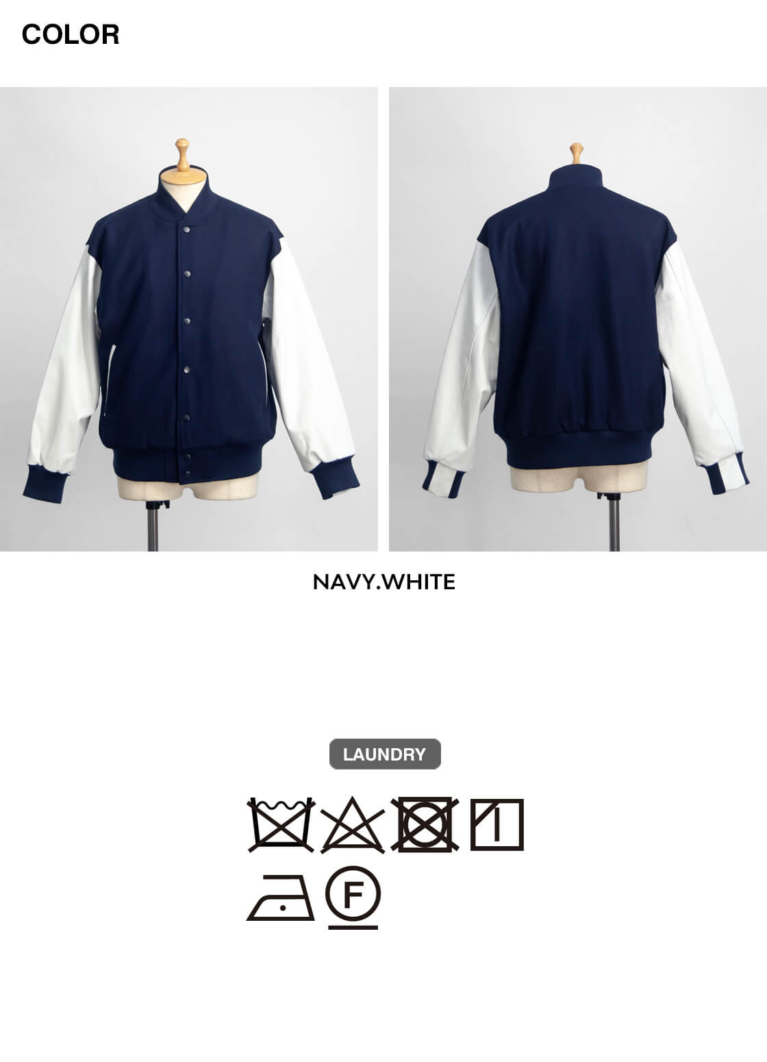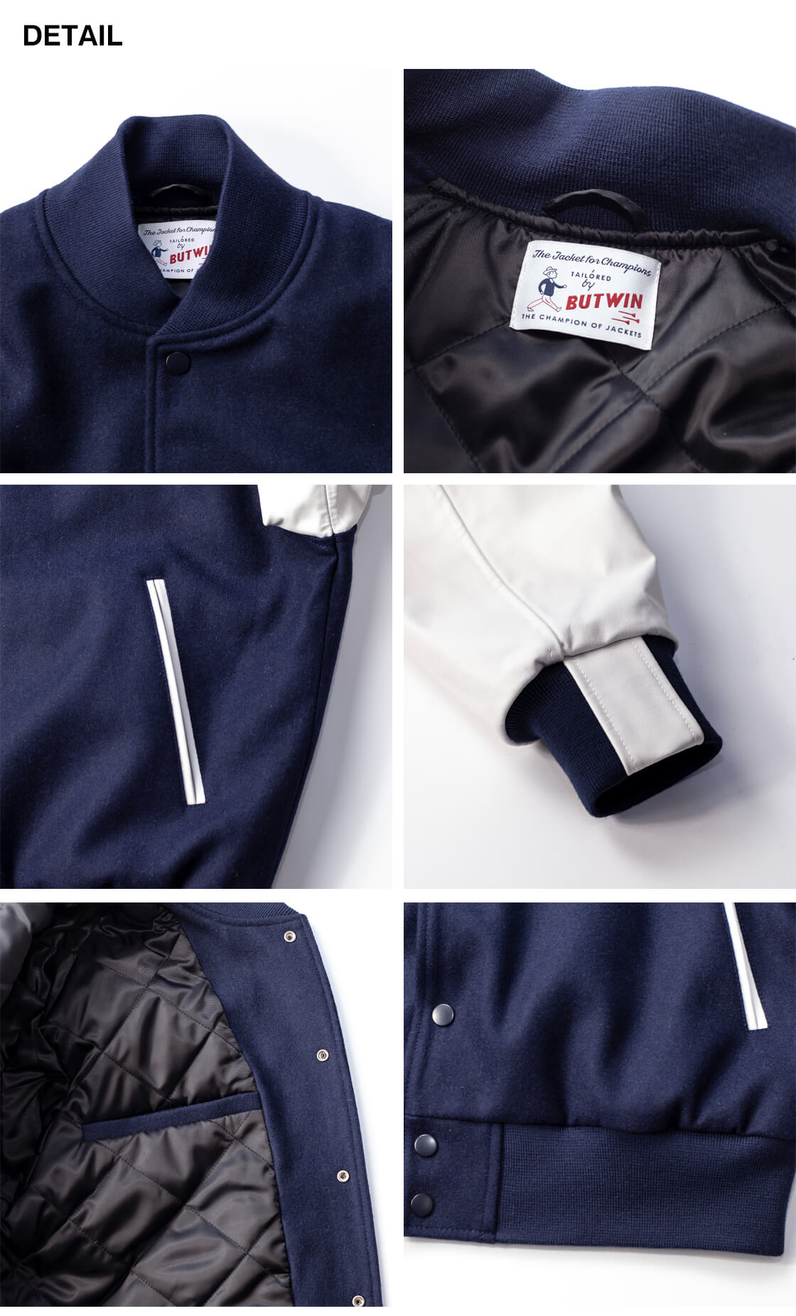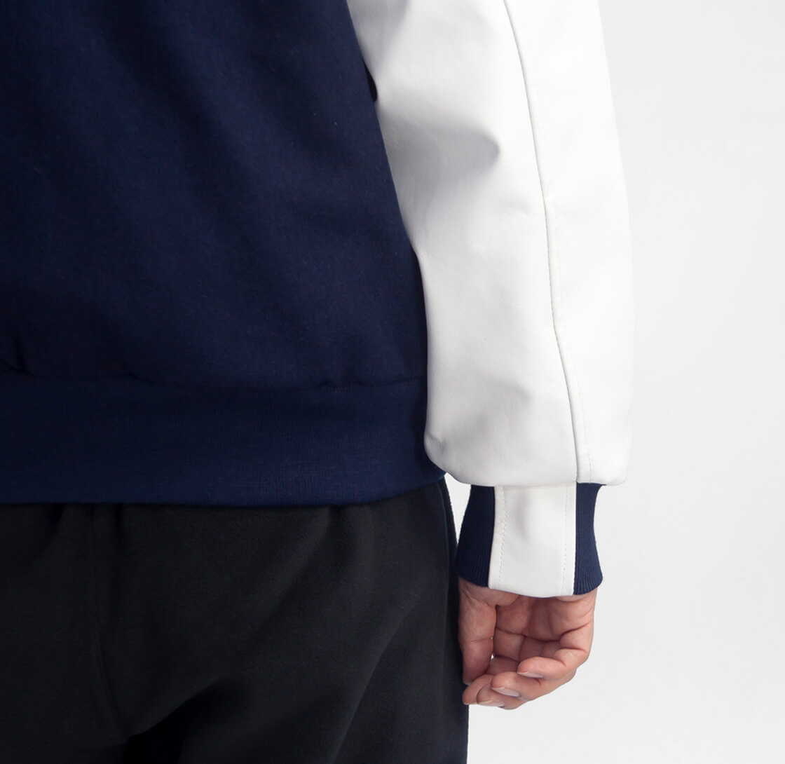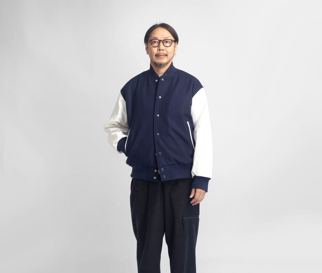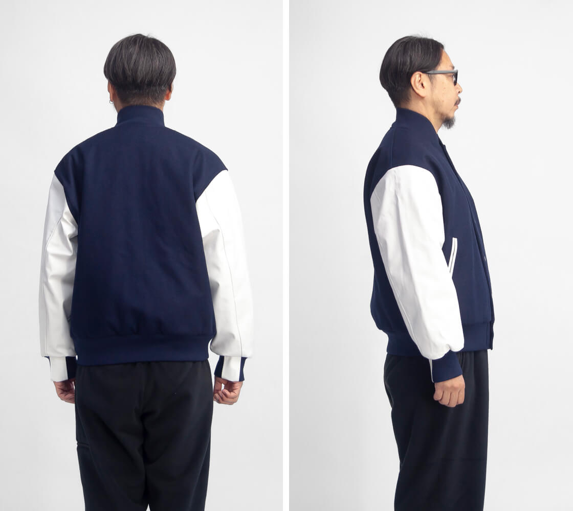 スタジャンの元祖として知られるBUTWINに別注し、深みのあるネイビーメルトンに白レザー袖を合わせた王道配色で上品に仕上げています。